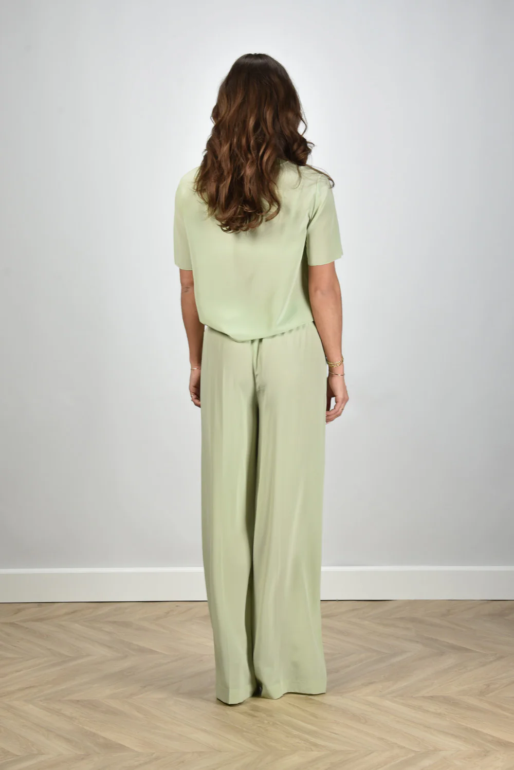 De top Rubin van Joseph is zo’n item dat meteen opvalt door zijn pure eenvoud. De zijde voelt soepel en licht aan op de huid, met een subtiele glans die de matcha-tint mooi tot leven brengt. De ronde hals en korte mouwen houden het silhouet rustig en verzorgd. Door de rechte snit valt de top mooi los zonder te wijd te zijn. Combineer hem voor een gestroomlijnde look met de Joseph broek Hulin in dezelfde matcha-kleur. De kwaliteit van Joseph zie je in elk detail: een cleane afwerking en een zorgvuldig gevormde pasvorm die compleet voelt.