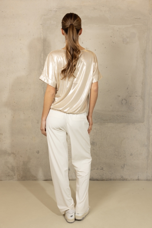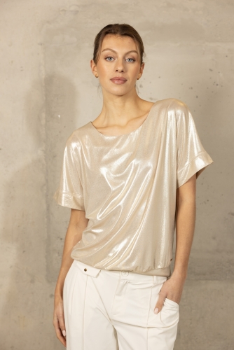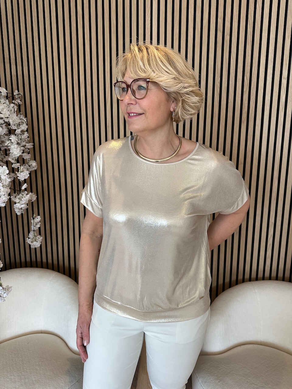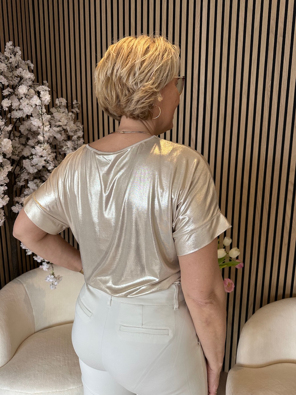 Voeg een vleugje glamour toe aan je lente- en zomergarderobe met de Emelie Top, verkrijgbaar in de kleuren Sand en Aqua. Deze stijlvolle top is gemaakt van shine stof en heeft een moderne uitstraling. De korte mouwen en de losse pasvorm met draperende details aan de voorkant maken het een veelzijdig item dat eenvoudig te combineren is met verschillende items uit onze collectie.