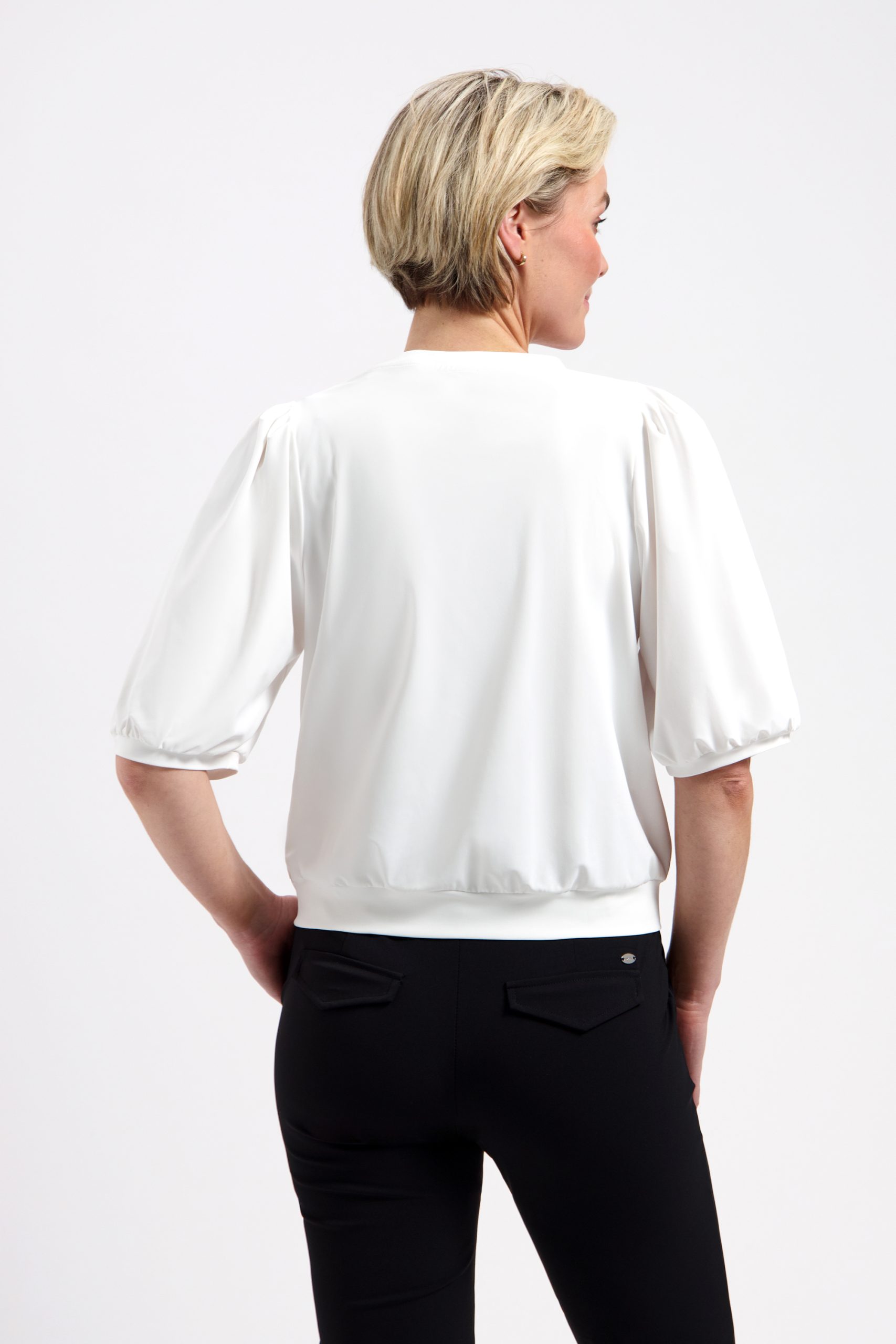 De ronde hals en de subtiel geplooide mouwen geven deze witte top een moderne en verfijnde touch. De zachte witte kleur maakt dit item een echte essential in je garderobe en zorgt ervoor dat je eindeloos kunt combineren. Draag de Amie Top met een bijpassende Lady Day travelstof broek voor een stijlvolle set of combineer met een jeans voor een casual, maar verzorgde look.