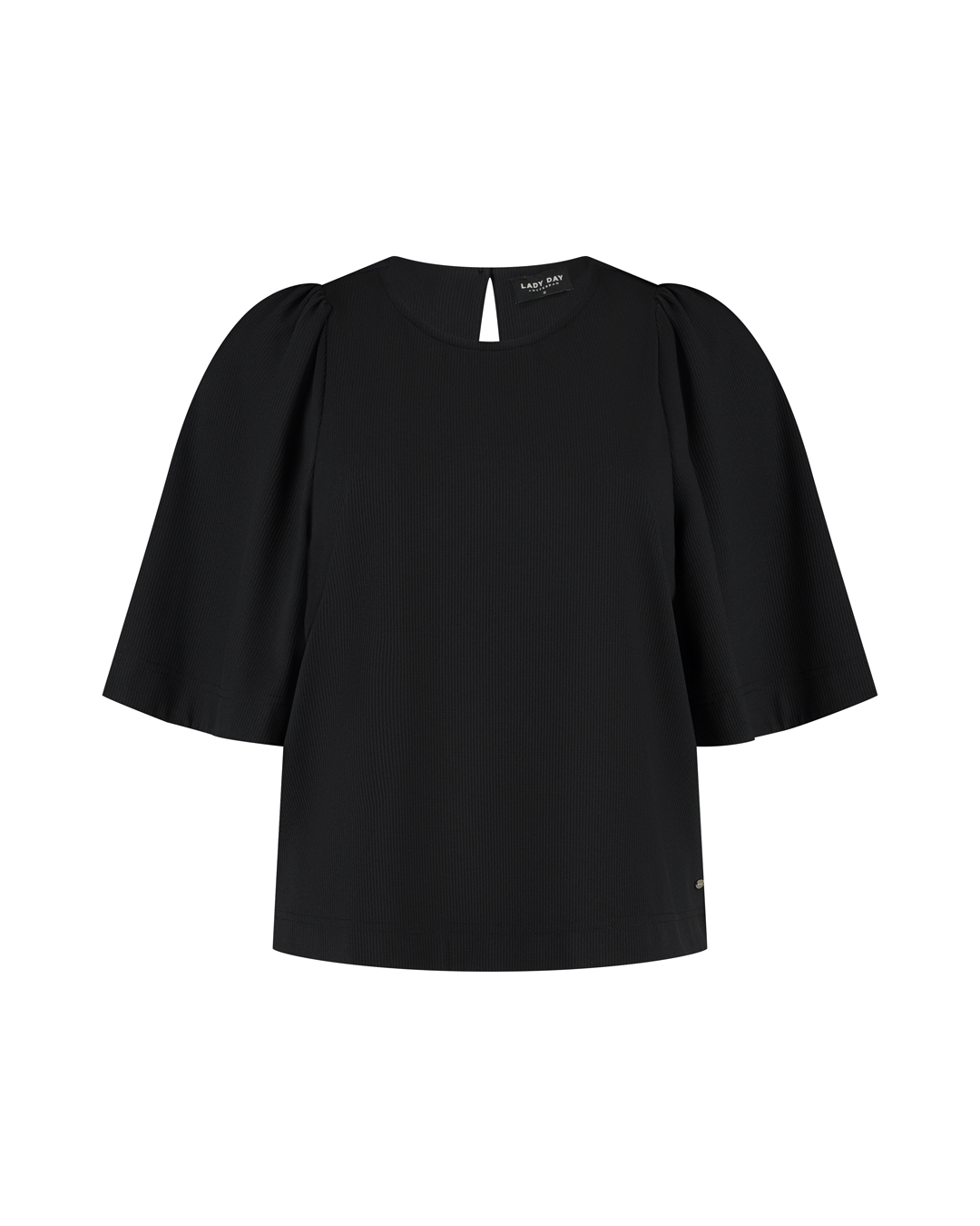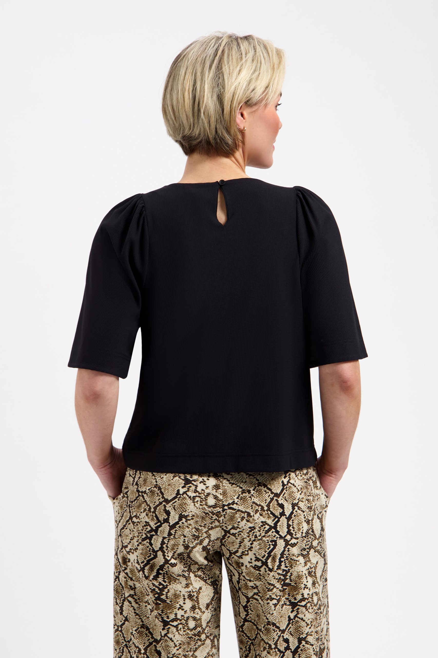 De ronde hals en de wijder vallende mouwen geven deze zwarte blouse een moderne en verfijnde uitstraling. De subtiele knoopsluiting aan de achterzijde zorgt voor een elegante afwerking. De tijdloze zwarte kleur maakt dit item een echte essential die je eindeloos kunt combineren.