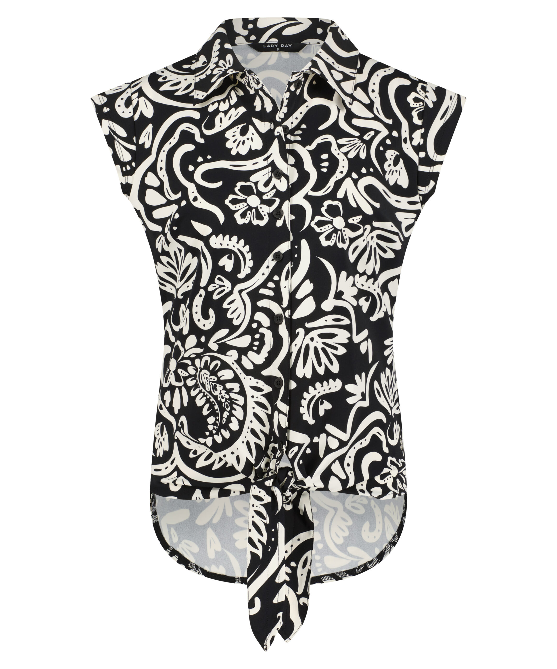 De blouse Biba heeft een knoopsluiting met aan de onderkant een strik. Het is een getailleerde blouse met korte mouwen en heeft een normale kraag.