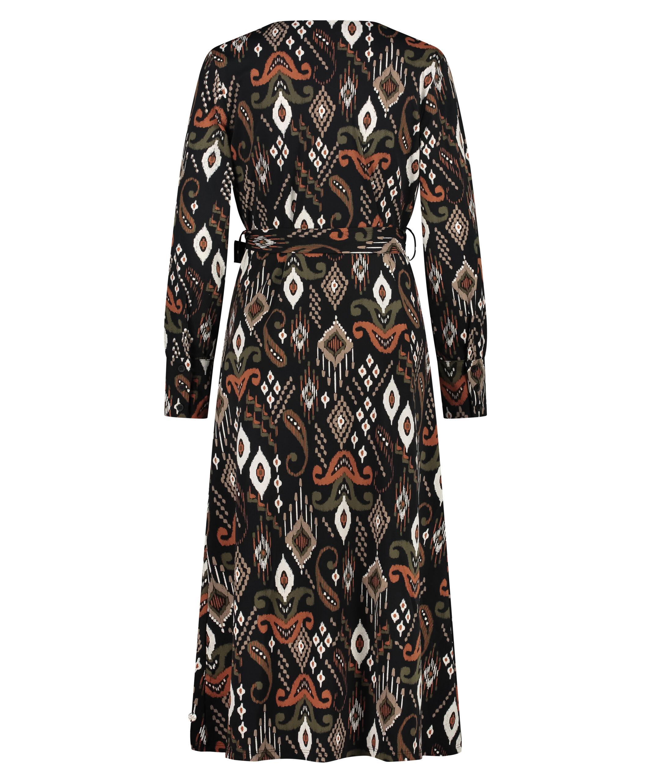 De jurk Delilah is een lange overslag jurk gemaakt van Travelstof. De jurk heeft een kraag met v hals en een strikceintuur bij de taille. Het item heeft een lange manchet met knopen en valt goed op maat.