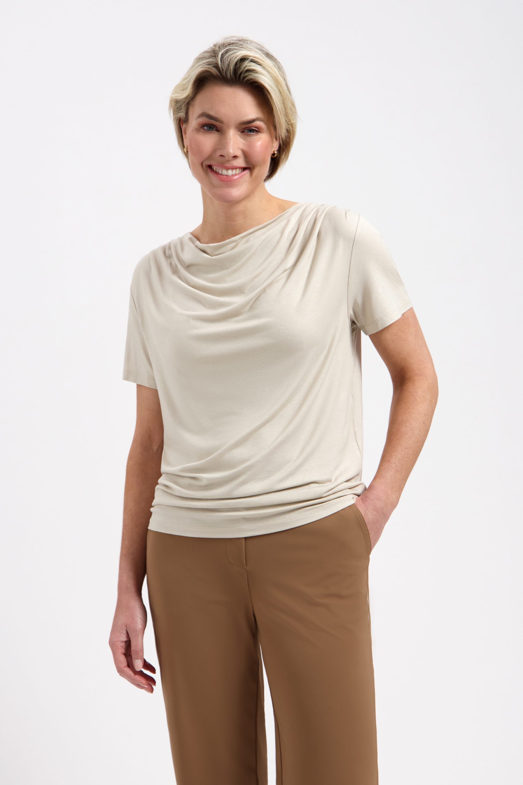 De stijlvolle watervalhals geeft dit item een verfijnde en flatterende uitstraling. De subtiele plooival aan de voorzijde zorgt voor een speels, vrouwelijk effect dat je look direct net dat beetje extra geeft. De tijdloze sand kleur maakt deze top eindeloos te combineren – van chic tot casual. Draag de Drew Top met een nette broek voor een elegante outfit of combineer met een jeans voor een meer ontspannen maar verzorgde look.