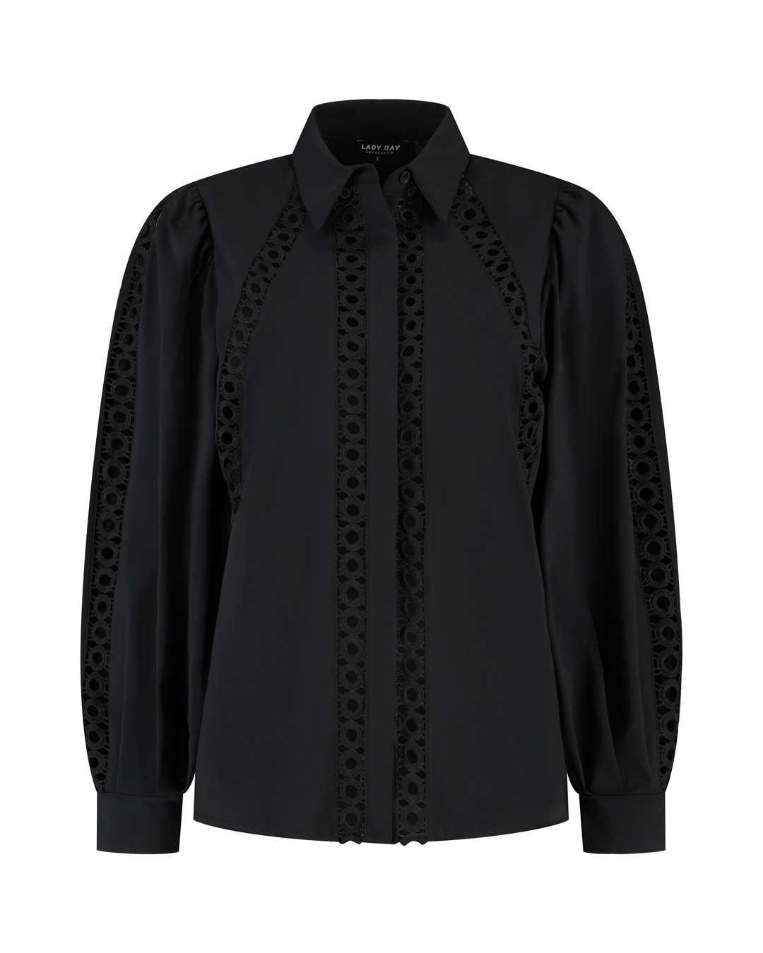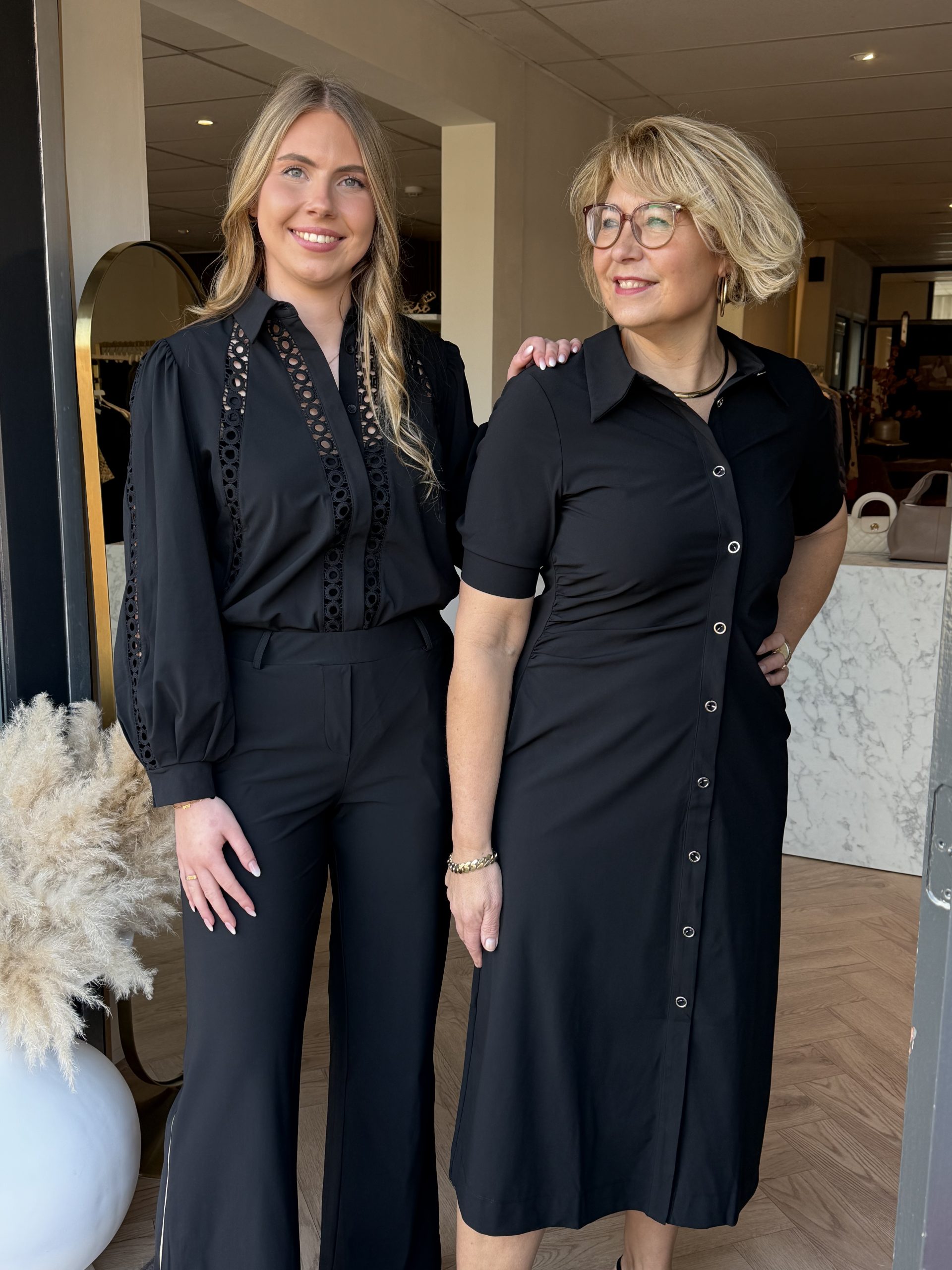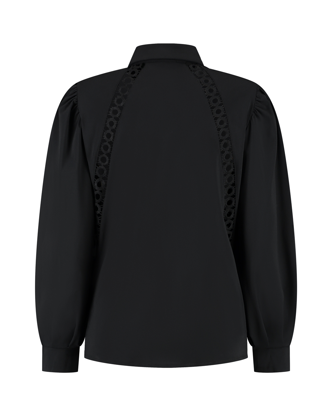 De verfijnde details langs de voorzijde en mouwen geven deze zwarte blouse een elegante en moderne touch. De klassieke kraag en knoopsluiting zorgen voor een tijdloze uitstraling, waardoor dit item zowel zakelijk als casual perfect te dragen is. De diepe zwarte kleur maakt de Emmeline Blouse een veelzijdige toevoeging aan je garderobe.