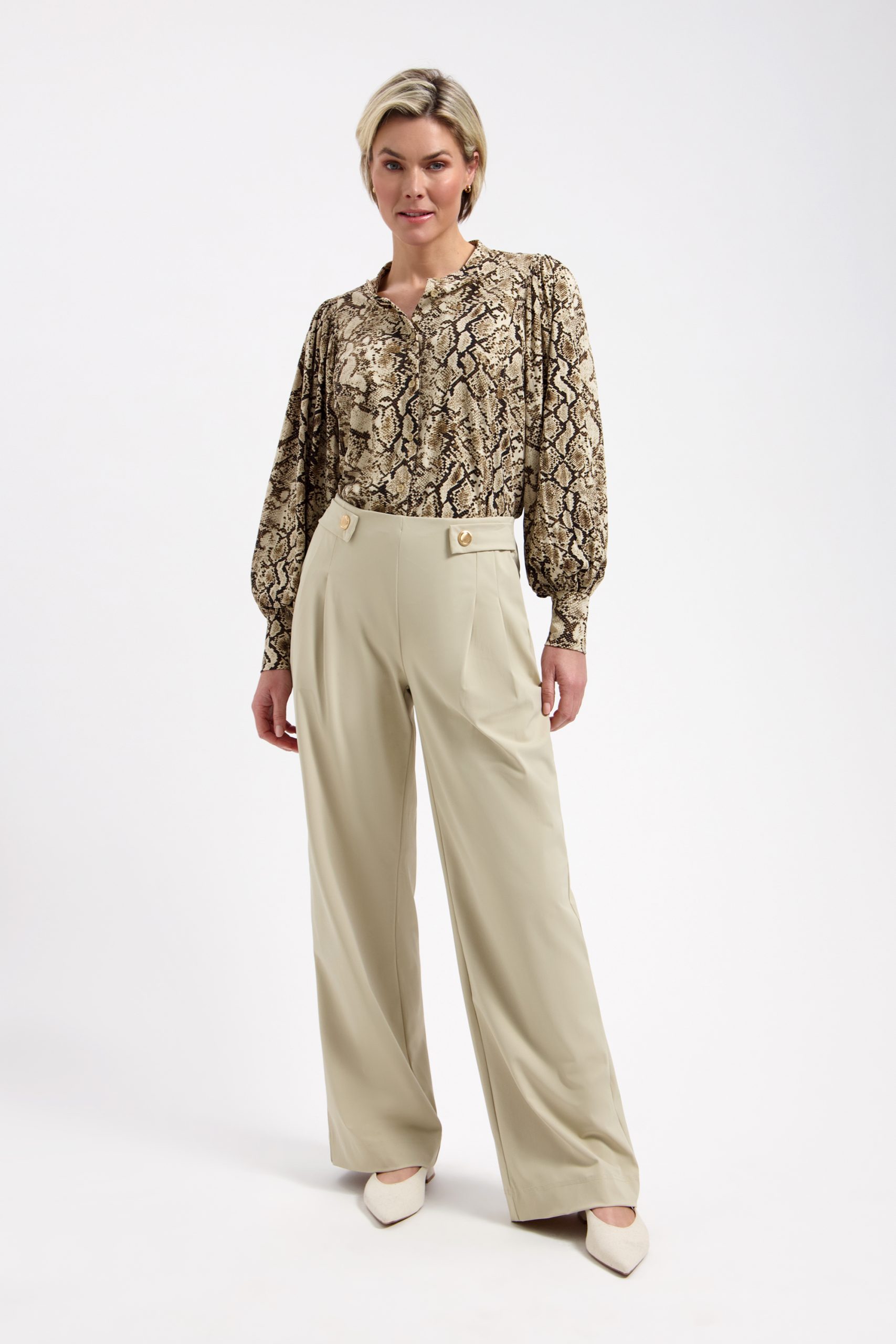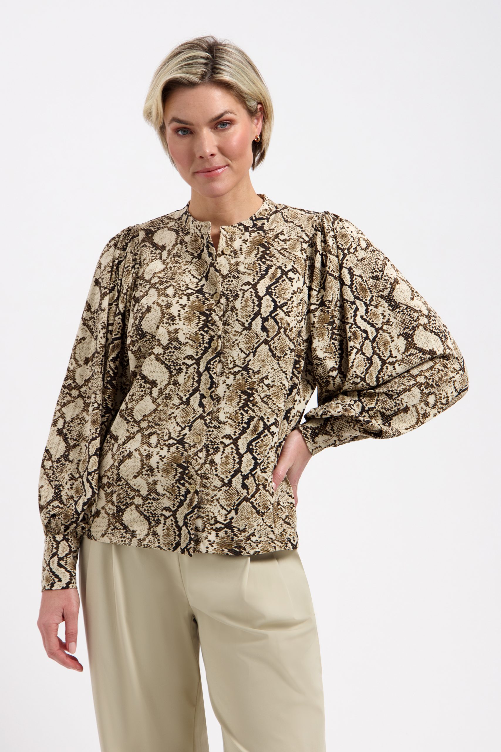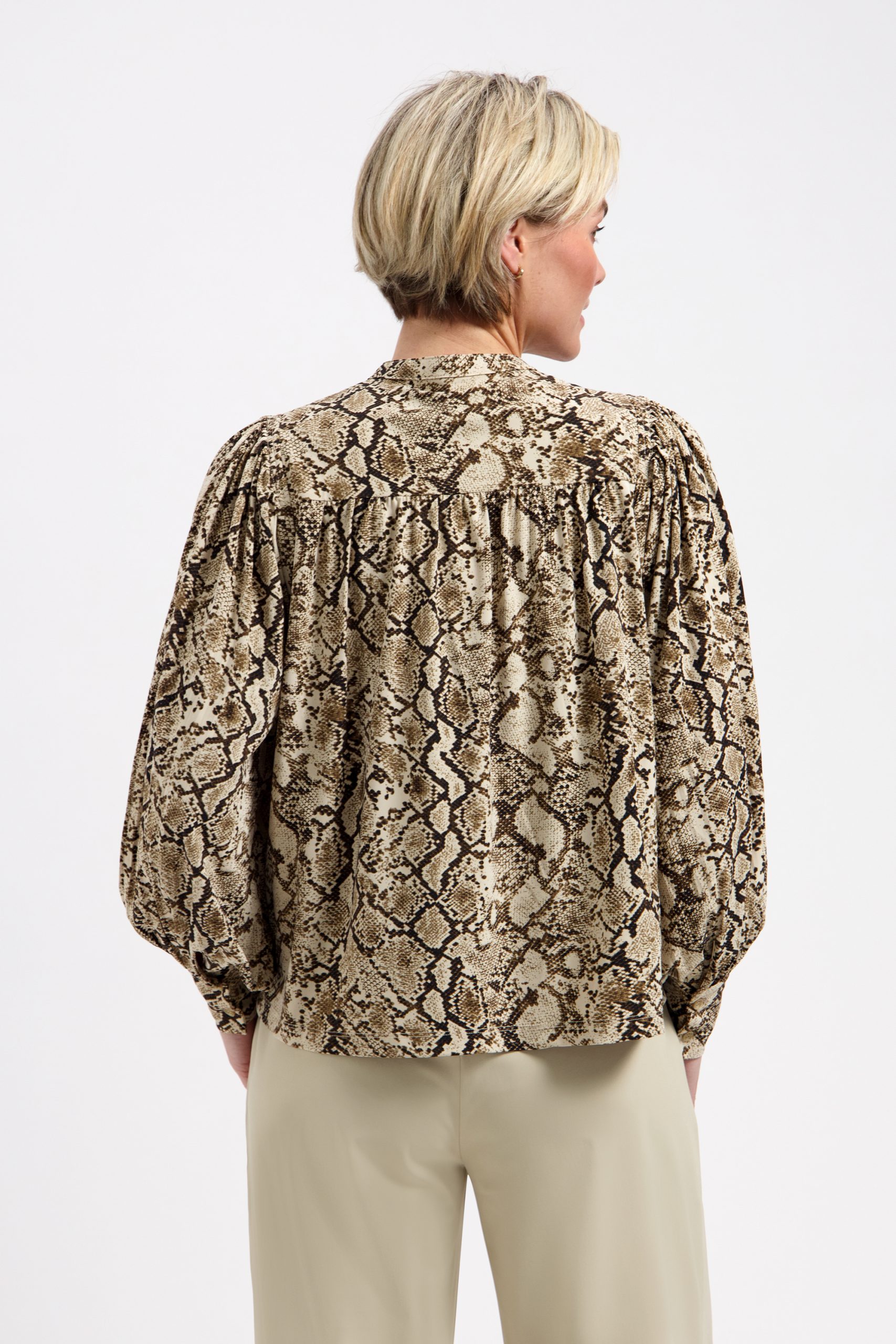 De warme bruintinten in de snake print geven je outfit direct een krachtige en modieuze uitstraling. De vrouwelijke pasvorm zorgt ervoor dat de blouse mooi aansluit zonder strak te zitten. Draag hem met een effen travelstof broek voor een stijlvolle set of combineer met een jeans voor een meer casual look. Perfect voor werk, een diner of een dag waarop je net dat beetje extra wilt uitstralen.