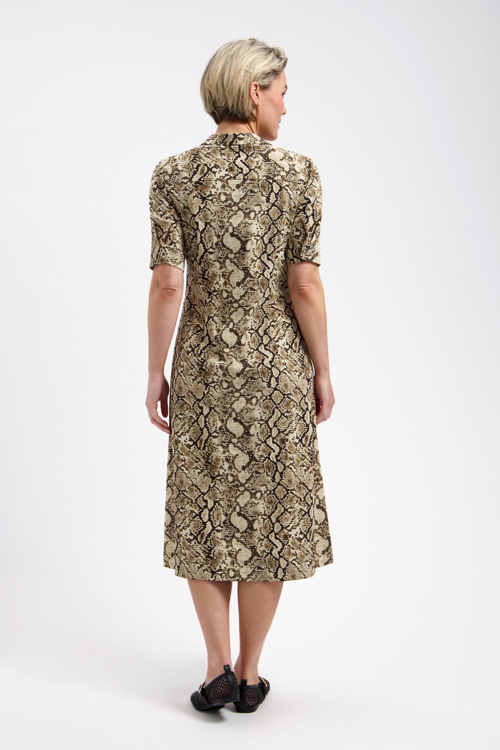 De snake print in warme bruintinten geeft deze jurk een modieuze en zelfverzekerde look. De licht getailleerde pasvorm zorgt voor een mooi silhouet zonder in te leveren op comfort. De kraag en knoopsluiting geven de jurk een elegante touch, waardoor je hem zowel casual als gekleed kunt dragen.