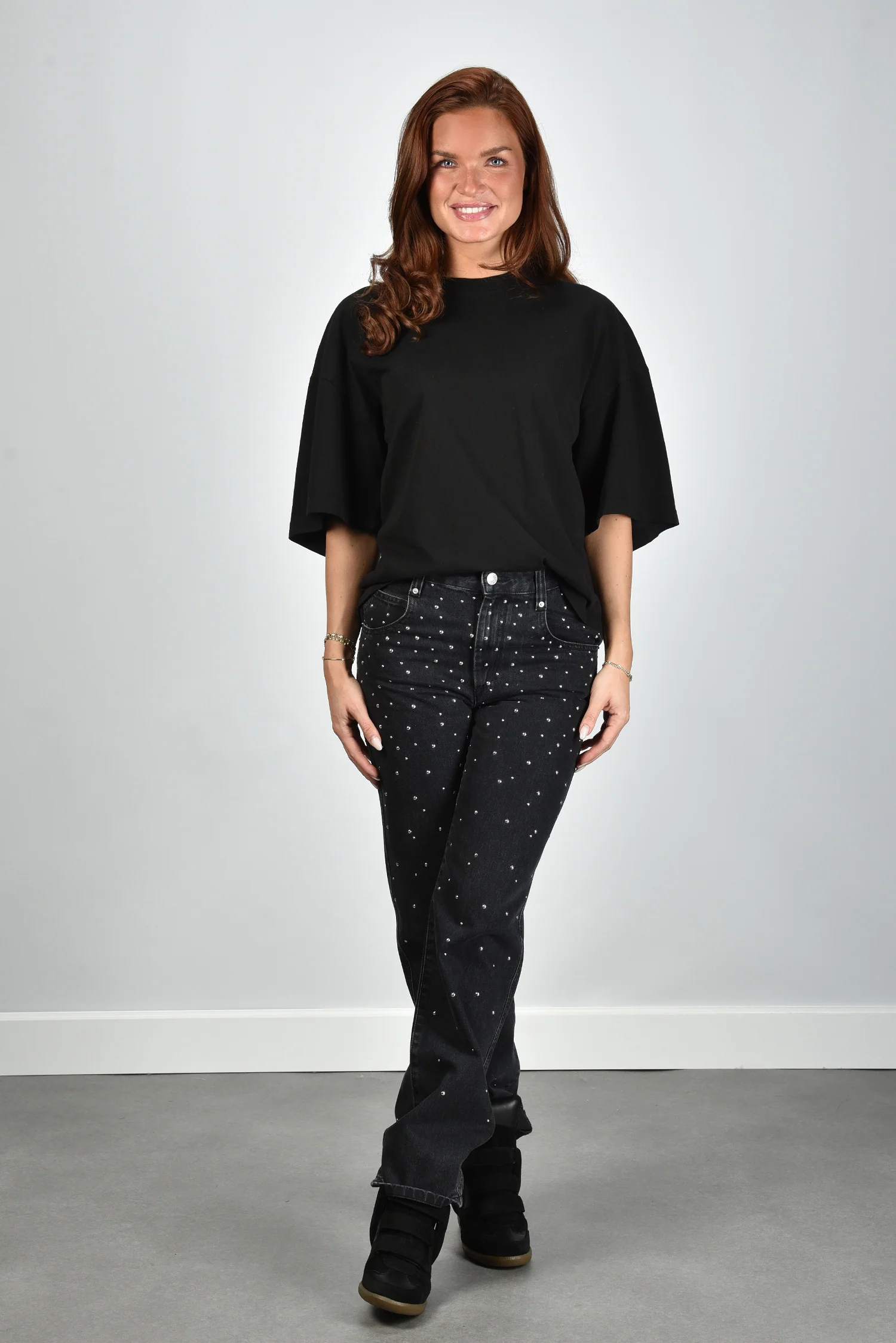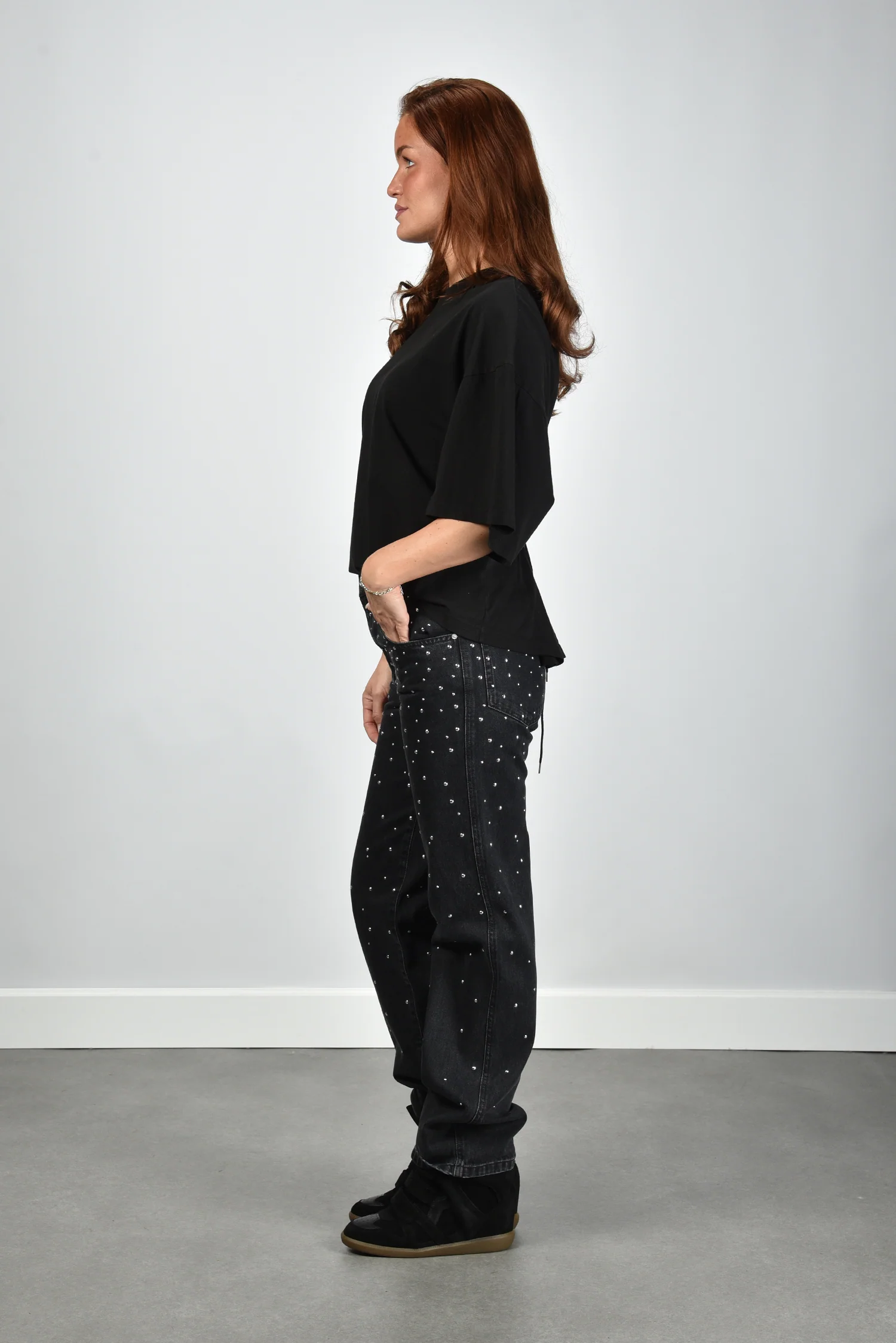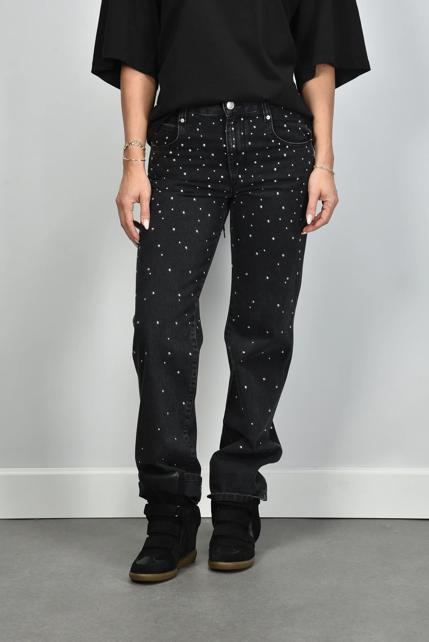 De jeans Brinsa black van Marant Etoile is een opvallend item met subtiele glans. De diepzwarte denim is bezaaid met kleine studs die het licht mooi vangen, zonder dat het te veel wordt. De rechte, iets wijdere pijp geeft de broek een ontspannen vorm. Gemaakt van 100 procent katoen, voelt de stof stevig en authentiek aan. Let op: deze jeans valt een maat kleiner. Combineer de Brinsa met de Marant Etoile trui Riseda voor een moderne gelaagde look met een vleugje Parijse flair, precies zoals het merk bekendstaat.