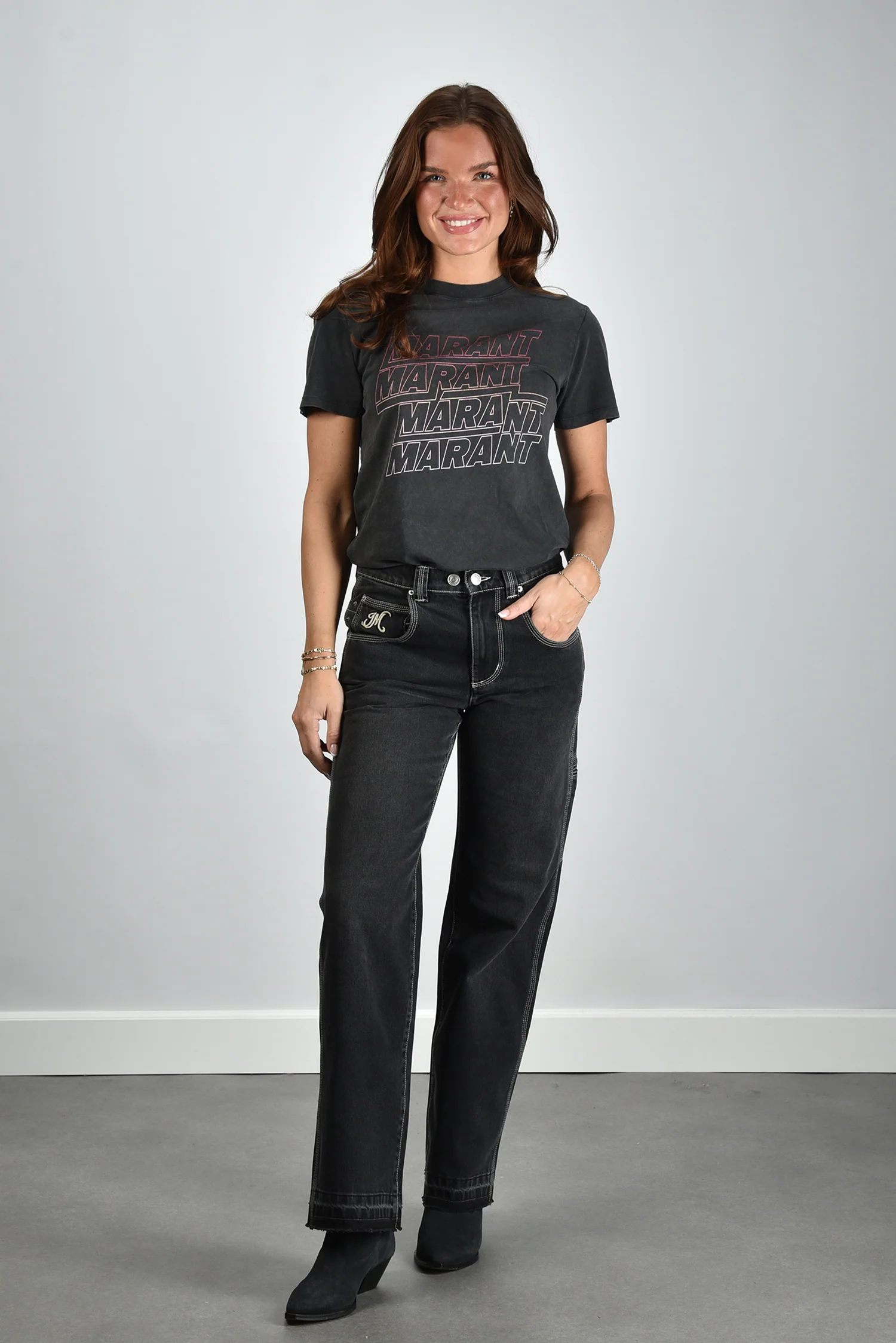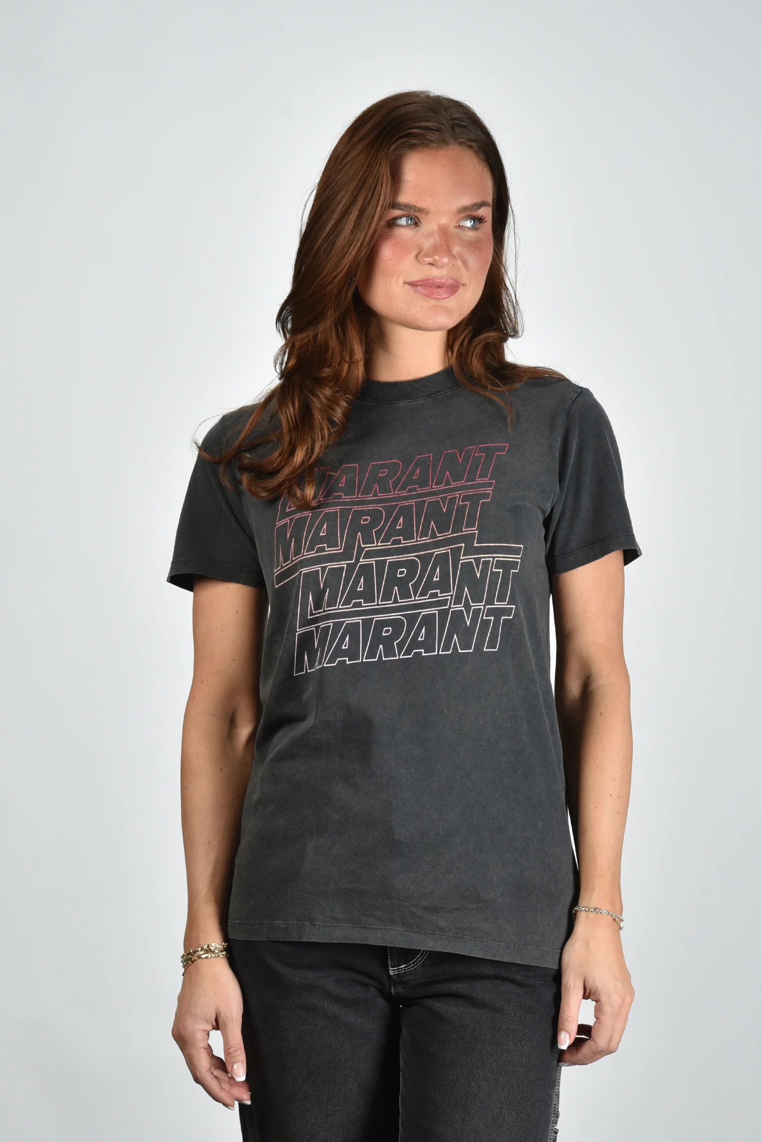 Het t-shirt Zoeline van Marant Etoile voelt meteen prettig aan. Het is gemaakt van 100% katoen met een zachte, licht verweerde offblack tint. De herhaling van het woord MARANT in gekleurde contourletters geeft het een speelse, grafische touch. De korte mouw en ronde halslijn zorgen voor een casual pasvorm die aansluit zonder strak te zitten. Combineer dit shirt met de Isabel Marant jeans Jeyda voor een ontspannen, maar doordachte look met de kenmerkende Parijse nonchalance van Marant Etoile.