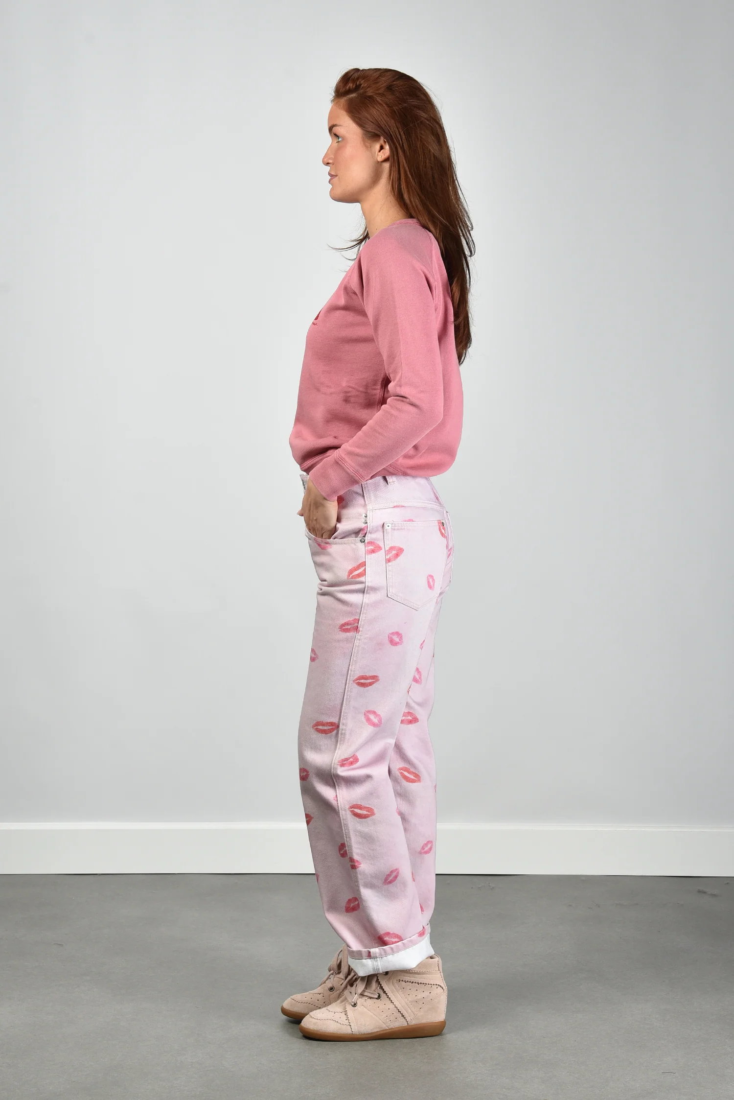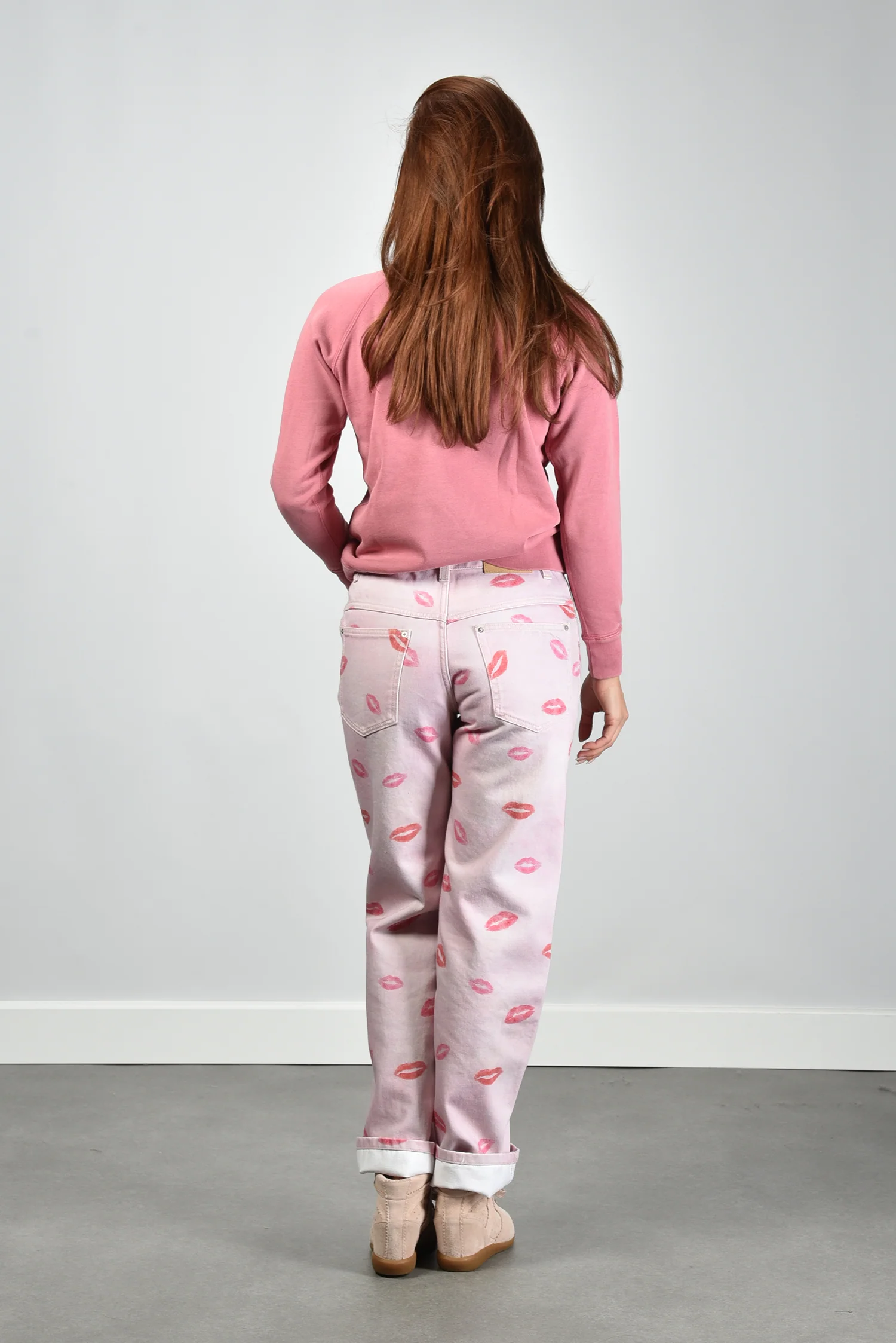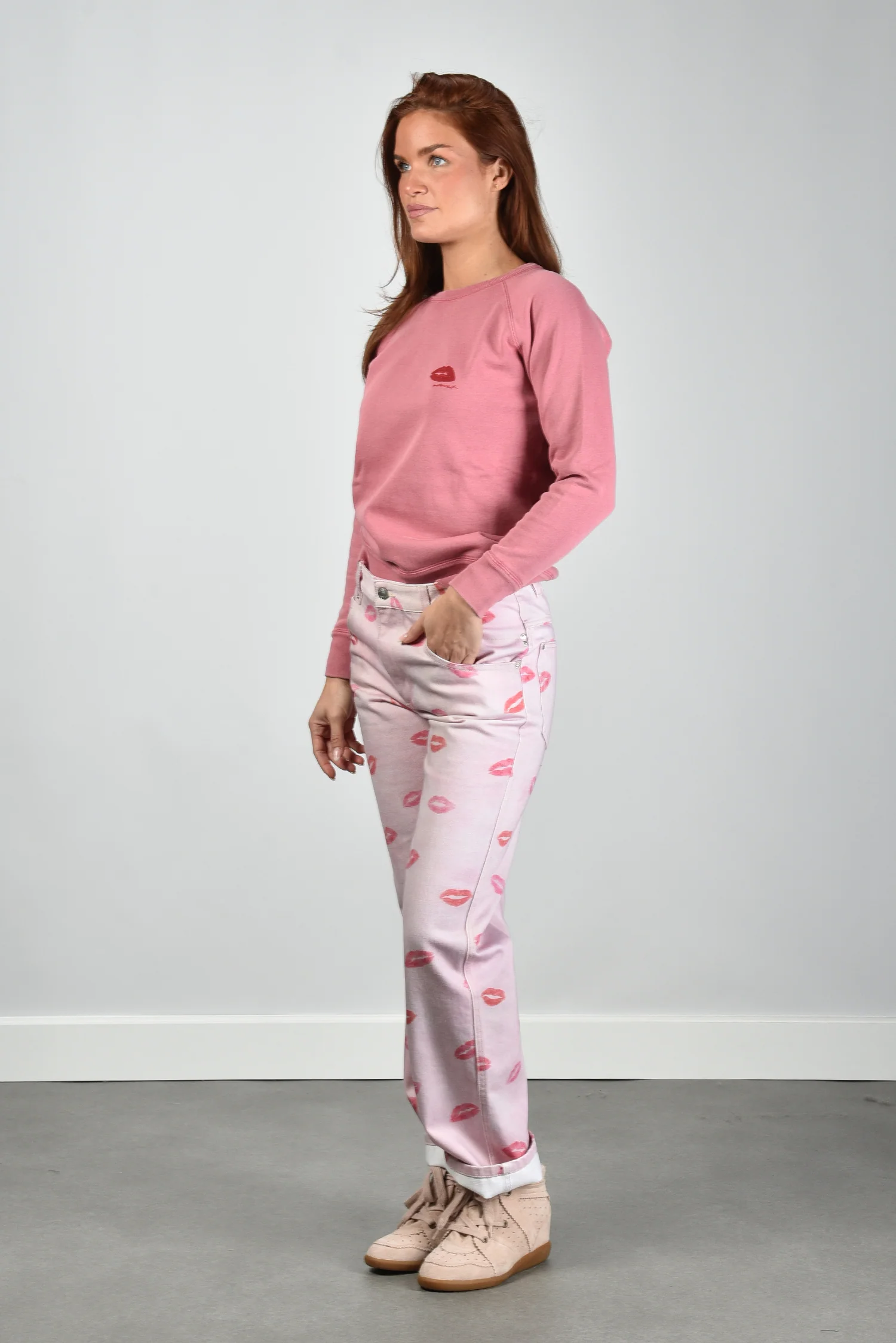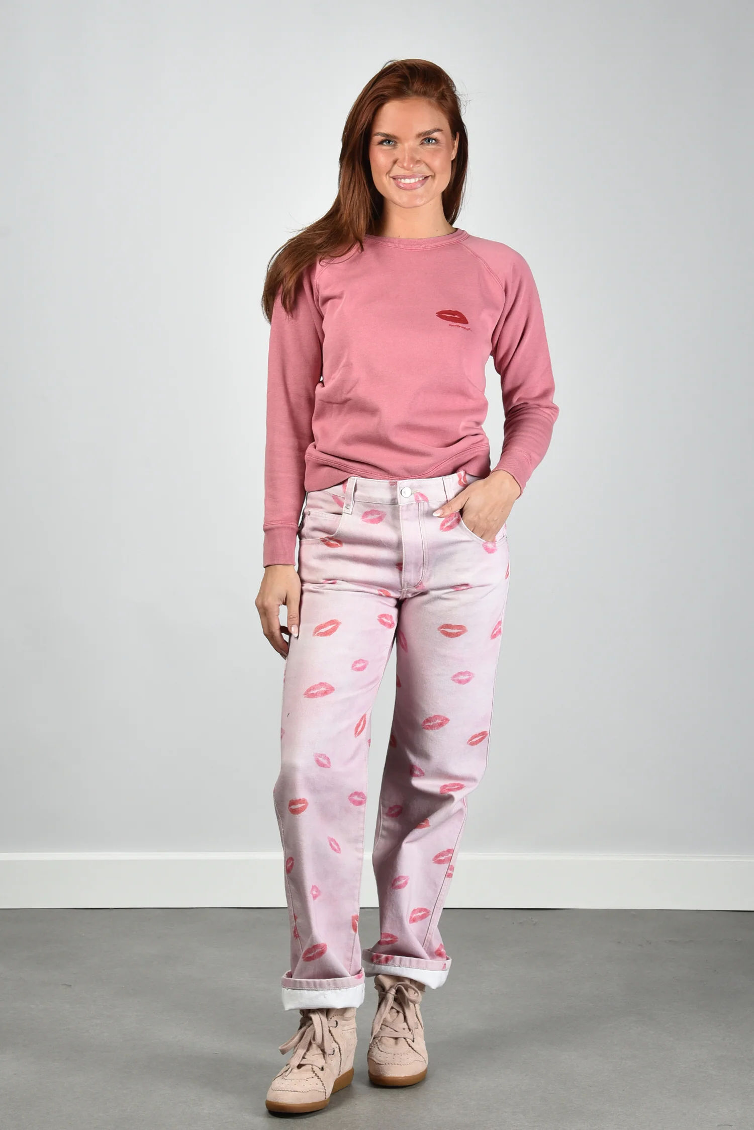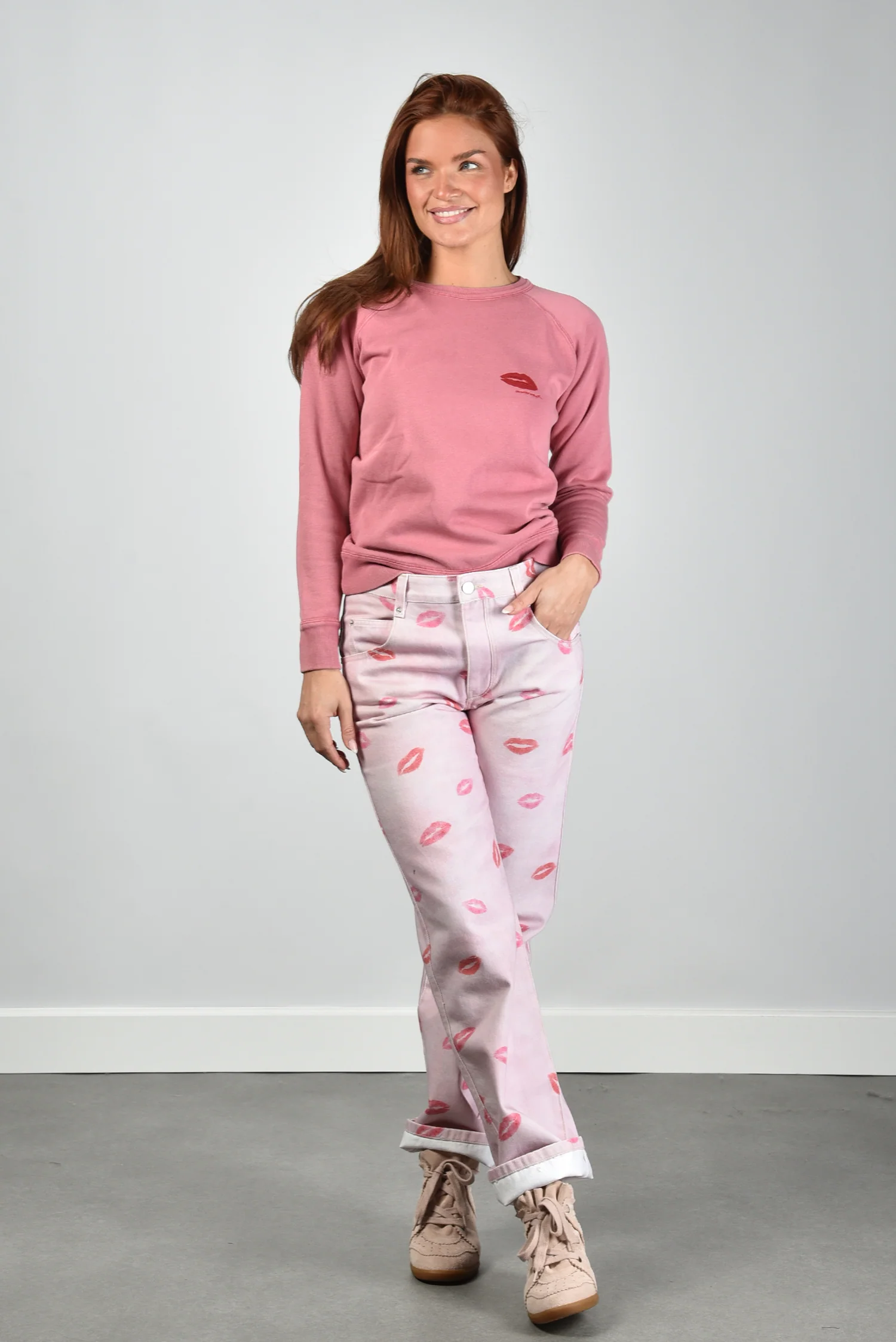 Hier zie je de trui Millyny van Marant Etoile. De roze kleur voelt zacht voor het oog en krijgt iets speels door de rode lippenafdruk op de borst. De ronde hals houdt het ontwerp rustig en sluit netjes aan. De raglanmouwen geven een vloeiende lijn langs de schouders met zichtbare stiknaden die het model net wat robuuster maken. De stof van katoen met een vleug polyester draagt licht en blijft mooi in vorm. De trui valt normaal op maat, dus je kunt uitgaan van je eigen maat. Marant Etoile staat bekend om stukken die comfortabel zitten en een ontspannen Parijse uitstraling hebben, en dat merk je hier meteen terug.