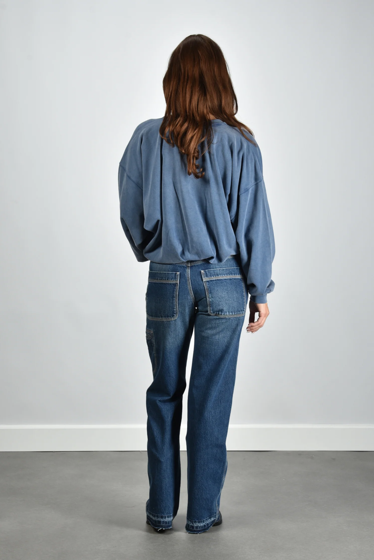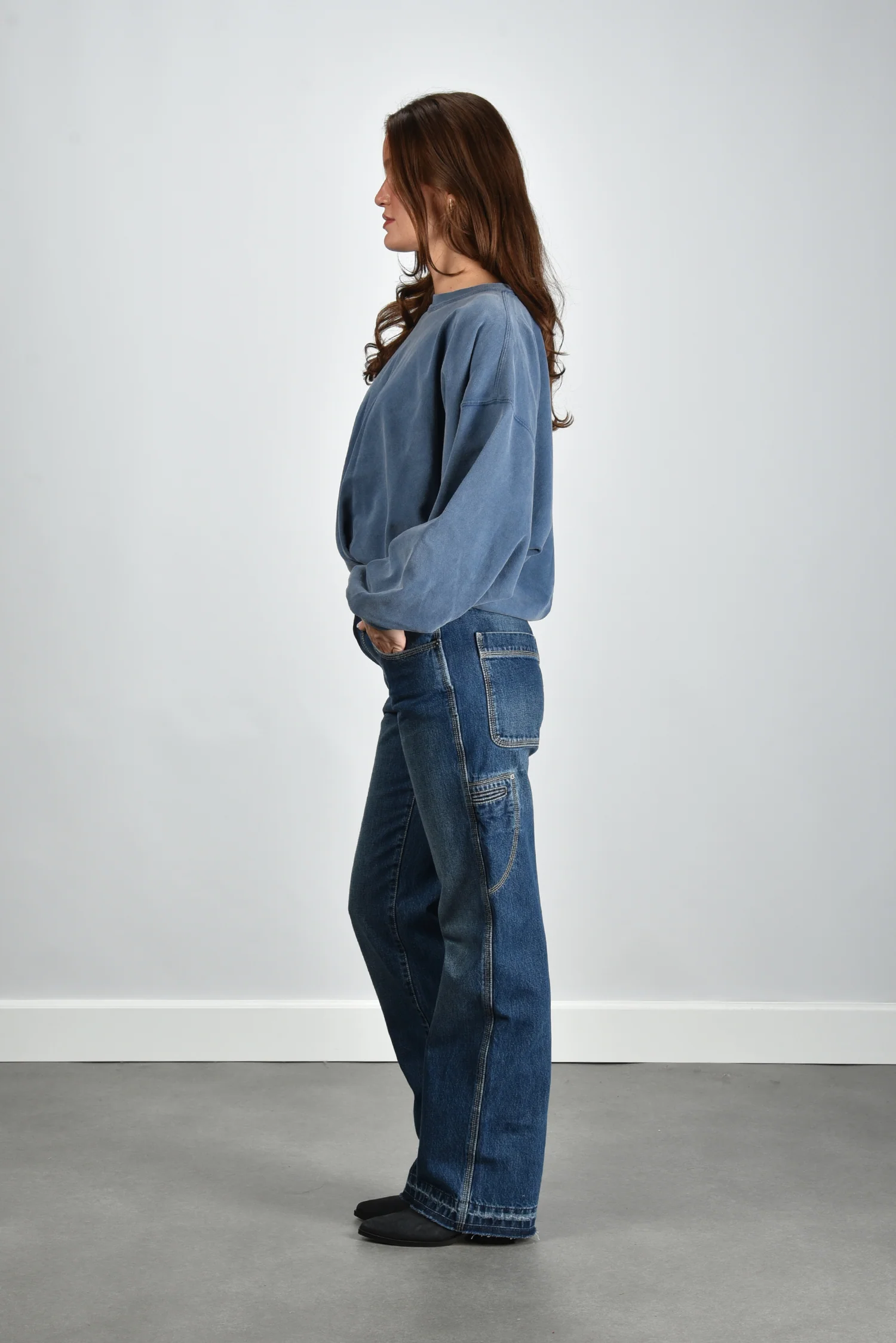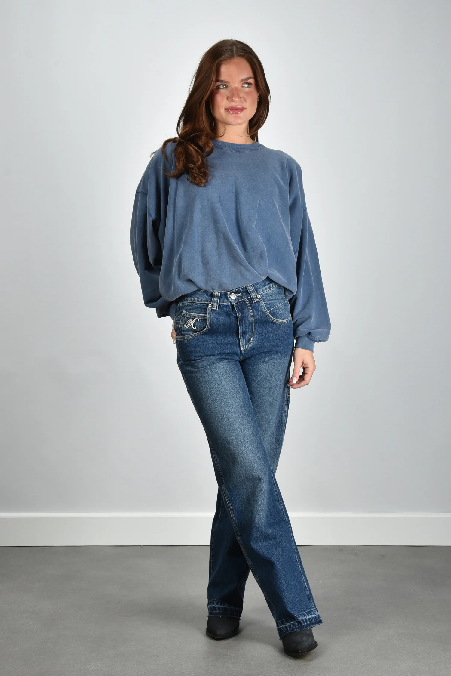 De trui Sauria van Marant Etoile valt meteen op door zijn ontspannen silhouet. De pasvorm is ruim, met lage schoudernaden en ruime mouwen die eindigen in smalle boorden. Het indigo katoen voelt stevig maar soepel en geeft de trui een natuurlijke vorm. De gewassen blauwe tint oogt licht vervaagd, wat de trui een nonchalante uitstraling geeft. Draag hem met de Isabel Marant trui Hermine voor een zachte kleurlijn of combineer met denim voor een stoer contrast. De trui valt normaal op maat, dus je kunt gewoon je eigen maat kiezen.