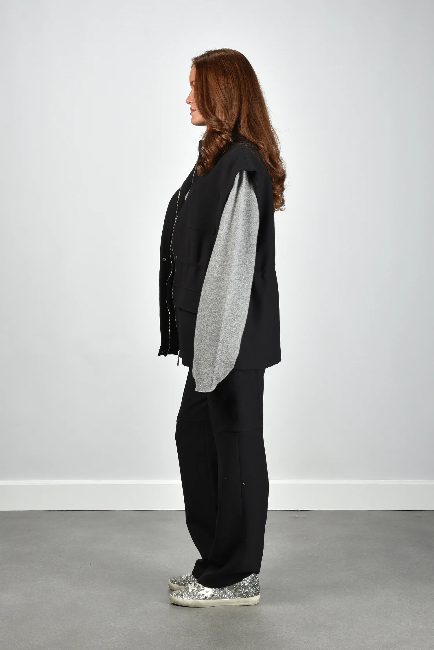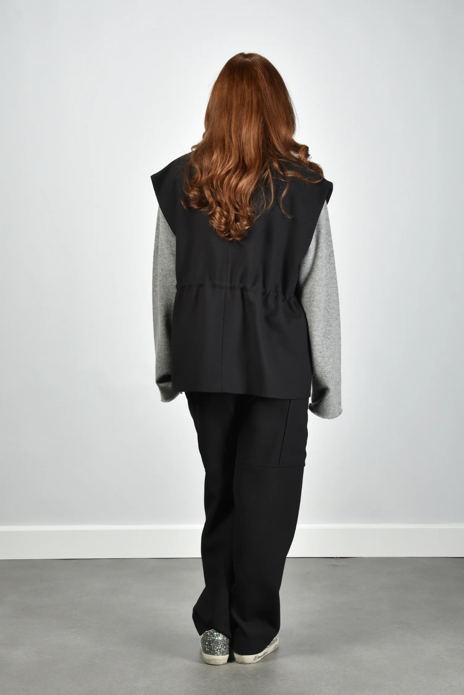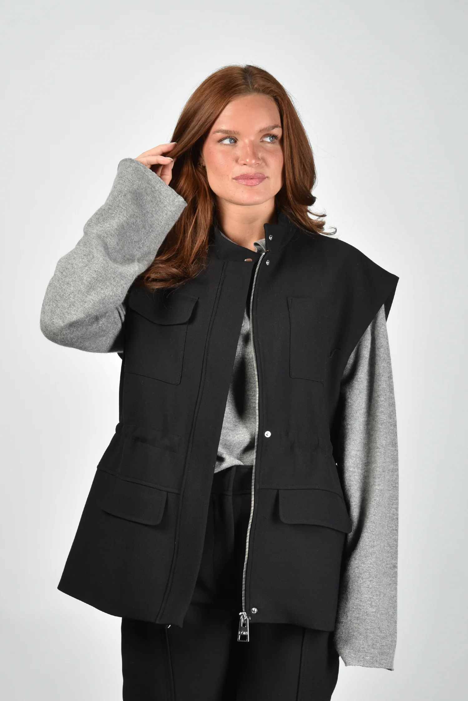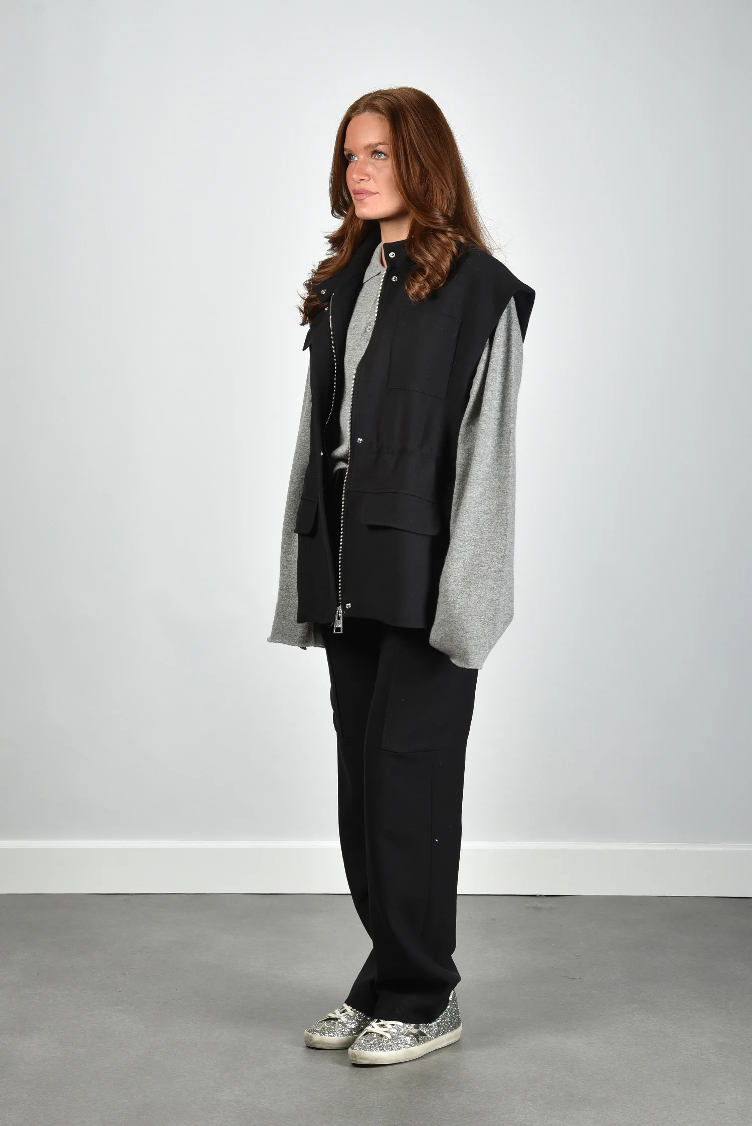 Het gilet Reed van Margaux Lonnberg heeft de ontspannen Parijse snit waar het merk om bekendstaat. De zwarte body krijgt extra karakter door de grijze accenten bij de mouwen en de royale klepzakken op borst en onderzijde. De taille is licht getailleerd, waardoor de rechte schouderlijn mooi in evenwicht blijft met het vrouwelijke silhouet. De wolmix met een vleugje lycra voelt stevig maar soepel aan en behoudt zijn vorm door de dag heen. Draag het gilet als los statementstuk of combineer met de Margaux Lonnberg broek Lucky black voor een sterke, doordachte set. Dit stuk is ontworpen in Parijs en uitgesproken in zijn eenvoud.