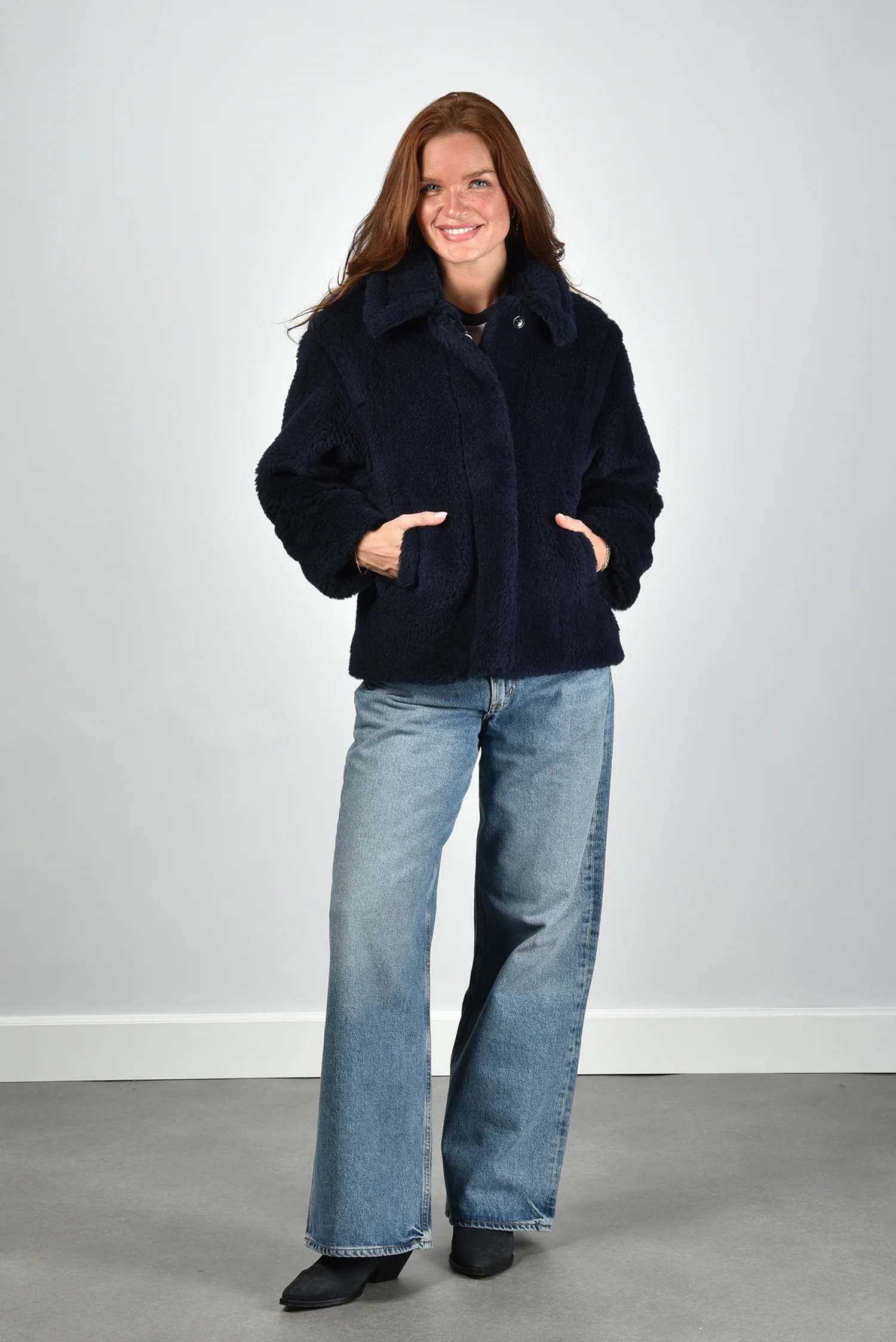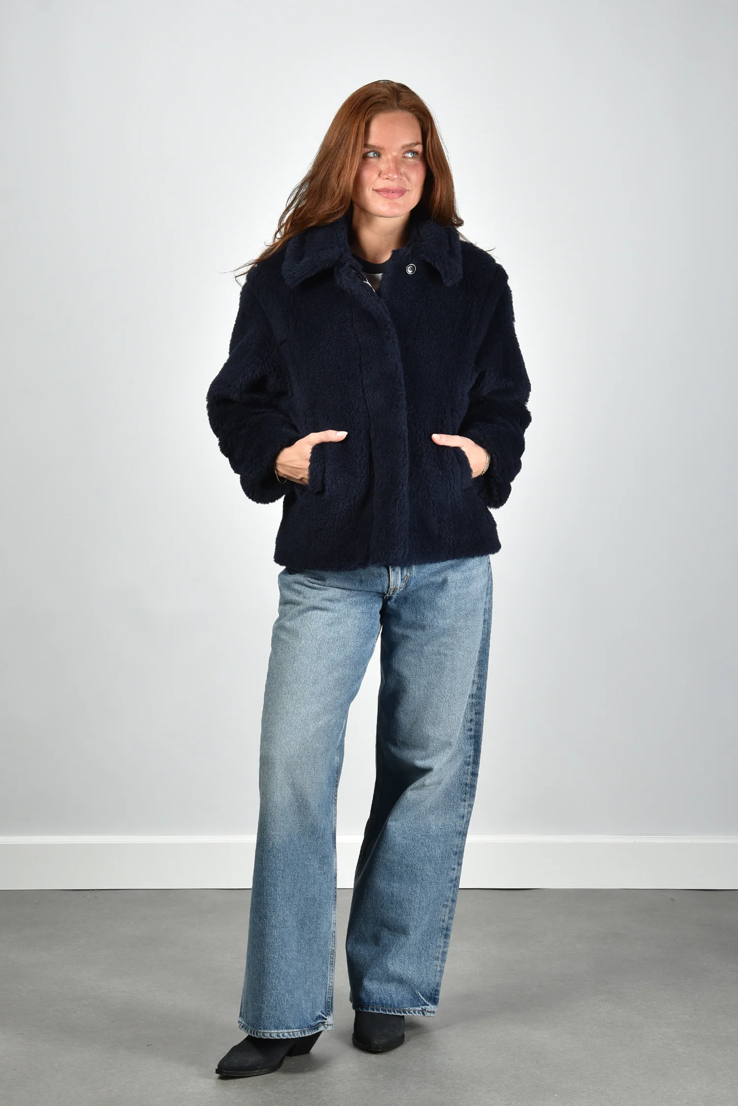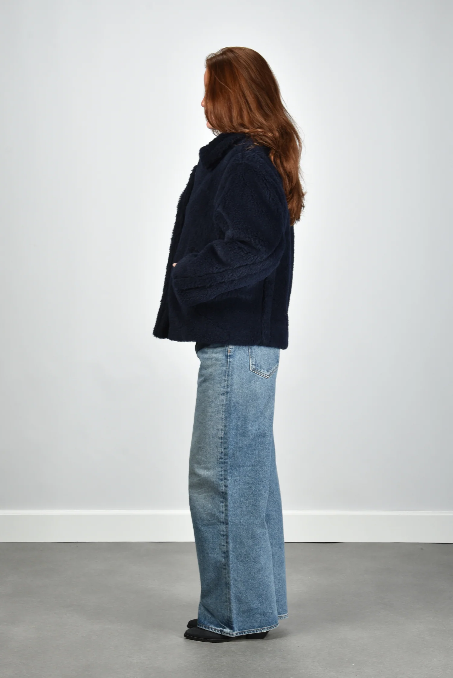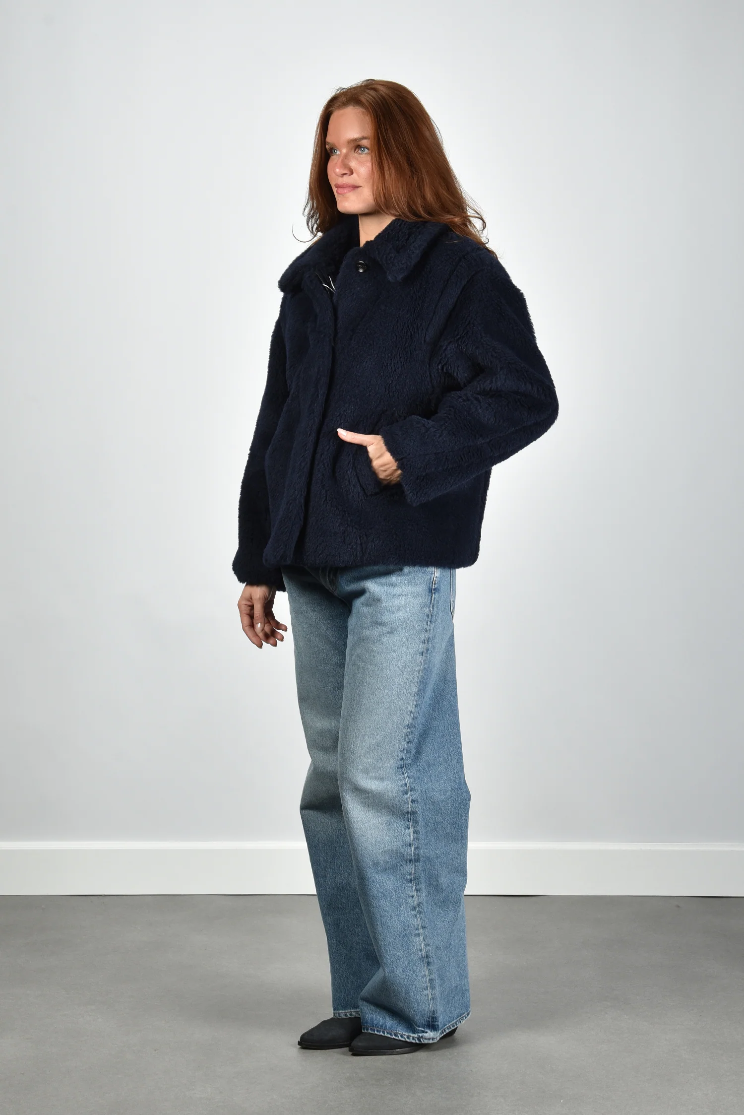 De jas Fuggito van Max Mara is uitgevoerd in een diepe ultramarine tint met een opvallend zachte, pluizige textuur. De brede reverskraag geeft het silhouet extra volume en maakt dat de bovenkant mooi openvalt. Dankzij het rijke materiaal van alpaca, wol en zijde voelt de stof vol en soepel aan. De grote steekzakken aan de voorkant zorgen voor een ontspannen balans tussen elegant en praktisch. Deze jas valt normaal op maat en sluit aan bij de herkenbare stijl van Max Mara, waarin Italiaans vakmanschap en luxe materialen samenkomen. Combineer de Fuggito stijlvol met de Isabel Marant Laarzen Duerto in faded black voor een stoere, vrouwelijke look.