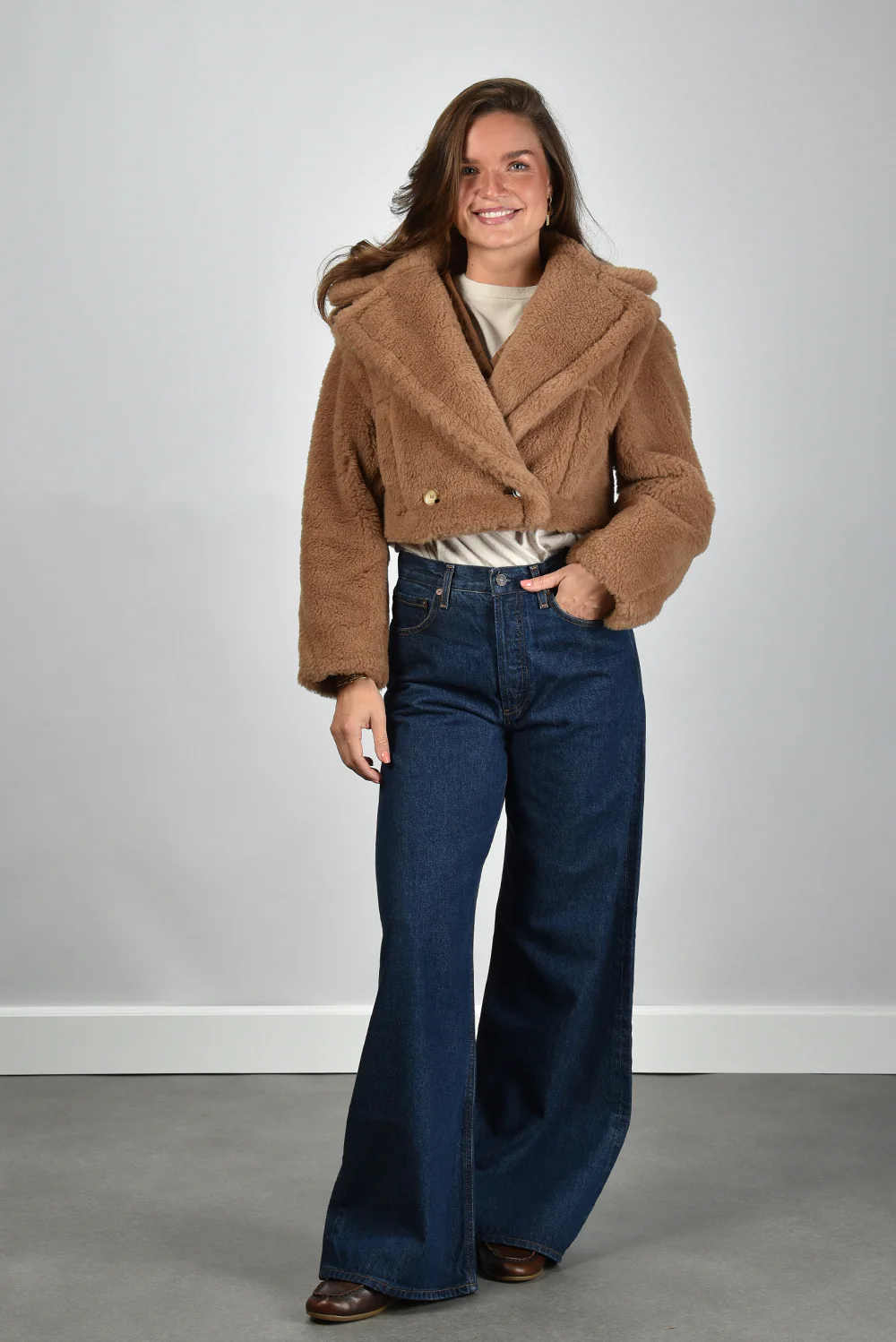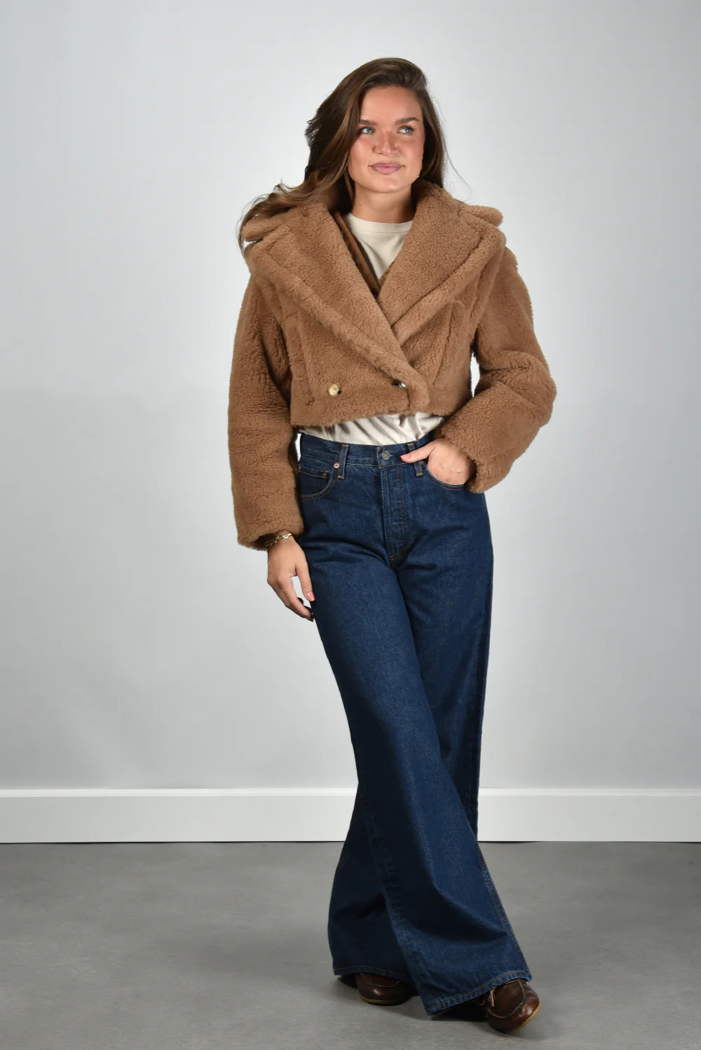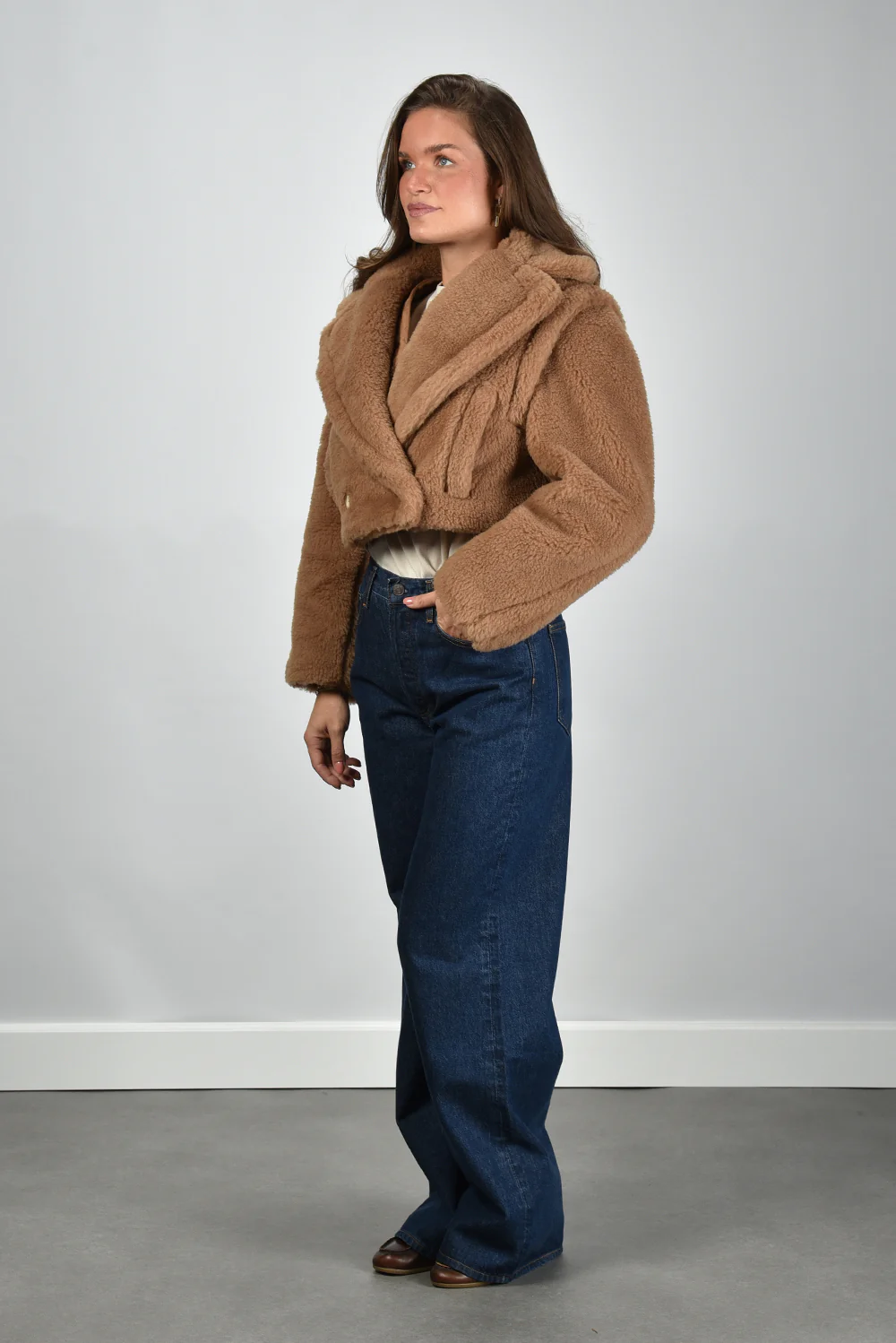 De jas Santos camel van Max Mara is een korte, warme blikvanger met een verrassend spel van texturen. De doorgestikte voorkant in een subtiel ruitpatroon zorgt voor een zorgvuldige structuur, terwijl de zachte, pluizige mouwen het geheel een rijke uitstraling geven. De jas sluit middenvoor met kleine, onopvallende drukknoopjes die het silhouet rustig houden. De combinatie van 88% camel en 12% zijde maakt de stof soepel en luxueus aanvoelend. De lengte valt net boven de heup en sluit mooi aan op bijvoorbeeld de Extreme Cashmere trui Oversize Xtra 20 cream voor een gebalanceerde, nonchalante look. Deze jas valt normaal op maat en is kenmerkend voor het vakmanschap waar Max Mara wereldwijd om wordt geroemd.