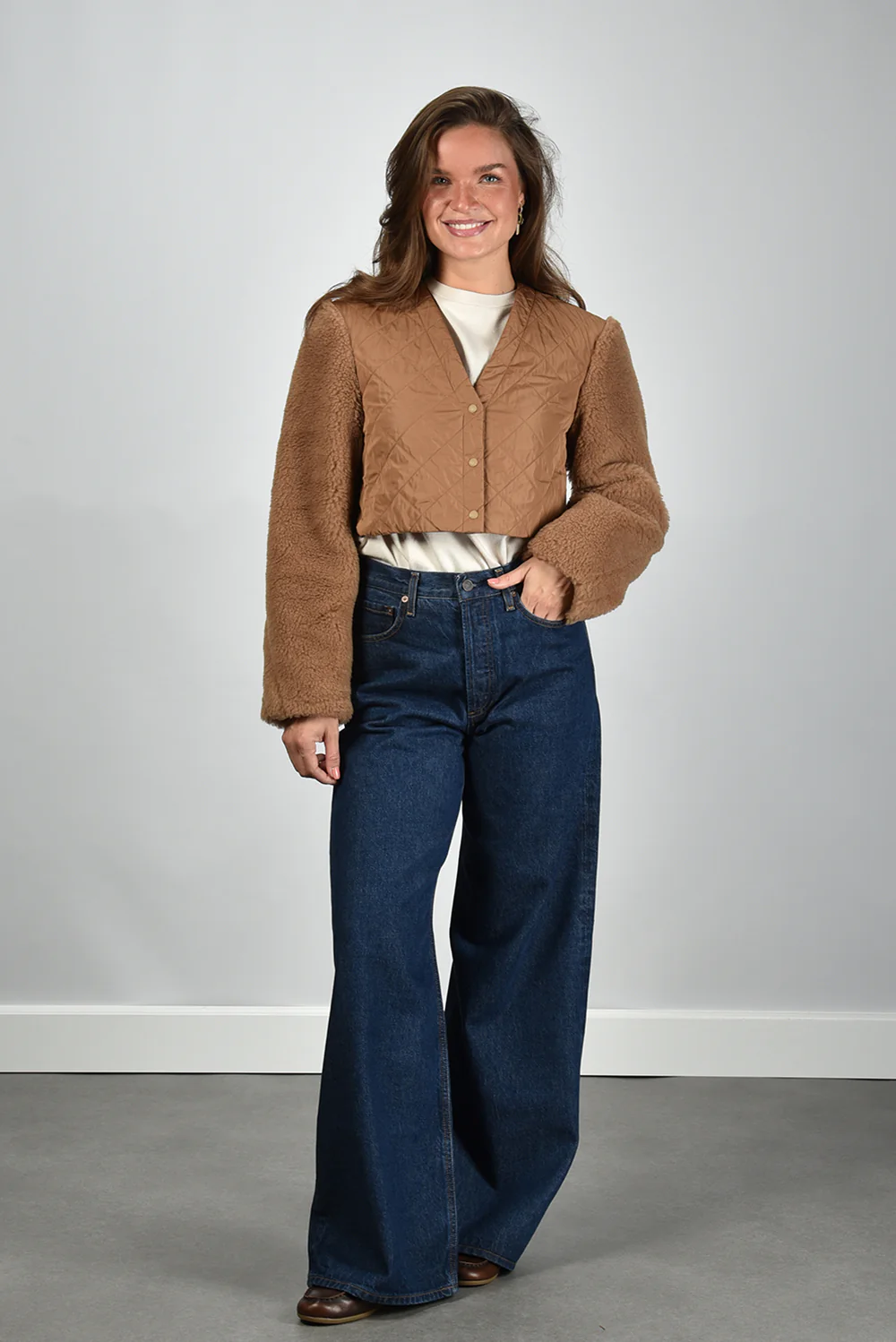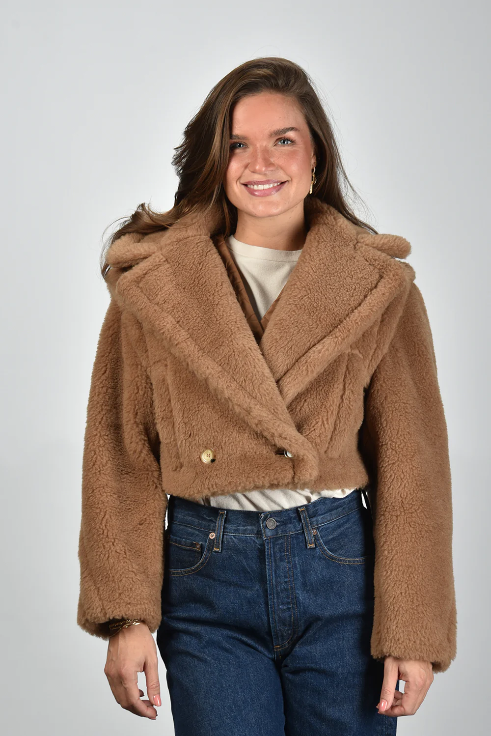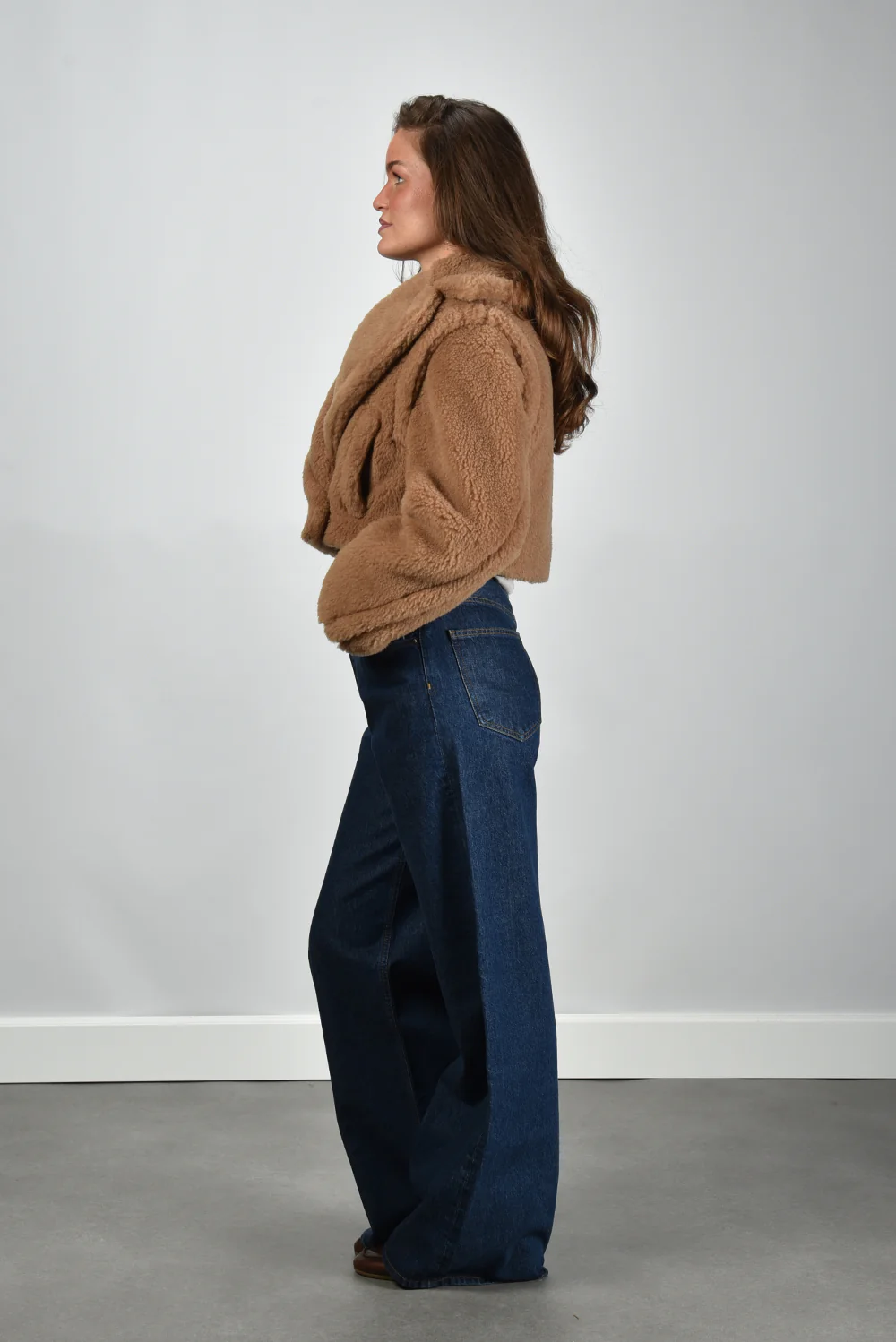 De jas Santos camel van Max Mara is een korte, warme blikvanger met een verrassend spel van texturen. De doorgestikte voorkant in een subtiel ruitpatroon zorgt voor een zorgvuldige structuur, terwijl de zachte, pluizige mouwen het geheel een rijke uitstraling geven. De jas sluit middenvoor met kleine, onopvallende drukknoopjes die het silhouet rustig houden. De combinatie van 88% camel en 12% zijde maakt de stof soepel en luxueus aanvoelend. De lengte valt net boven de heup en sluit mooi aan op bijvoorbeeld de Extreme Cashmere trui Oversize Xtra 20 cream voor een gebalanceerde, nonchalante look. Deze jas valt normaal op maat en is kenmerkend voor het vakmanschap waar Max Mara wereldwijd om wordt geroemd.