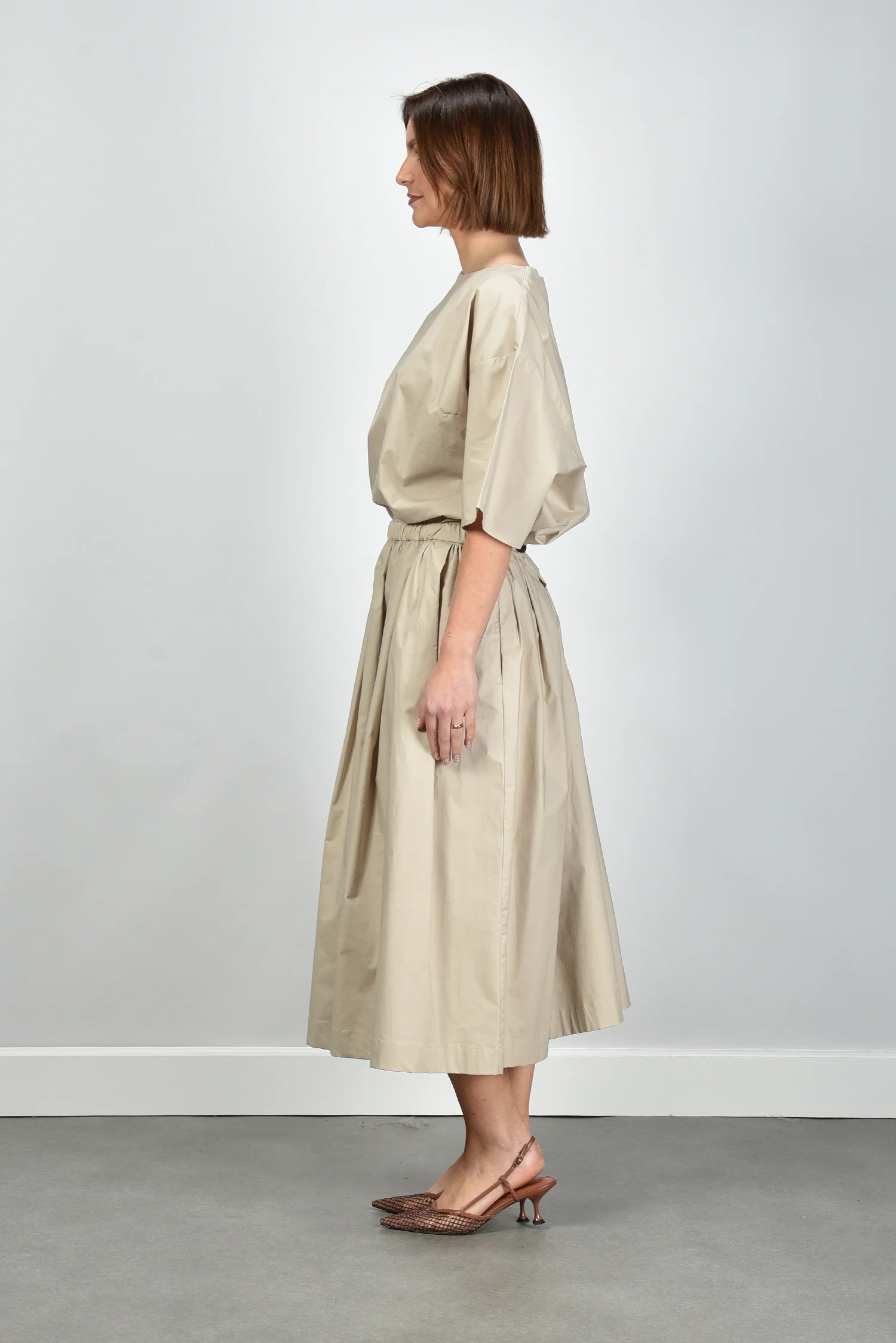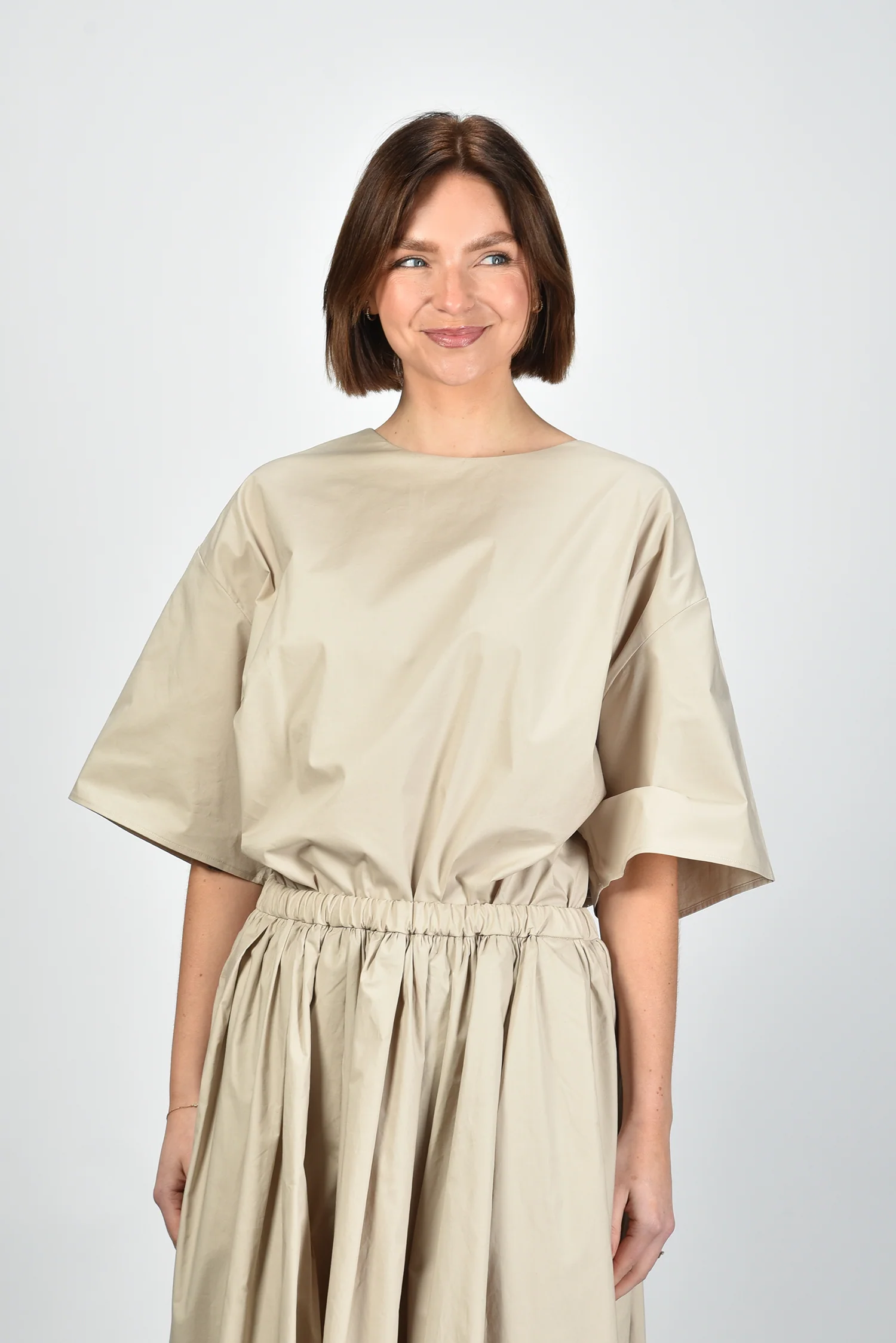 De blouse Rebe sabbia van Nine in the Morning heeft een ontspannen silhouet met korte, rechte mouwen en een hoog gesloten ronde hals. De zachte beige tint voelt rustig en zorgvuldig vormgegeven aan, passend bij Italiaans vakmanschap. De stof bestaat uit 95% katoen en 5% elastaan, wat zorgt voor een soepele structuur die mooi valt. De blouse valt normaal op maat en is eenvoudig te dragen boven een gladde pantalon of een lichte jeans. Het merk staat bekend om zijn precieze afwerking en subtiel gevormde ontwerpen, en dat zie je terug in elk detail van deze blouse. Stijlvol te combineren met de Wandler crossbody Hortensia Mini in deep olive voor een zachte, vrouwelijke balans.