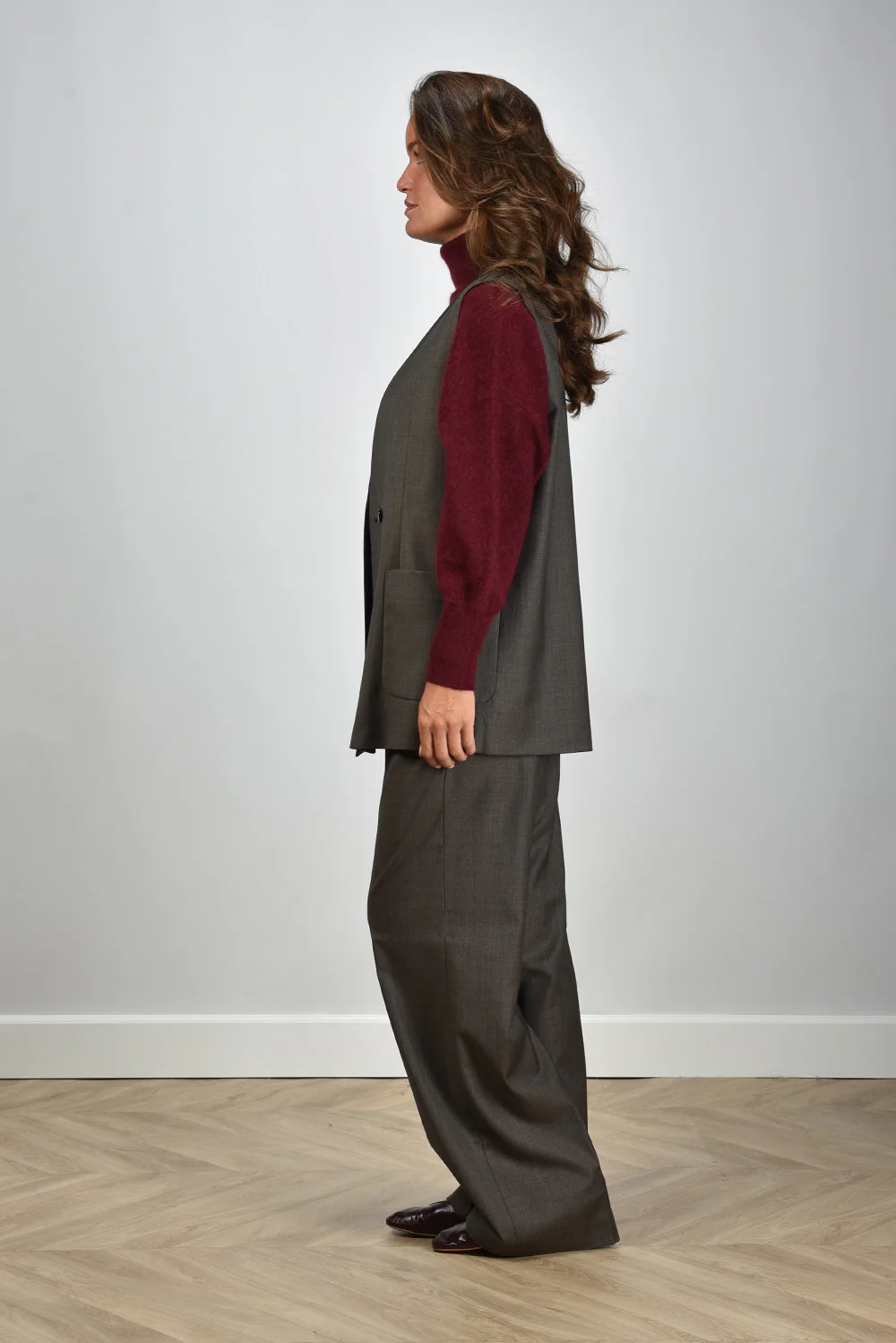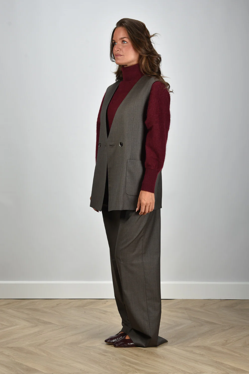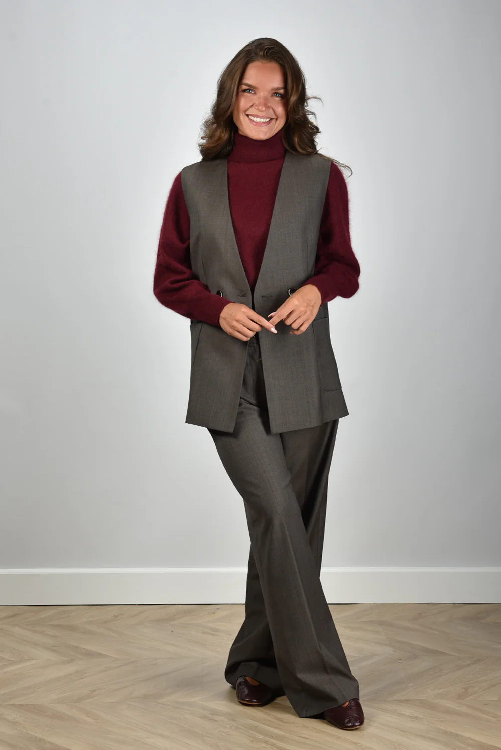 Het gilet Eloisa van Nine In The Morning heeft die subtiele eenvoud die direct opvalt. De rechte, lange pasvorm valt ruim over de heup en de diepe V-hals zonder kraag of revers geeft het ontwerp een open lijnenspel. De grote, opgestikte zakken aan de voorkant voegen een praktisch accent toe. De warme bruine tint, ook wel beige genoemd, laat het Italiaanse vakmanschap van Nine In The Morning extra goed tot zijn recht komen. Dankzij de mix van 99% wol en een vleugje elastane voelt het gilet stevig maar soepel aan. Draag het Eloisa gilet met de Le Monde Beryl ballerina’s Stella voor een gebalanceerde, moderne combinatie.