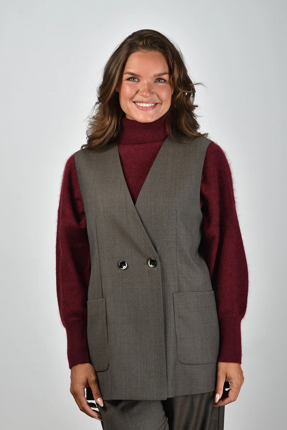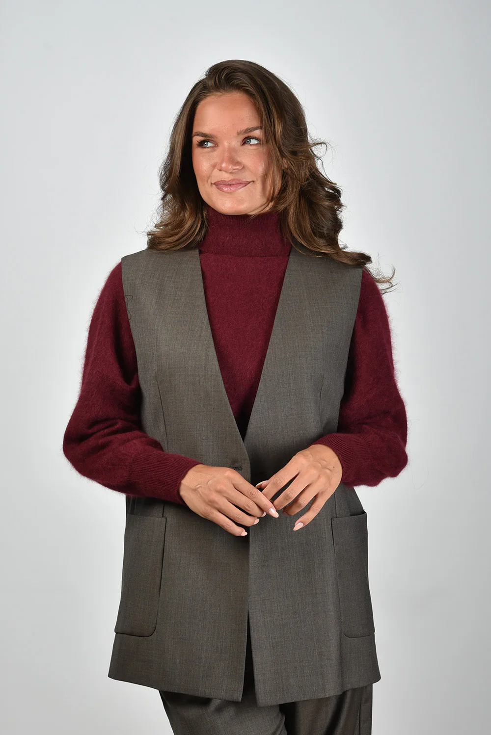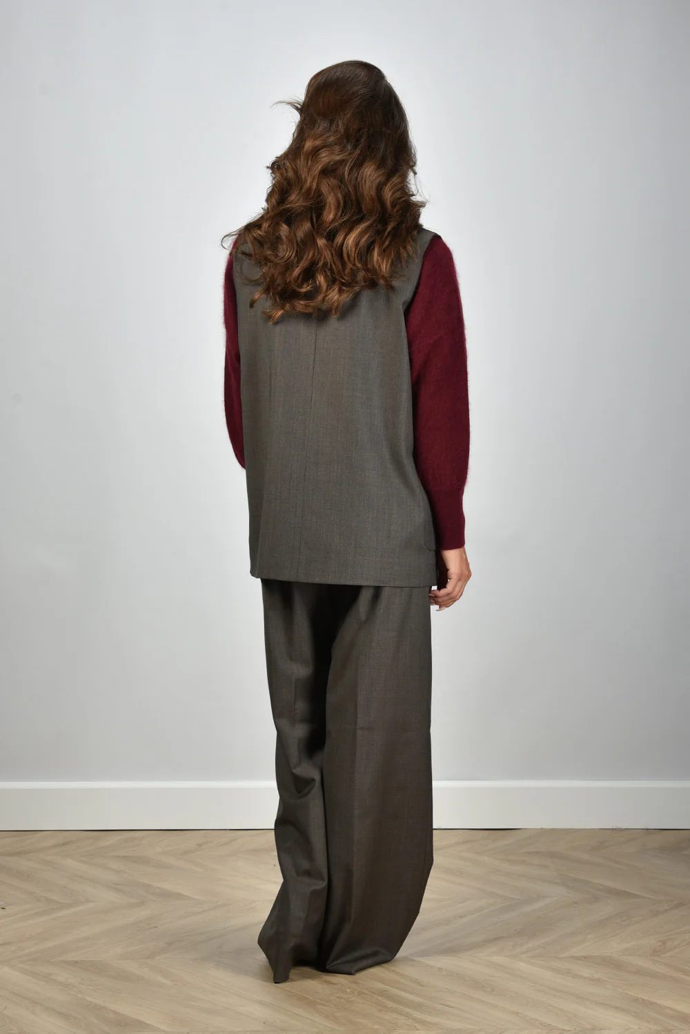 Het gilet Eloisa van Nine In The Morning heeft die subtiele eenvoud die direct opvalt. De rechte, lange pasvorm valt ruim over de heup en de diepe V-hals zonder kraag of revers geeft het ontwerp een open lijnenspel. De grote, opgestikte zakken aan de voorkant voegen een praktisch accent toe. De warme bruine tint, ook wel beige genoemd, laat het Italiaanse vakmanschap van Nine In The Morning extra goed tot zijn recht komen. Dankzij de mix van 99% wol en een vleugje elastane voelt het gilet stevig maar soepel aan. Draag het Eloisa gilet met de Le Monde Beryl ballerina’s Stella voor een gebalanceerde, moderne combinatie.