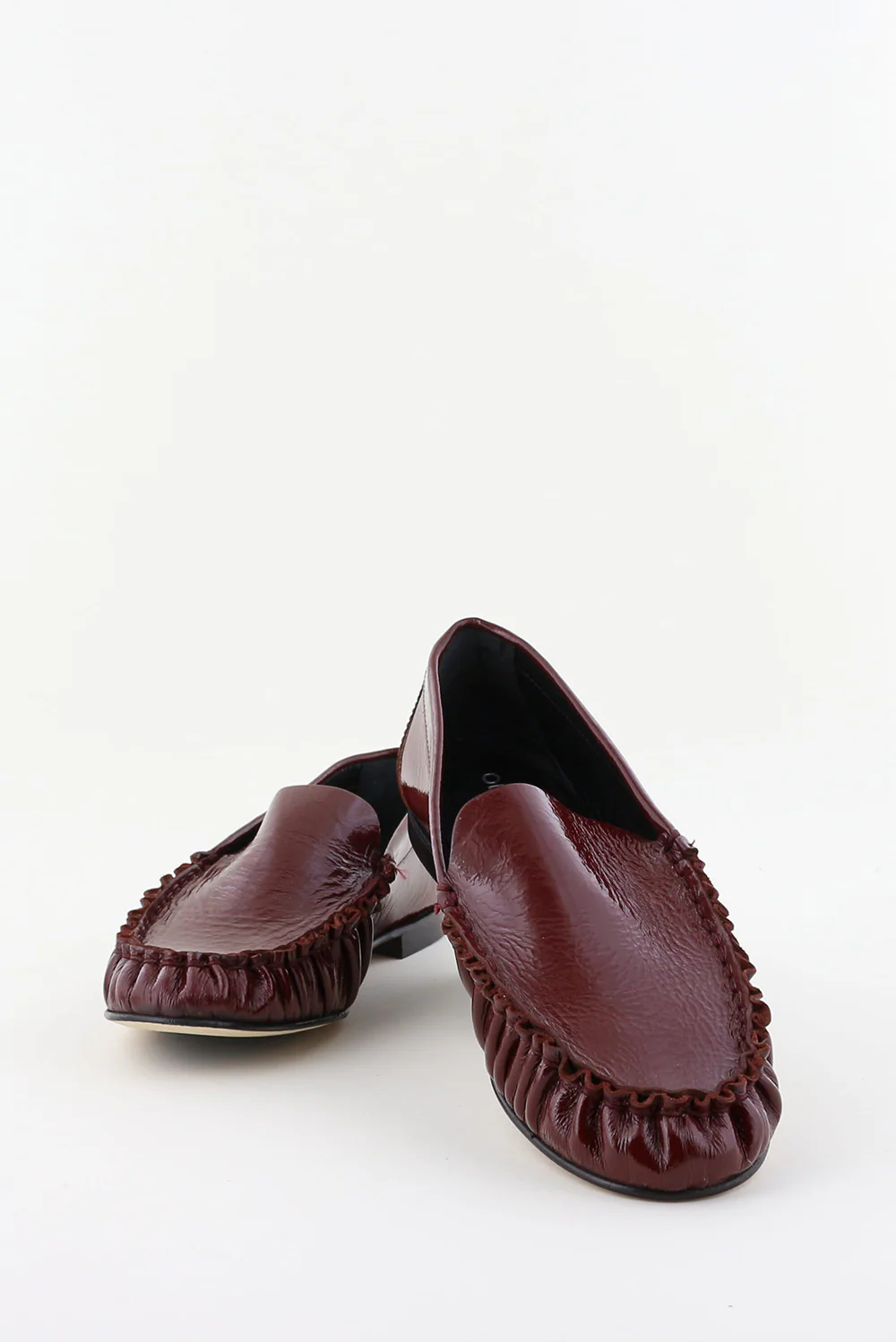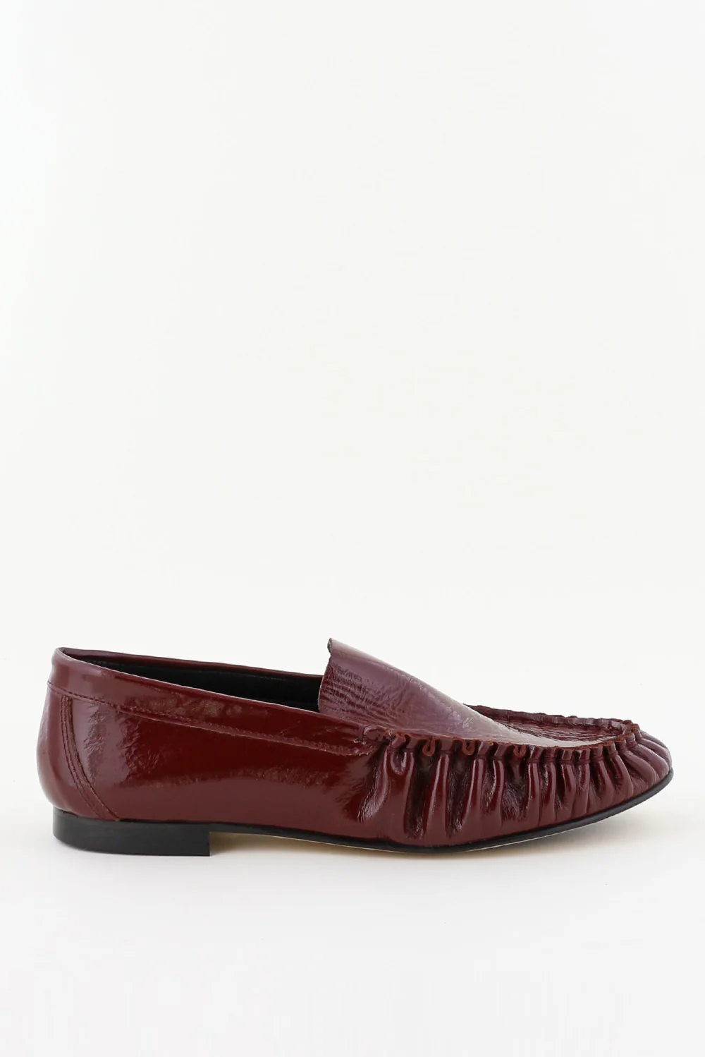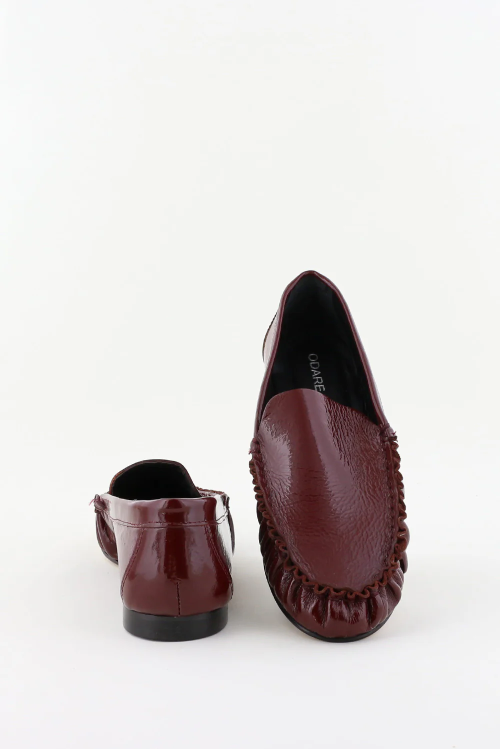 Hier zie je de loafers Elena venice rood van Odare. De glans van het lakleer geeft de dieprode kleur extra diepte, terwijl de gerimpelde afwerking aan de voorzijde een subtiel geplooid effect laat zien. De platte zool en lage hak houden het silhouet strak en licht aan de voet. De pasvorm valt normaal, dus je kunt uitgaan van je eigen maat. Odare laat in dit ontwerp mooi zien hoe Italiaanse ambachtslieden vorm en materiaal zorgvuldig samenbrengen.