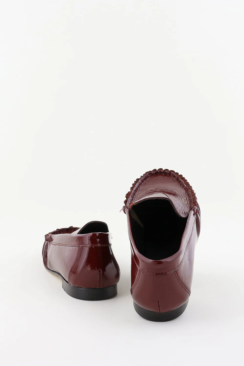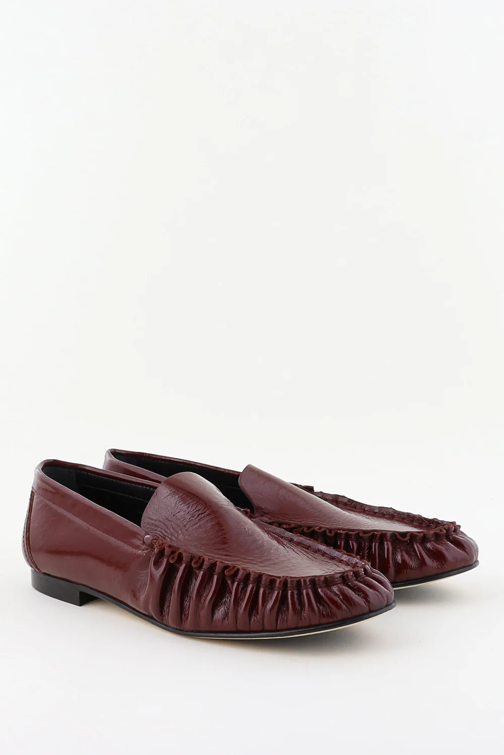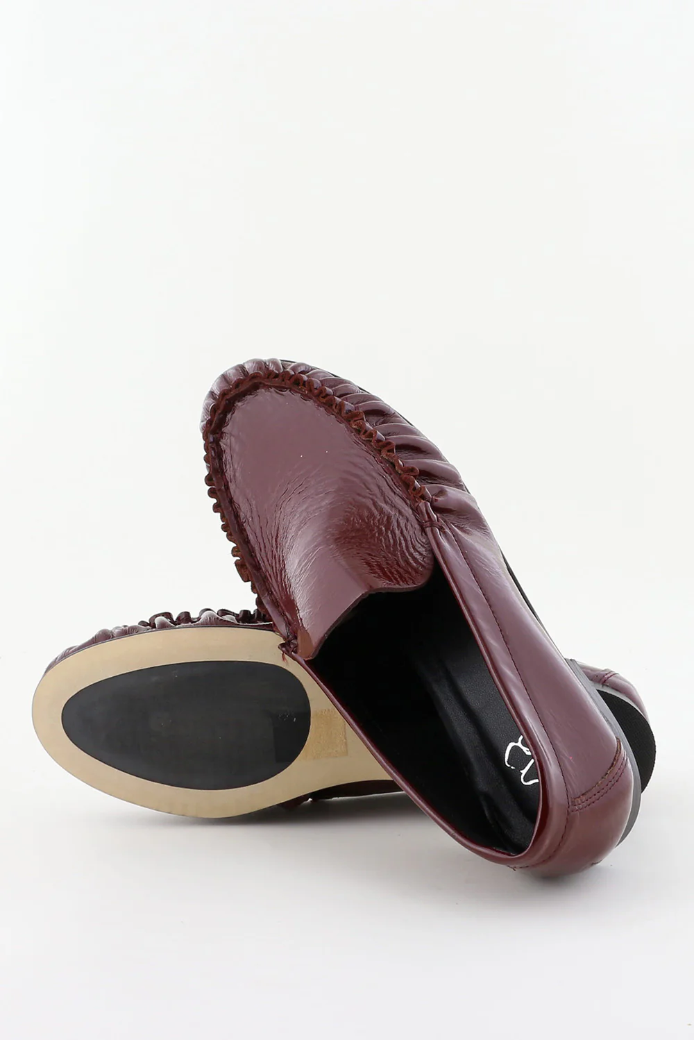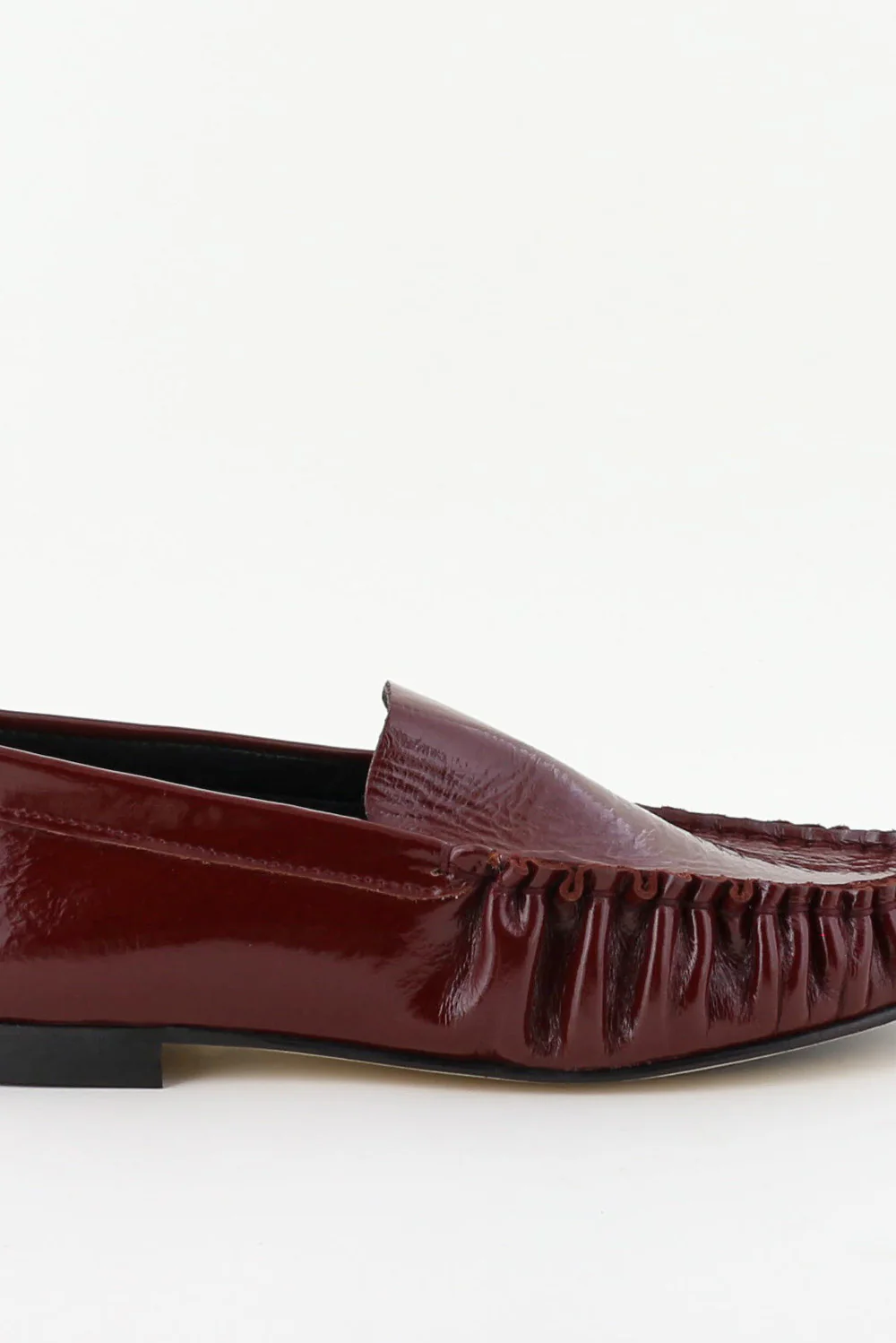 Hier zie je de loafers Elena venice rood van Odare. De glans van het lakleer geeft de dieprode kleur extra diepte, terwijl de gerimpelde afwerking aan de voorzijde een subtiel geplooid effect laat zien. De platte zool en lage hak houden het silhouet strak en licht aan de voet. De pasvorm valt normaal, dus je kunt uitgaan van je eigen maat. Odare laat in dit ontwerp mooi zien hoe Italiaanse ambachtslieden vorm en materiaal zorgvuldig samenbrengen.