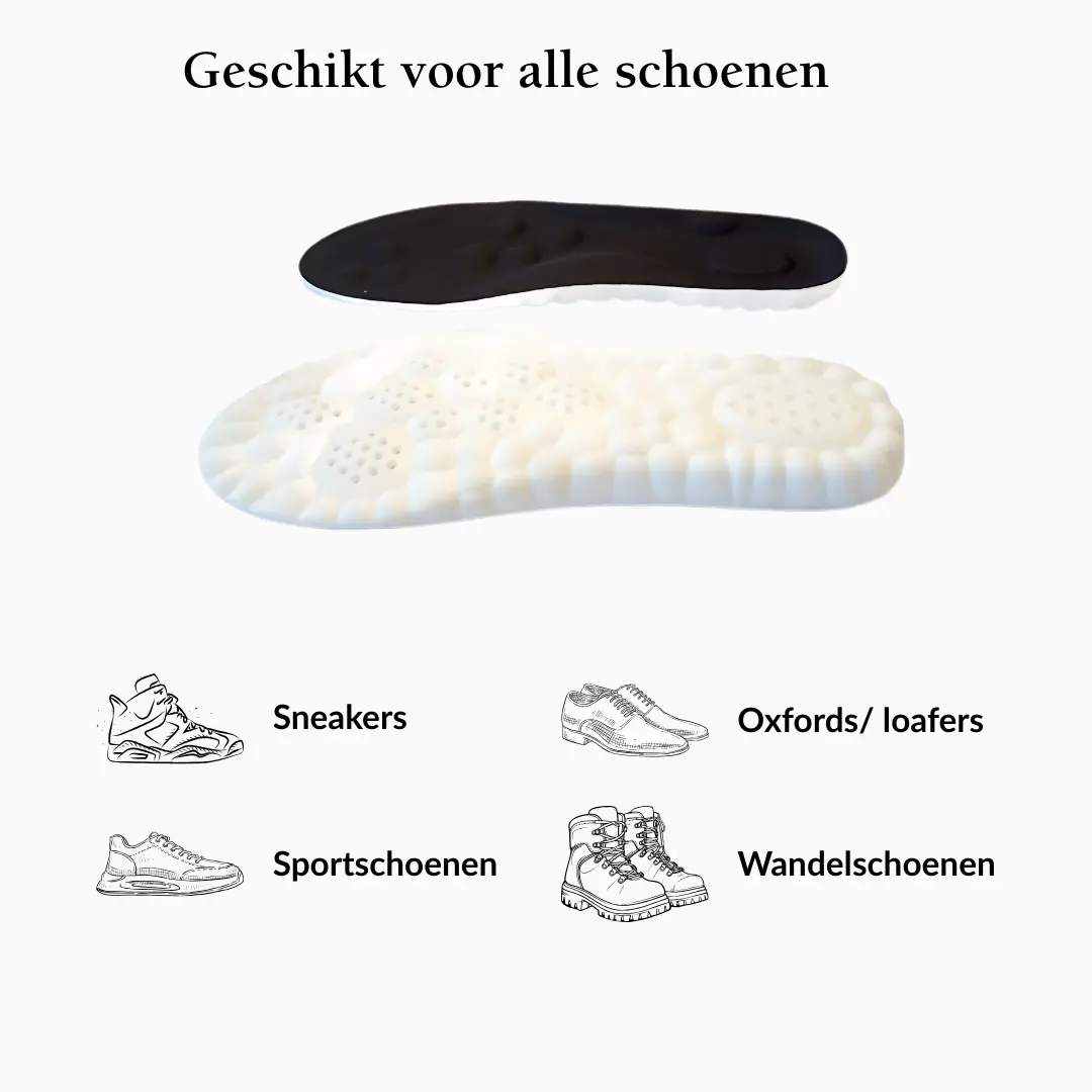 De zooltjes combineren een subtiele verhoging (1–3 cm) met zweetabsorberend en geurremmend materiaal, zodat je voeten fris blijven – zelfs bij intensief gebruik. Geen stijve of logge zool, maar een uitgebalanceerde ondersteuning die je voeten natuurlijk volgt.