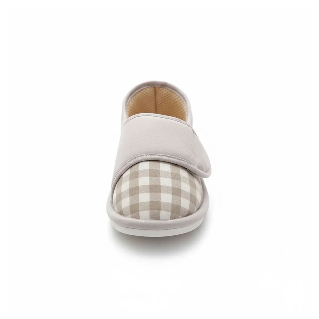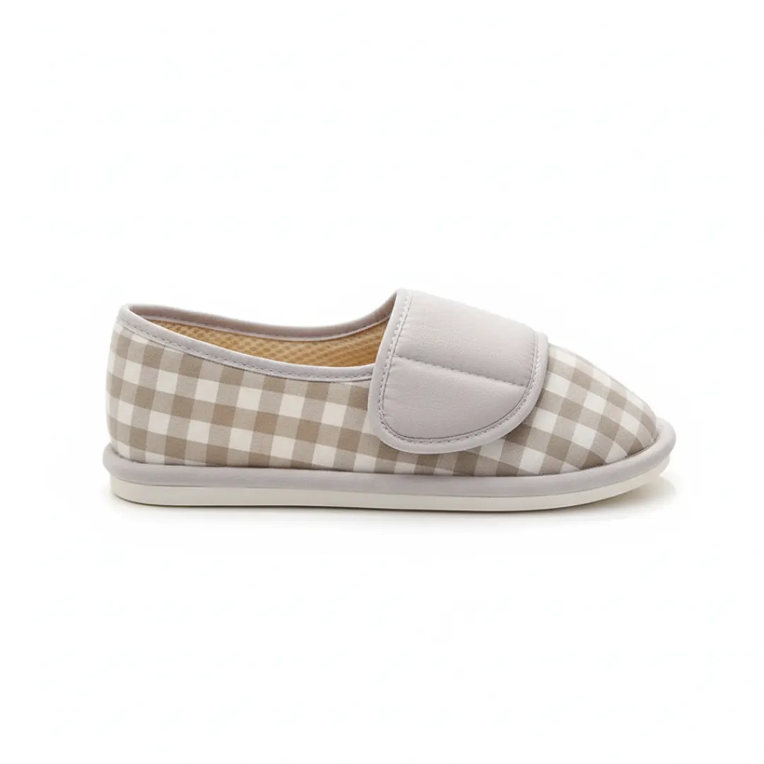 De verstelbare klittenbandsluiting maakt het aantrekken eenvoudig en biedt extra ruimte bij gezwollen voeten of andere voetproblemen. Het lichte ontwerp en het klassieke ruitpatroon geven deze pantoffels een stijlvolle, tijdloze uitstraling zonder in te leveren op comfort of ondersteuning.