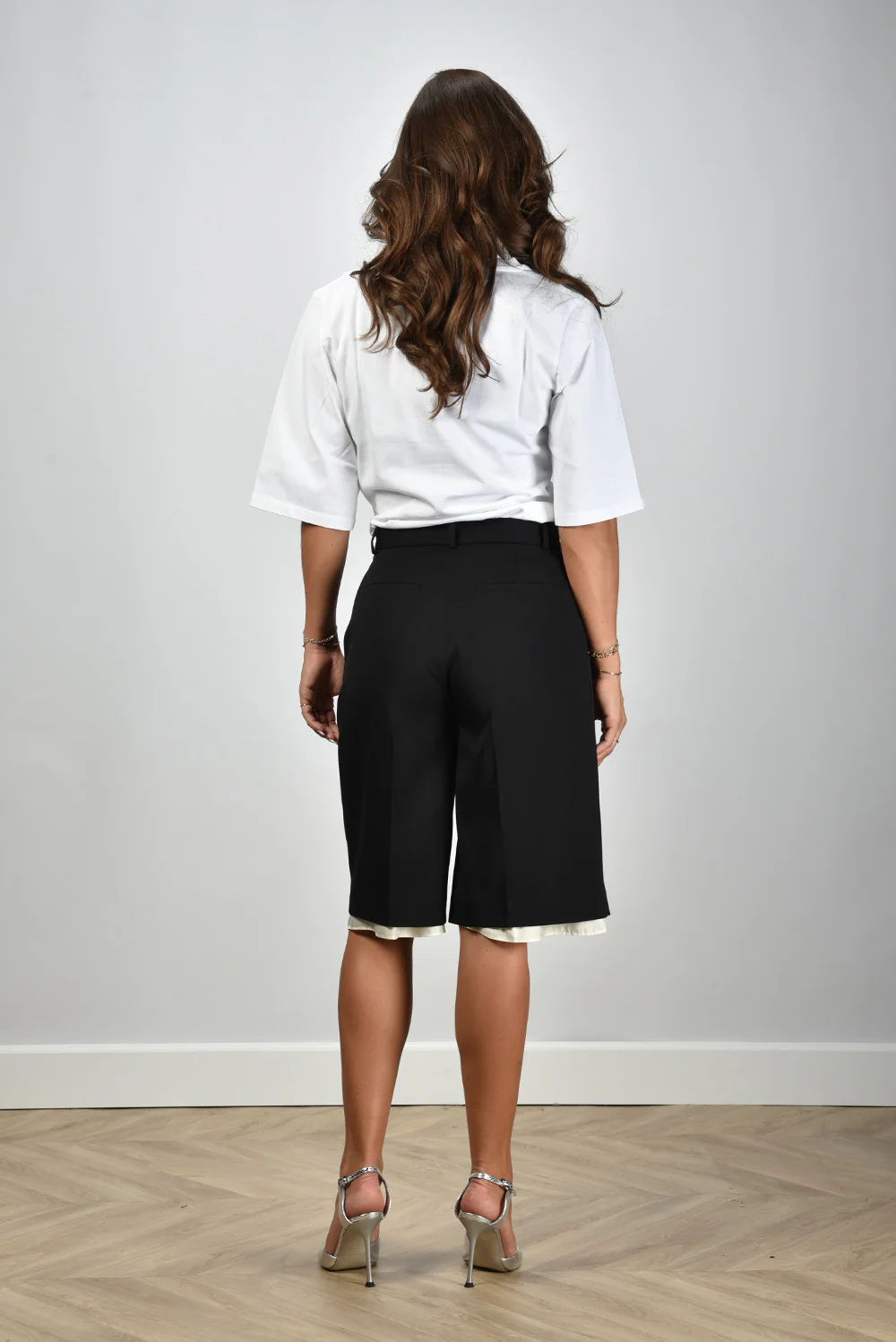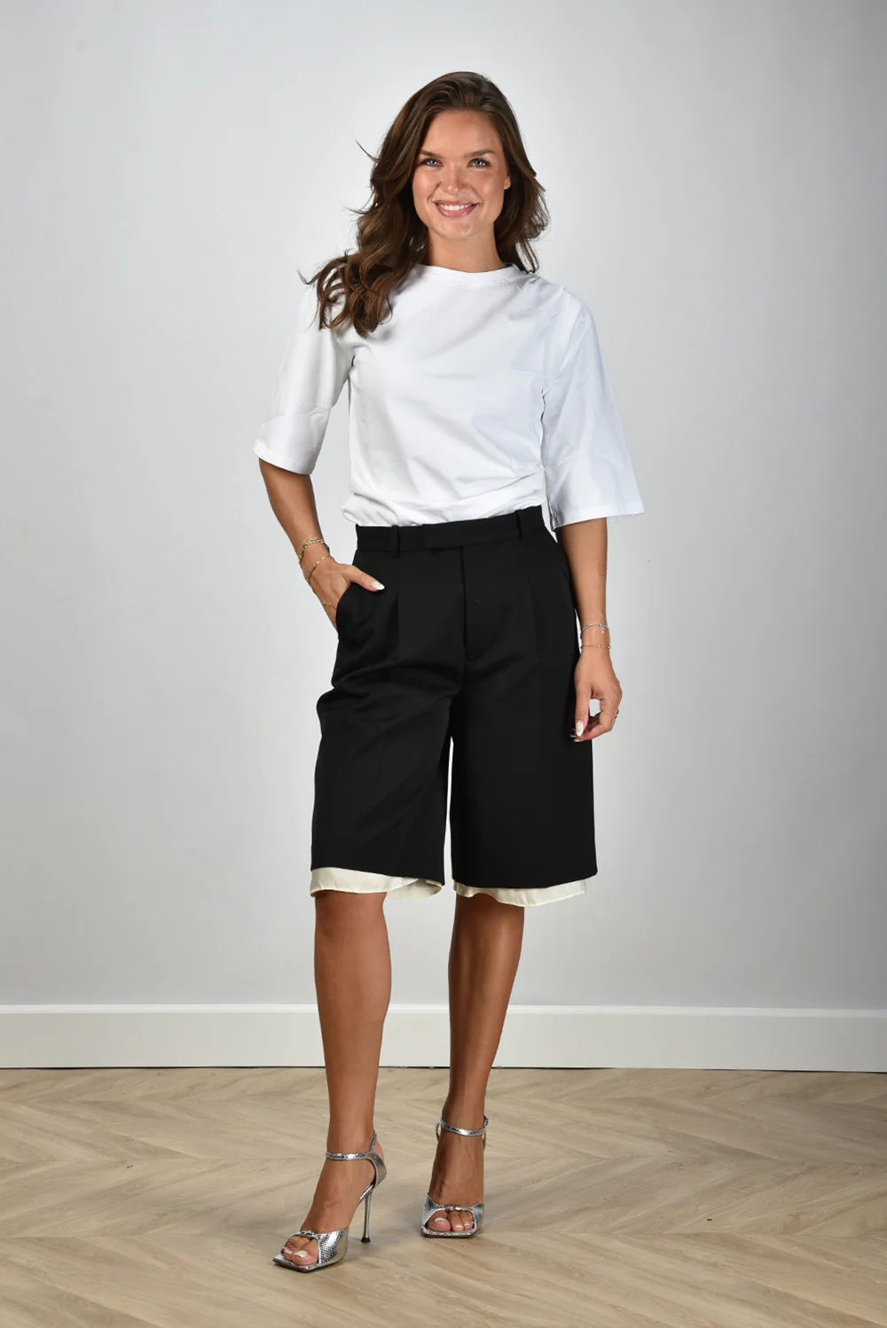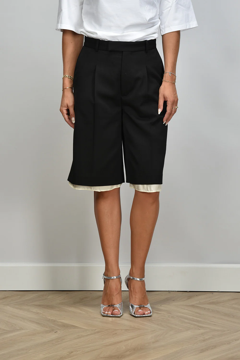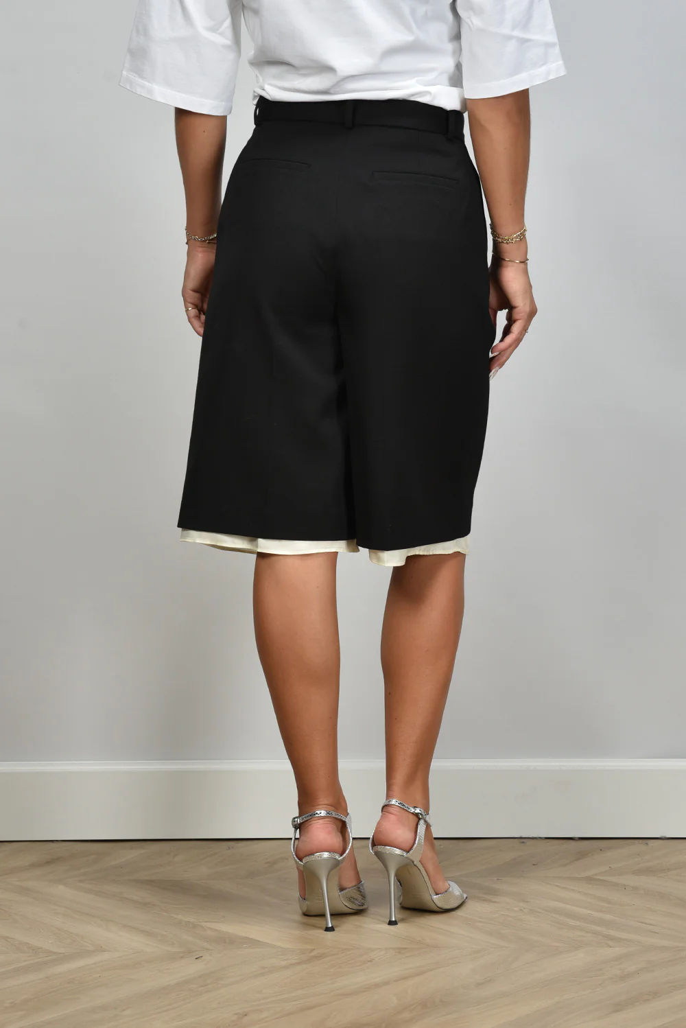 De lange short met witte rand van RÓHE heeft die fijne, precieze snit waar het merk om bekendstaat. De zwarte stof voelt stevig en soepel tegelijk, met een lichte glans die past bij het wolmengsel. De shorts vallen net over de knie en hebben aan de onderzijde een contrasterende witte rand die meteen structuur en frisheid geeft. De scherpe vouwen aan de voorkant zorgen voor een nette vorm, terwijl de geplooide afwerking het geheel een rustige balans biedt. Deze short valt normaal op maat, dus je kunt gerust je eigen maat kiezen. Mooi in combinatie met de Wandler crossbody Hortensia Mini in disco silver voor een elegante zomerlook met karakter.