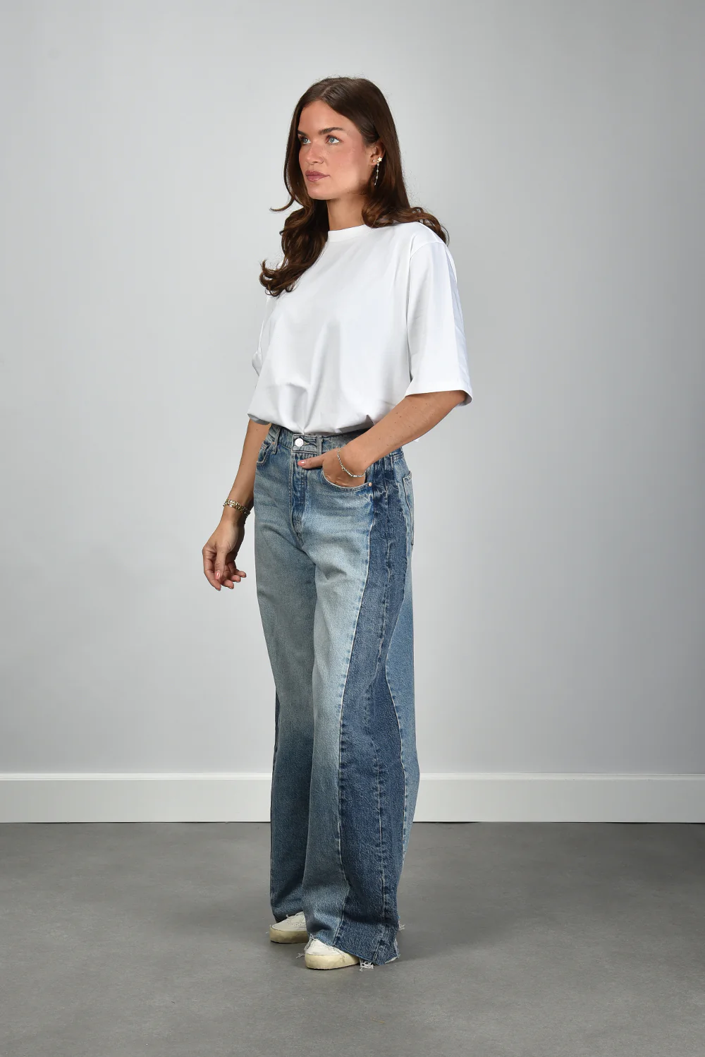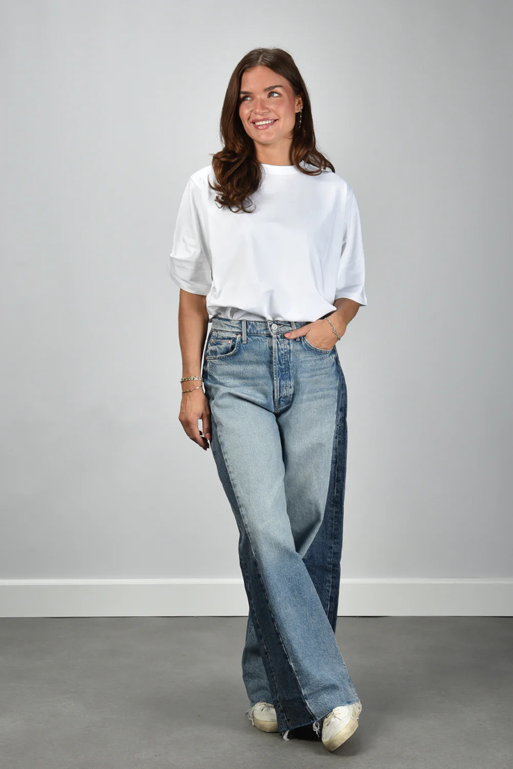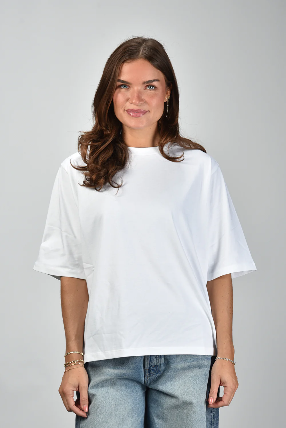 Het basic t shirt wit van RÓHE is een item dat de rest van je outfit rustig laat spreken. Het is gemaakt van 100 procent katoen en voelt soepel en stevig tegelijk. De pasvorm valt recht en iets los, met ruimvallende mouwen en een hoge ronde hals die goed aansluit. De kleur optic white benadrukt het frisse, cleane karakter waar RÓHE om bekendstaat. Draag dit shirt met de Golden Goose sneakers Superstar voor een ontspannen en doordachte look waarin elk detail klopt.
