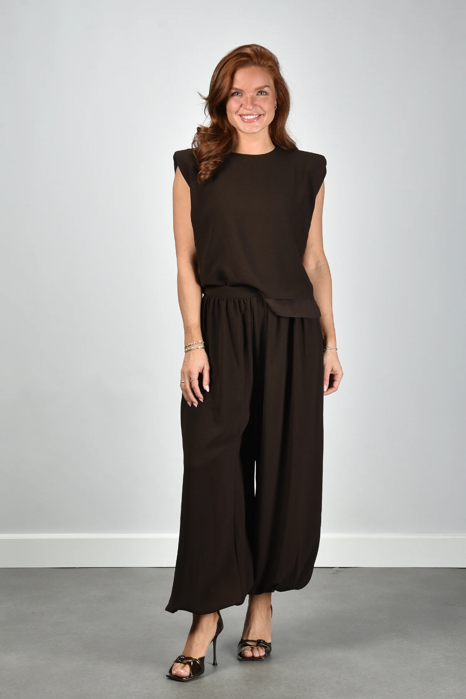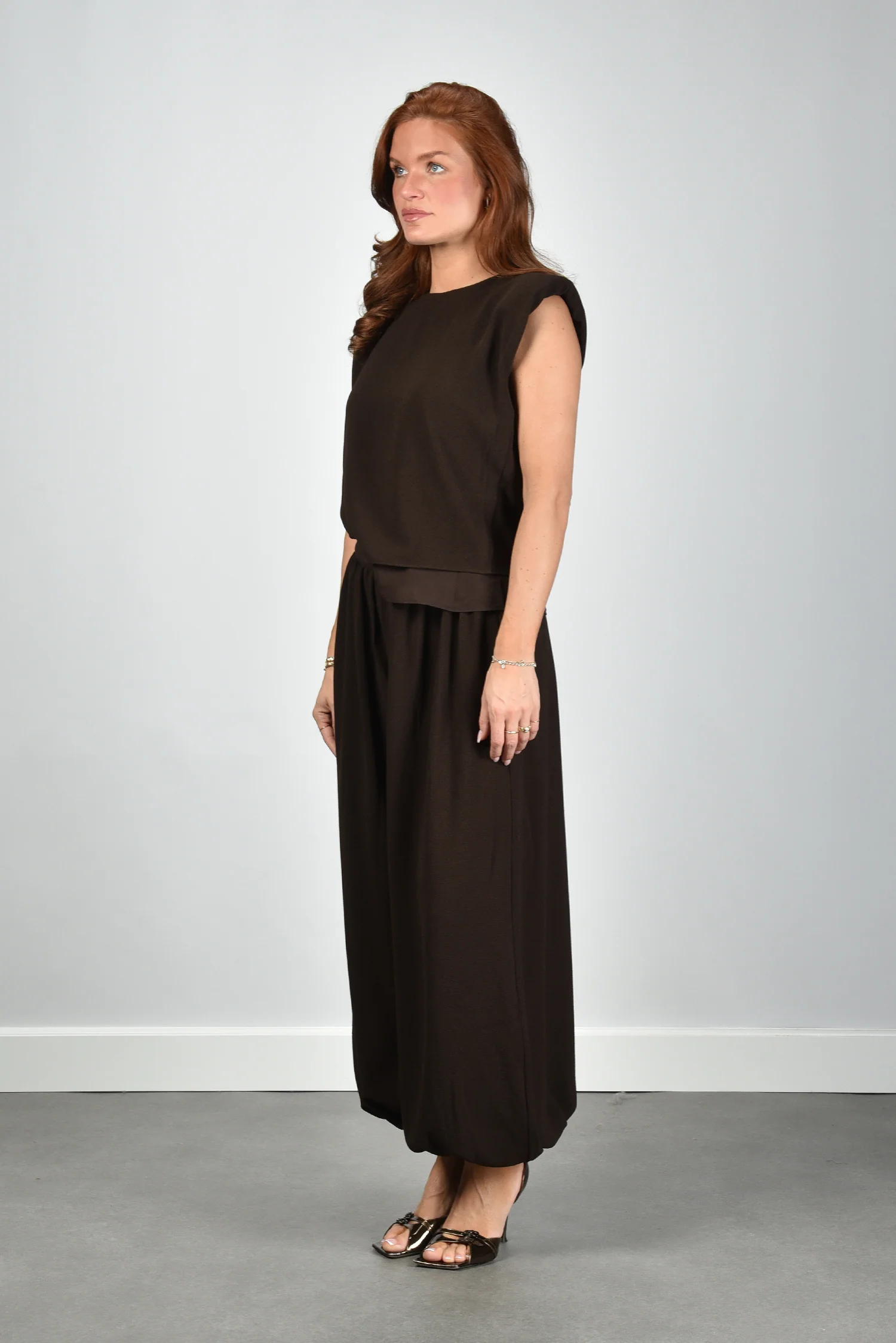 De top met wijde schouders van Rotate heeft die typerende bruin-molé kleur die mooi samenvalt met de gestructureerde schouderlijn. De licht oplopende schouders geven het mouwloze ontwerp een duidelijke vorm, zonder dat het te breed oogt. De rechte pasvorm valt soepel langs het lichaam en het subtiele asymmetrische detail aan de zoom maakt het ontwerp net even spannender. Dankzij de mix van polyester en een vleugje elastaan blijft de stof mooi in vorm. Deze top valt op maat, dus je kunt gewoon je eigen maat kiezen. Combineer hem bijvoorbeeld met de Ganni jas in demitasse voor een gelaagde look met karakter.