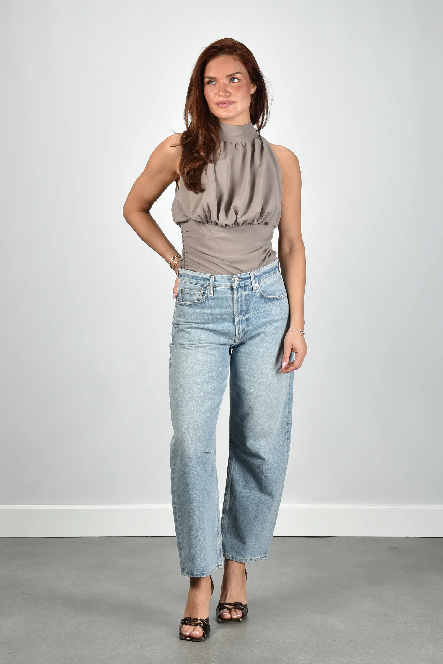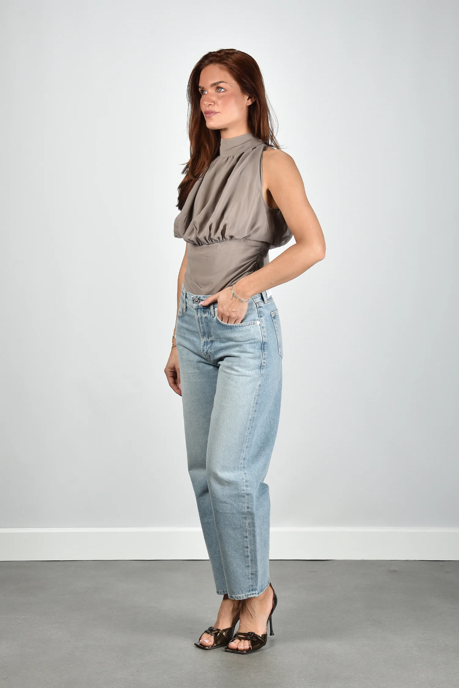 Dit is de sleeveless top bruin van Rotate, een slanke top met een hoge hals en zachte plooien langs de bovenkant. De kleur driftwood geeft een warme, rustige toon die mooi aansluit op de gladde zijkanten. De stof is 100 procent polyester, waardoor de top licht blijft en zijn vorm netjes houdt. Het strikbandje en de ritssluiting aan de achterkant sluiten alles netjes af. De top valt normaal op maat, dus je kunt je eigen maat aanhouden. Rotate staat bekend om uitgesproken partywear met een duidelijke vorm en dat herken je meteen in deze top.