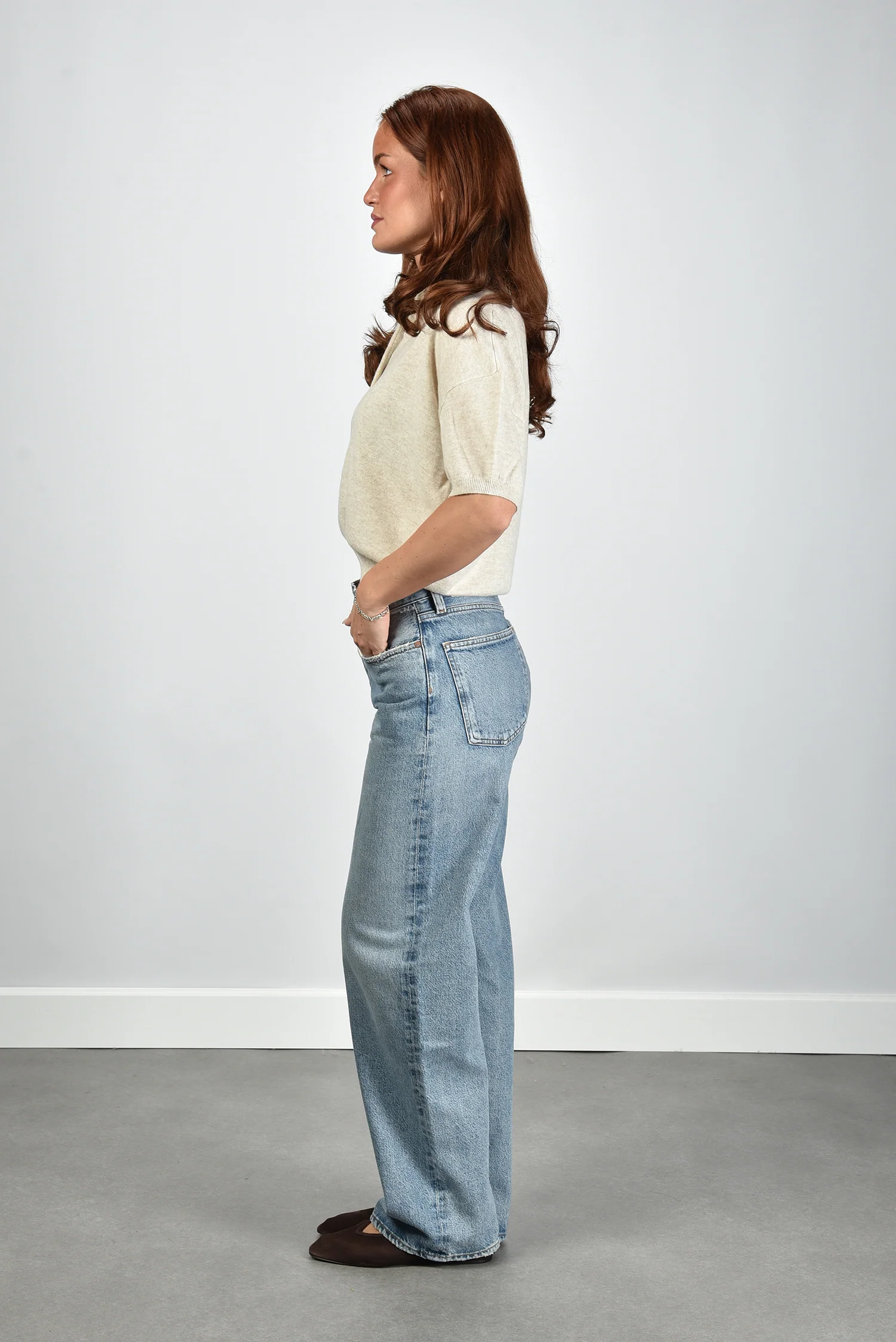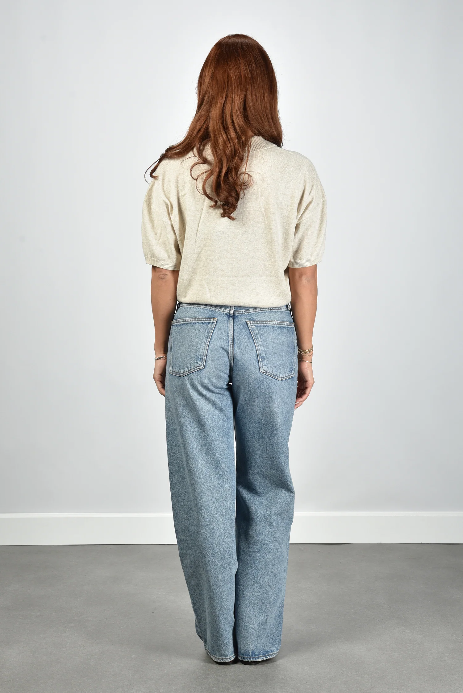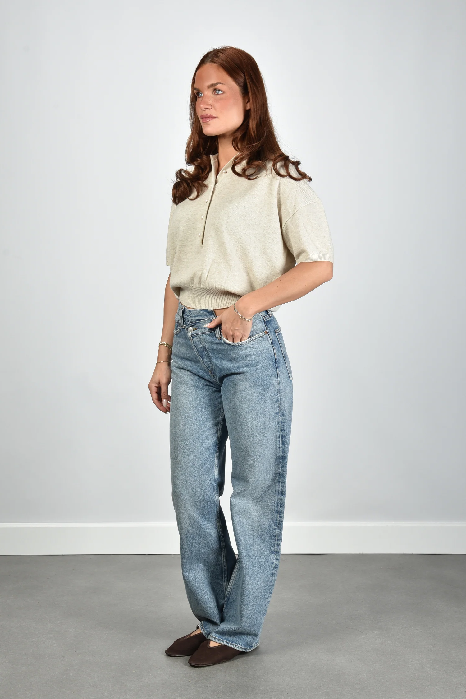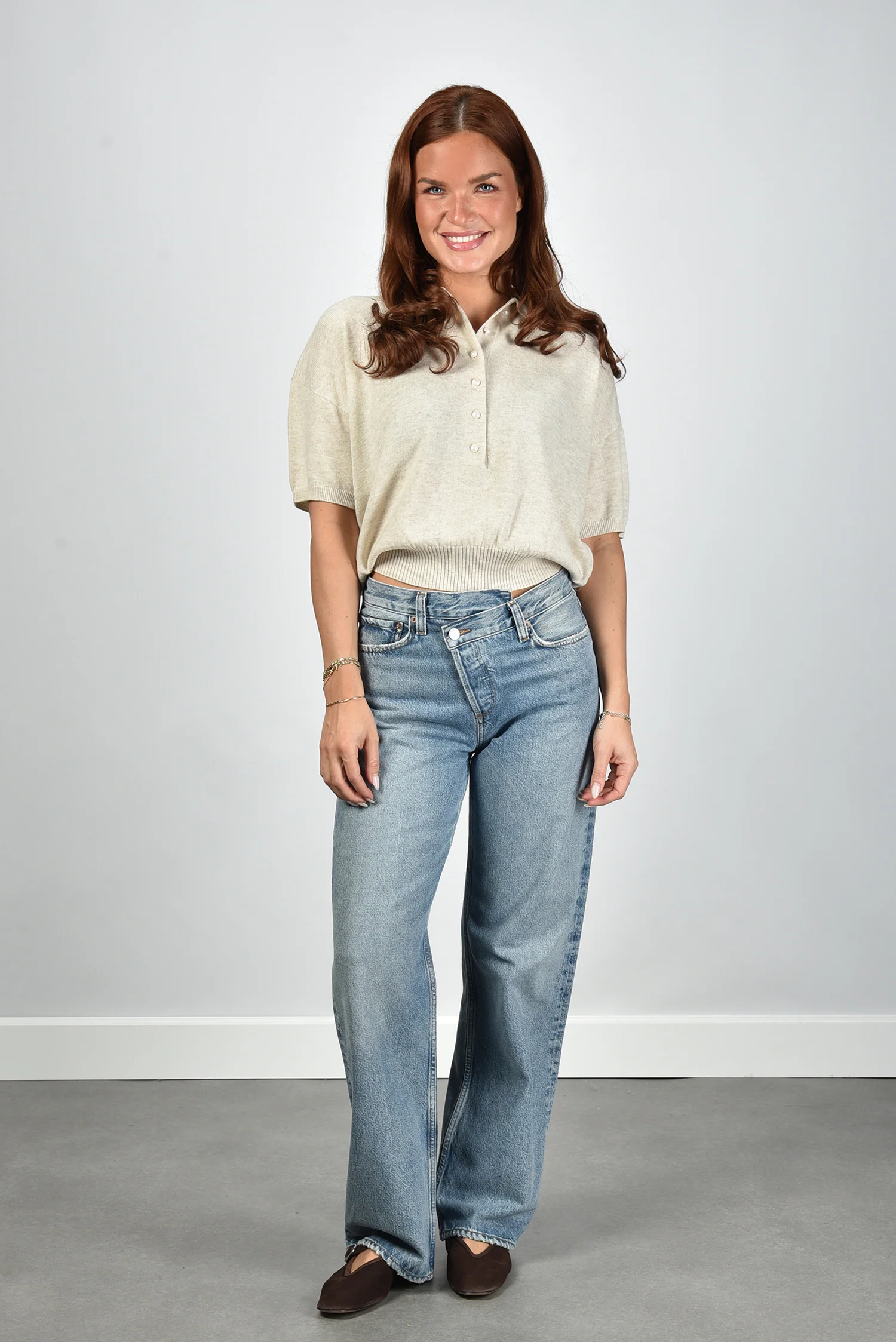 De wollen top Oxford beige van Rotate voelt bijzonder door de combinatie van zachte wol met een vleugje cashmere. De top heeft een rechte cropped snit met een elastische band onderaan die mooi aansluit. De polokraag en de rij knopen zorgen voor een sportief accent met een nette afwerking. De lichte tint, Oxford tan, oogt rustig en past goed bij andere neutrale kleuren. Dankzij de subtiele schoudervulling valt het silhouet mooi in vorm. Deze top valt normaal op maat en draagt stevig zonder zwaar te voelen. Combineer hem met de Le Monde Beryl ballerina’s in chocolate voor een elegante balans tussen stoer en vrouwelijk.