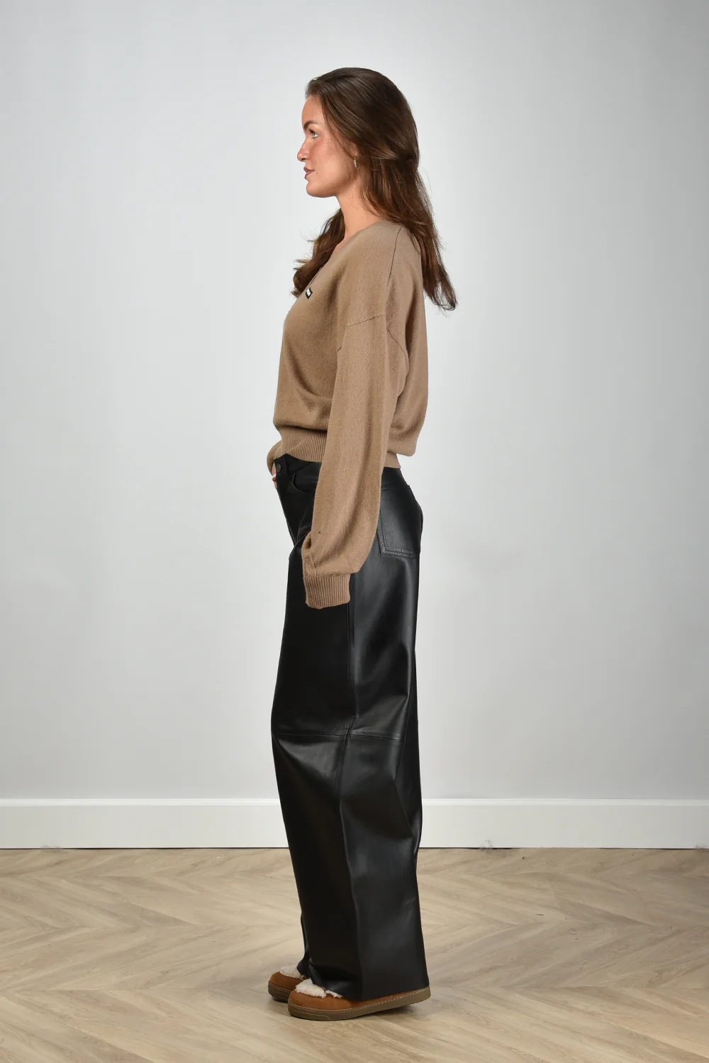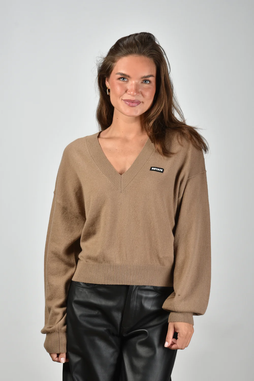 De trui logo patch van Rotate is zo’n basic die direct goed voelt. De beige tint, door het merk portabella genoemd, geeft een zachte en moderne uitstraling. De diepe V-hals met brede ribbelrand maakt hem bijzonder zonder dat het teveel wordt. De losse, rechte pasvorm zit comfortabel en valt netjes op maat. Op de borst staat subtiel het zwarte Rotate label, net genoeg om het merk te herkennen zonder te overheersen. Gemaakt van 95% wol en 5% cashmere voelt de stof soepel en licht aan. Draag hem met de Isabel Marant enkellaarsjes Nowles voor een nonchalante maar verzorgde look.