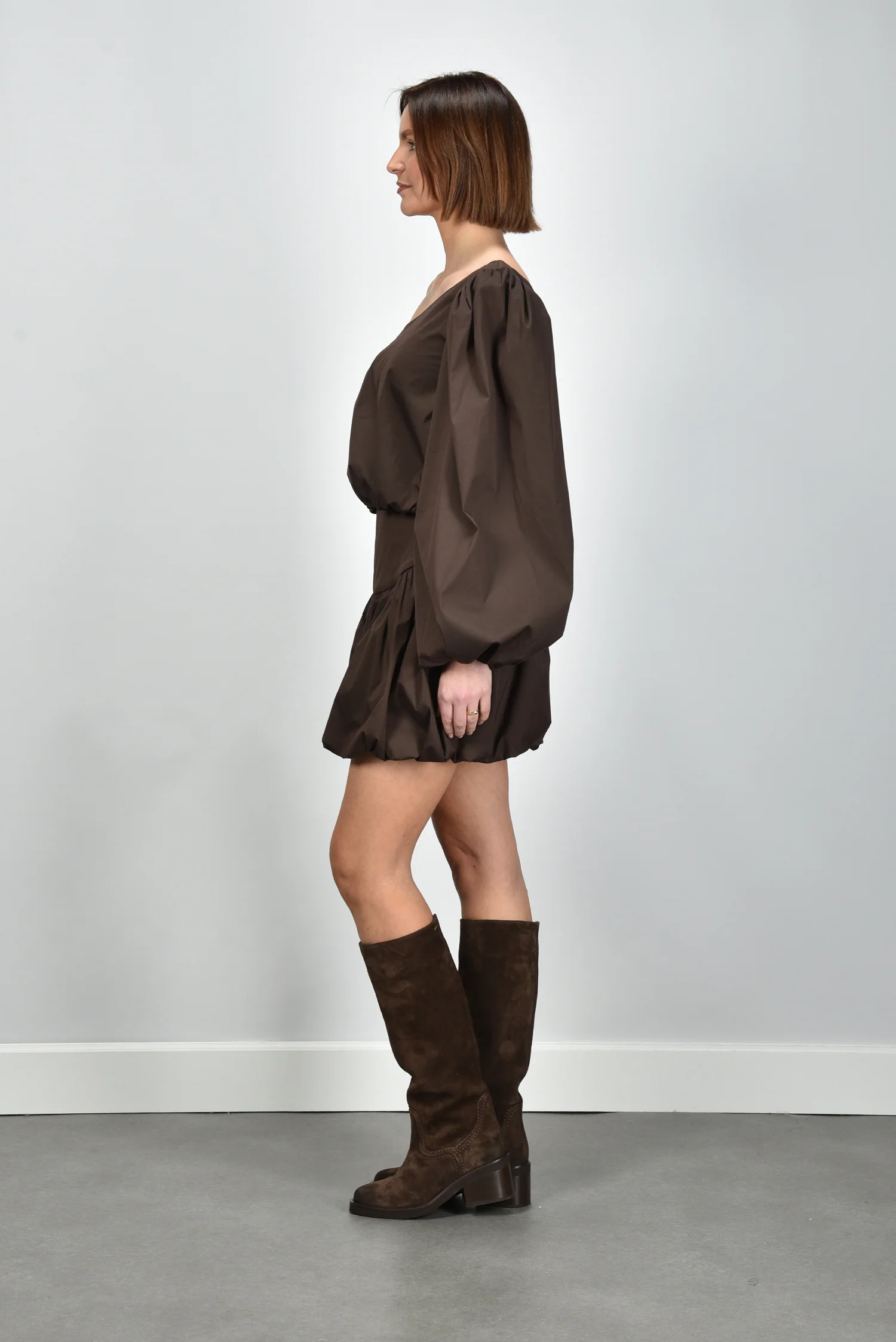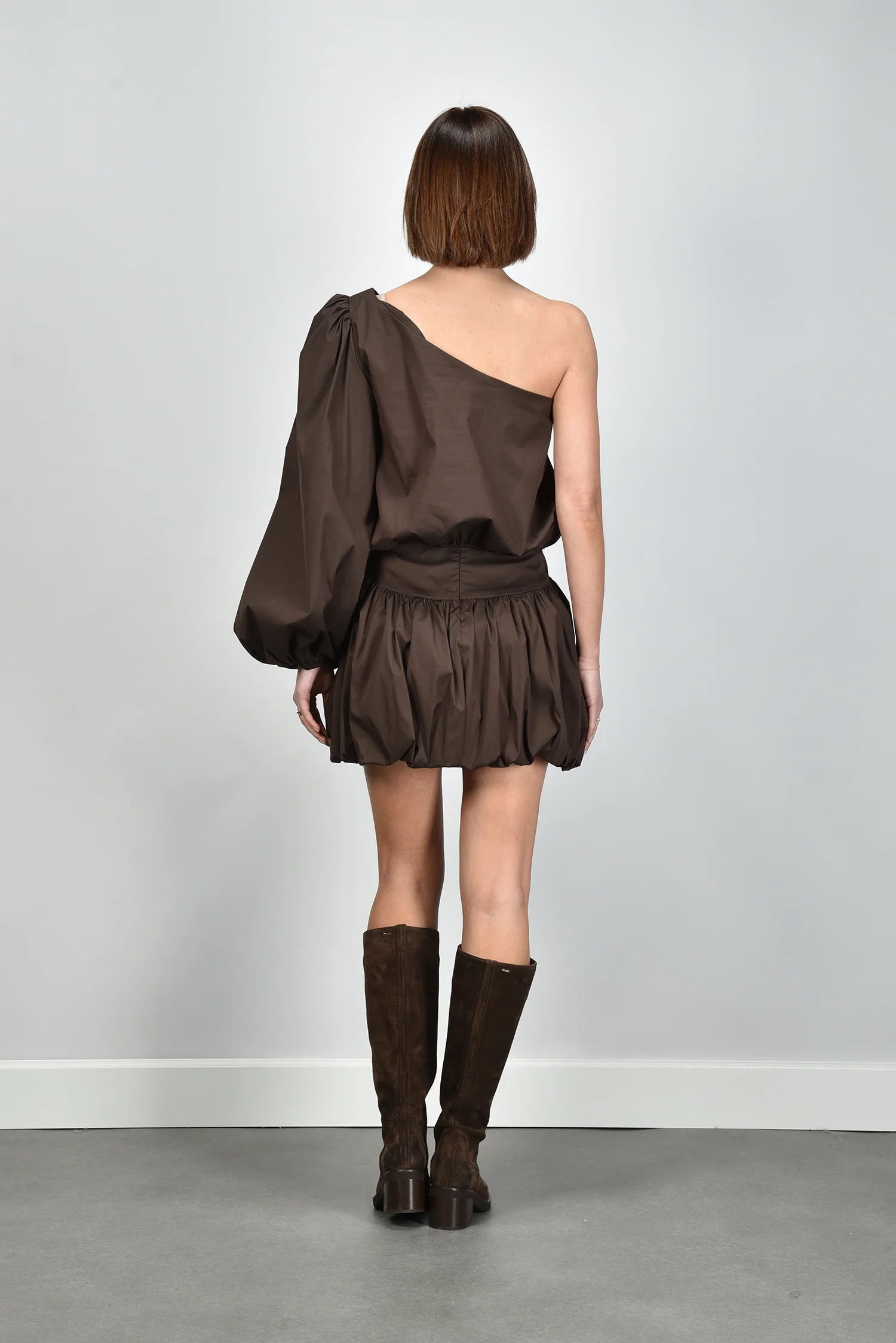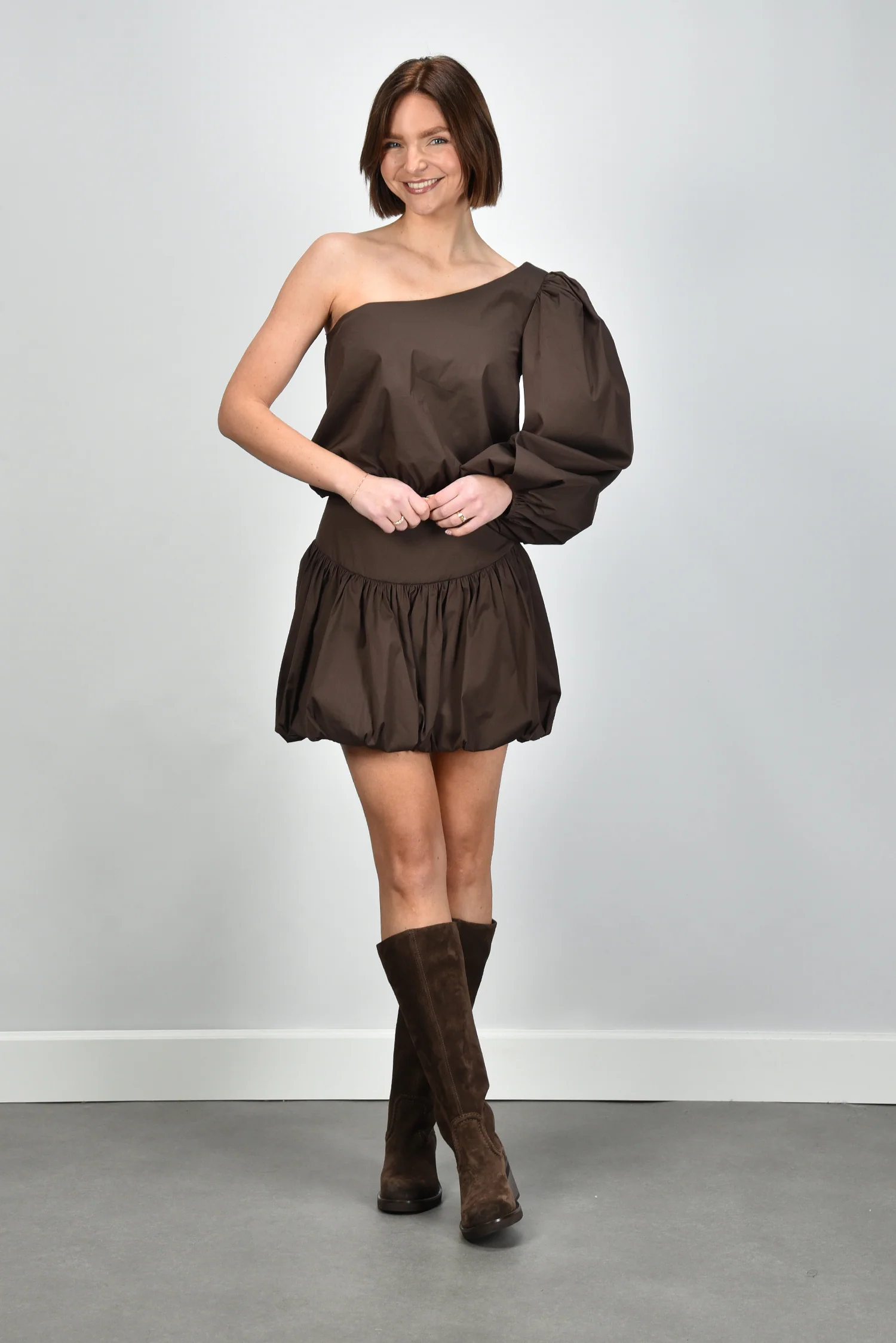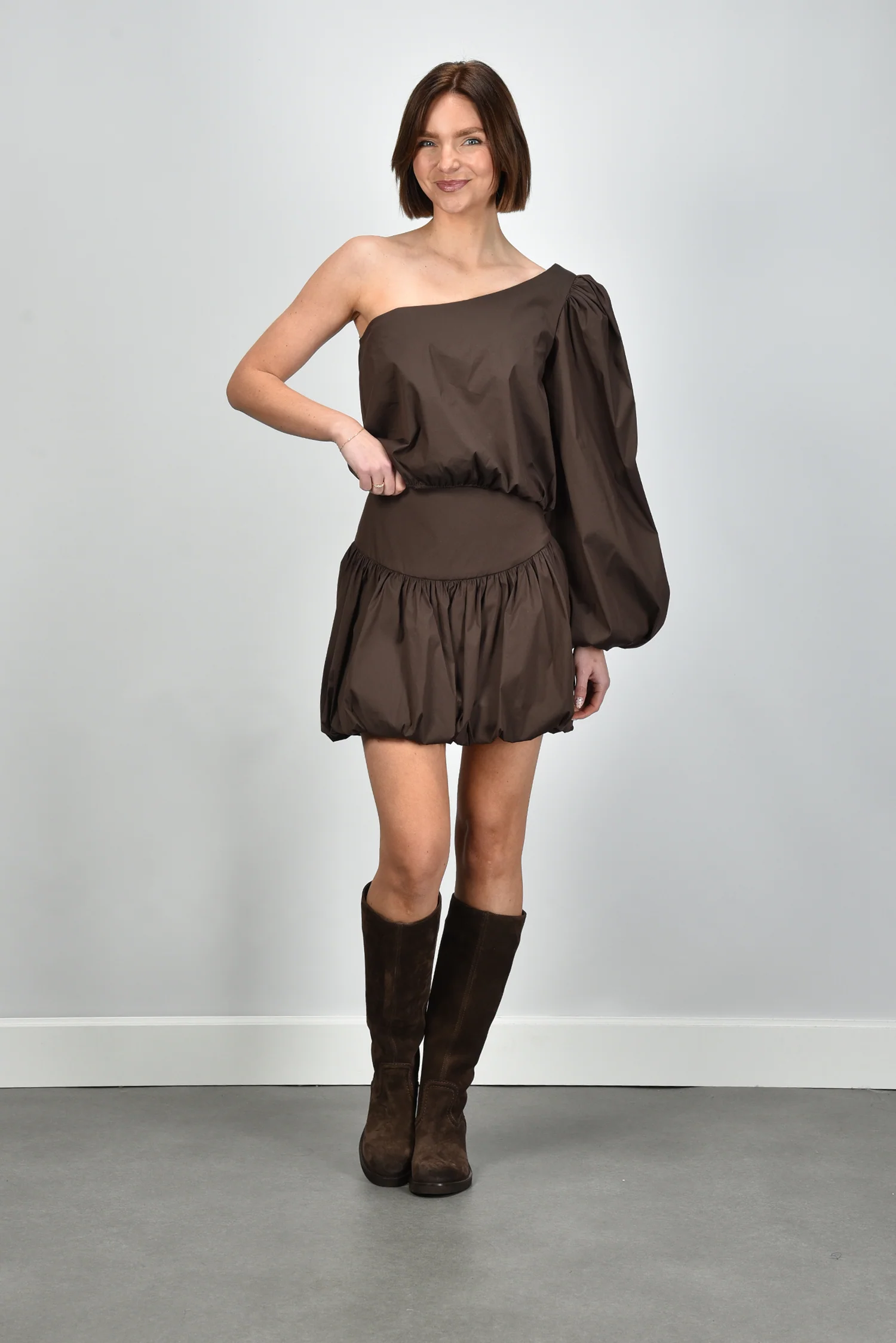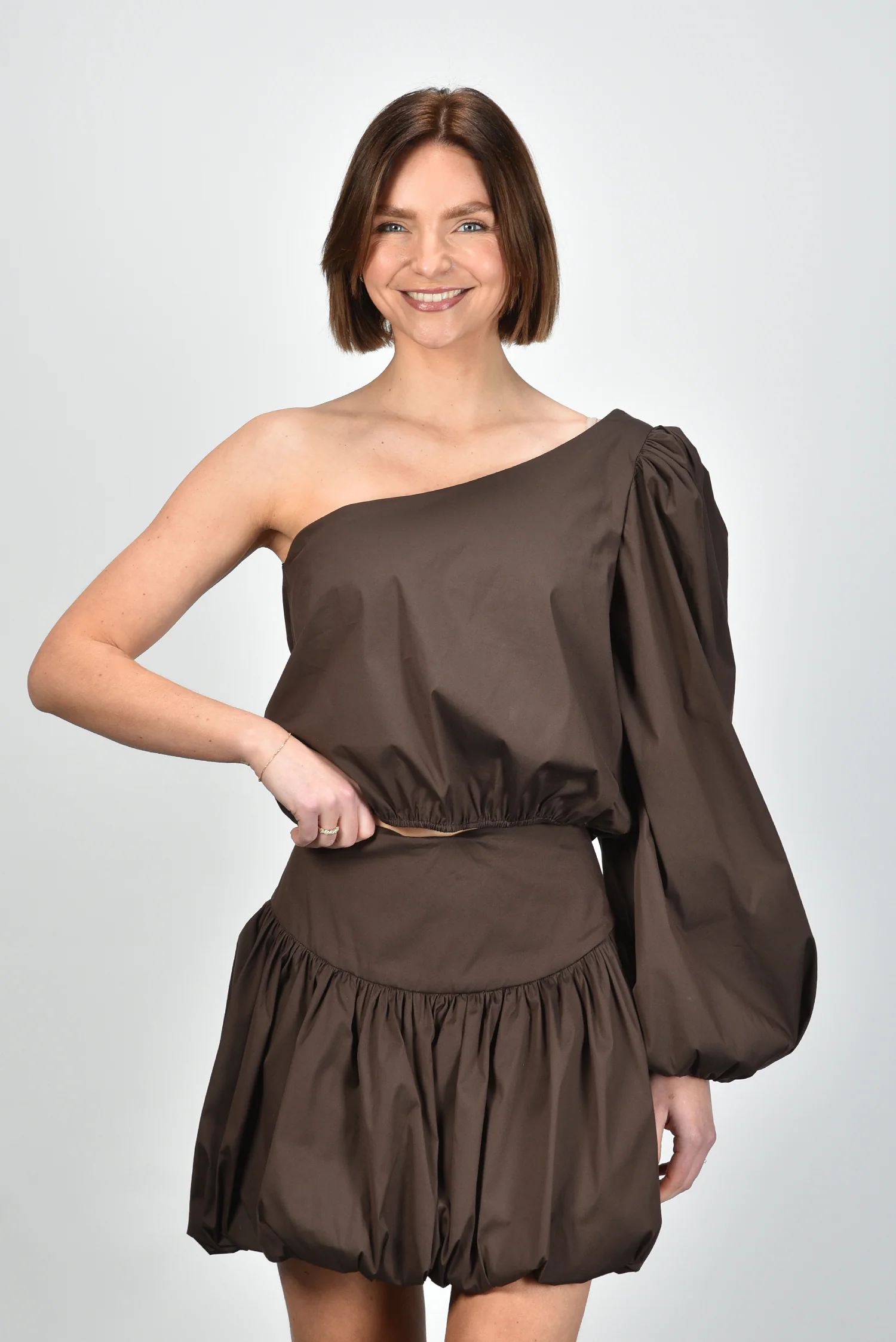 De blouse Noor van Sage & Ivy is een kort, asymmetrisch ontwerp met een opvallende one-shoulder lijn en een volumineuze pofmouw. De elastische band rondom de taille zorgt voor een mooi silhouet en zit comfortabel zonder te knellen. De stofmix met katoen draagt luchtig en voelt prettig aan op de huid. De diepe chocoladebruine tint geeft de blouse een rijke uitstraling die goed past bij de bijpassende Sage & Ivy rok Elvie Short chocolate. Elk ontwerp van Sage & Ivy wordt in Nederland bedacht en geproduceerd in Europese ateliers, met aandacht voor vakmanschap en een bewuste materiaalkeuze. Deze blouse valt normaal op maat, dus je kunt je eigen maat aanhouden.