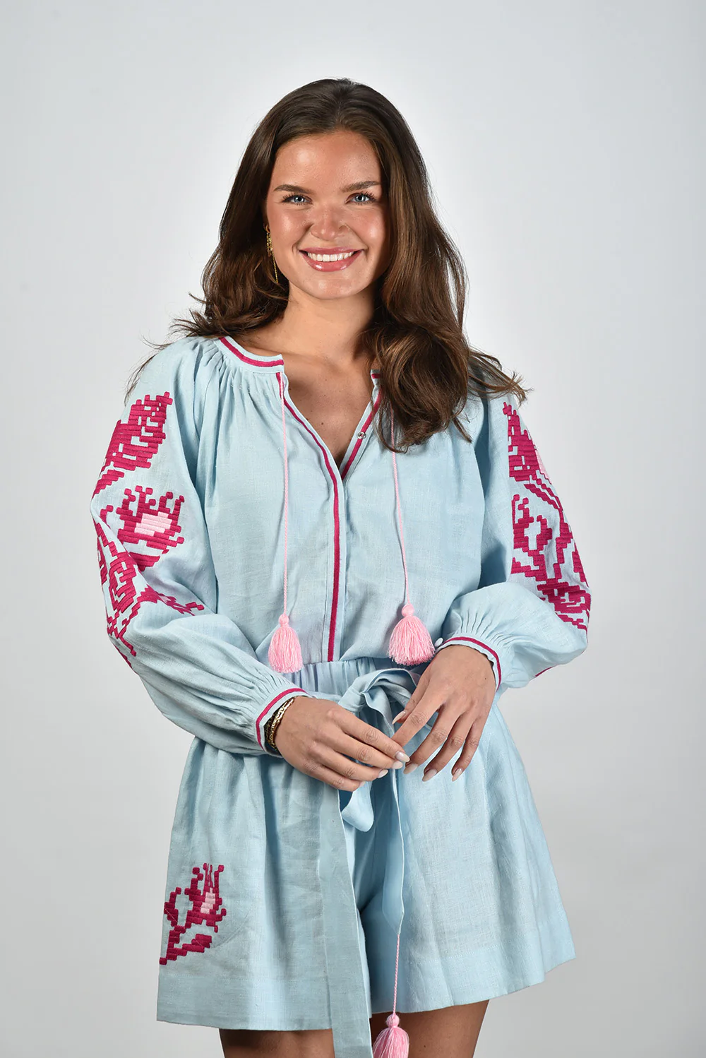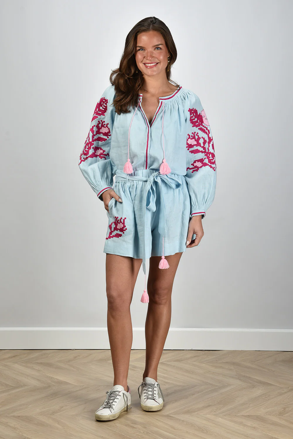 Zie hier de Sage & Ivy blouse Rosa blauw, vervaardigd uit 100% linnen. Deze elegante blouse biedt een normale pasvorm en is perfect voor diverse gelegenheden. Lise draagt maat M en meet 1,73m. Kleur: Blue/Pink. Voor langdurig behoud wordt stomerij aanbevolen. Artikelnummer: Rosa.