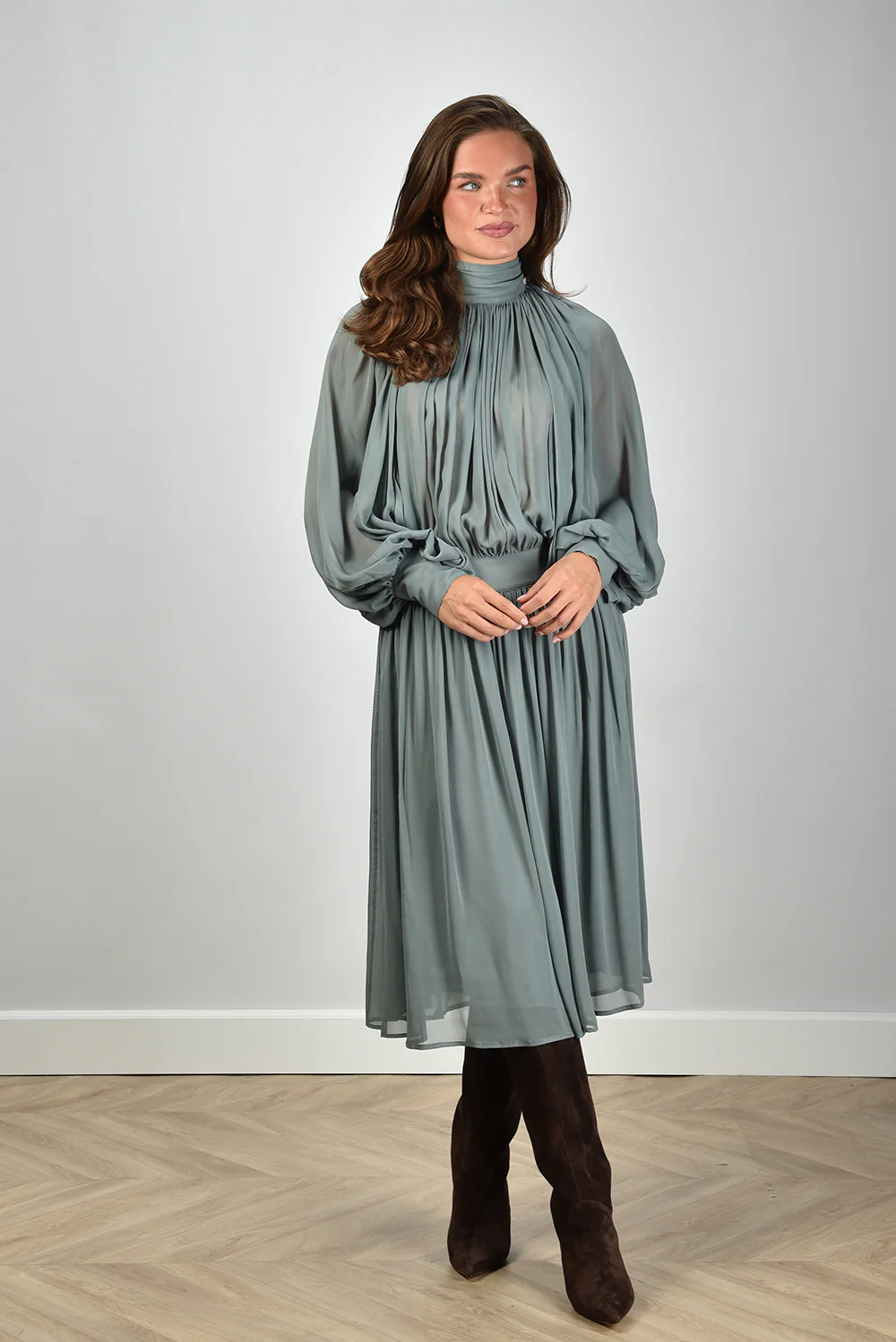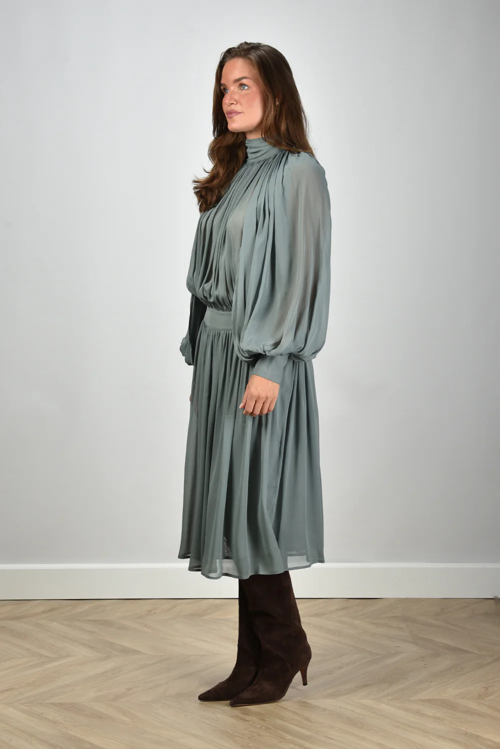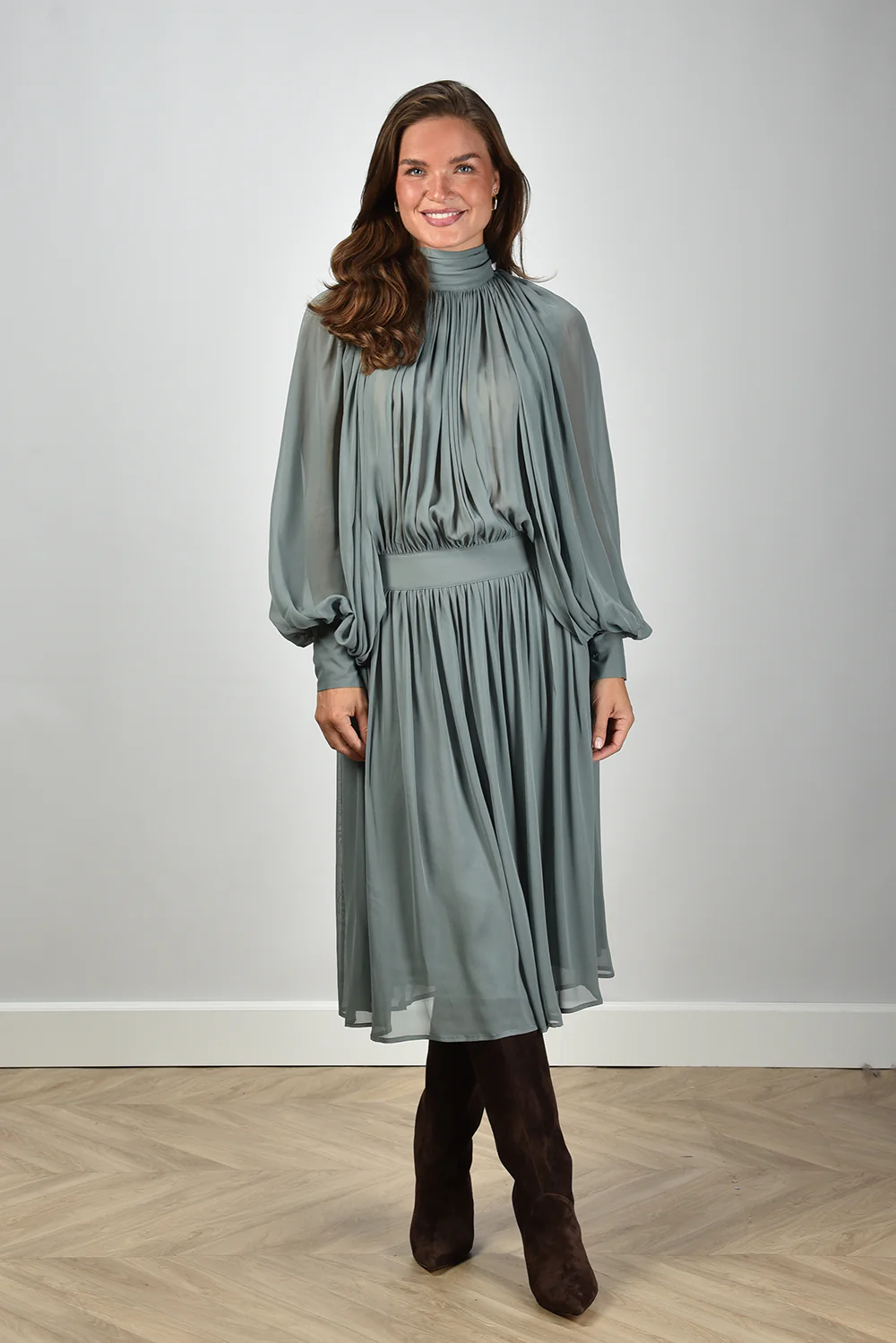 De jurk S5WU11-S69-0 van Semicouture is zo’n stuk dat direct charme uitstraalt. De hoge, geplooide halslijn geeft een elegante lengte, terwijl de transparante mouwen subtiel volume toevoegen. De brede tailleband sluit mooi aan op het lichaam en laat de plooiende rok soepel vallen. De zijdeblend van acetate en zijde heeft een subtiele glans die het groene ‘dew’-tintje extra diepte geeft. Deze jurk valt normaal op maat en draagt comfortabel door de soepele stof. Combineer haar met de Lola Cruz laarzen 012B30BK marron voor een stadslook met karakter.