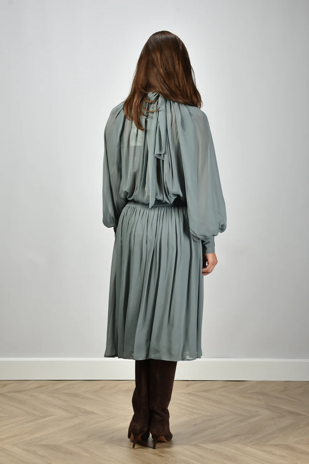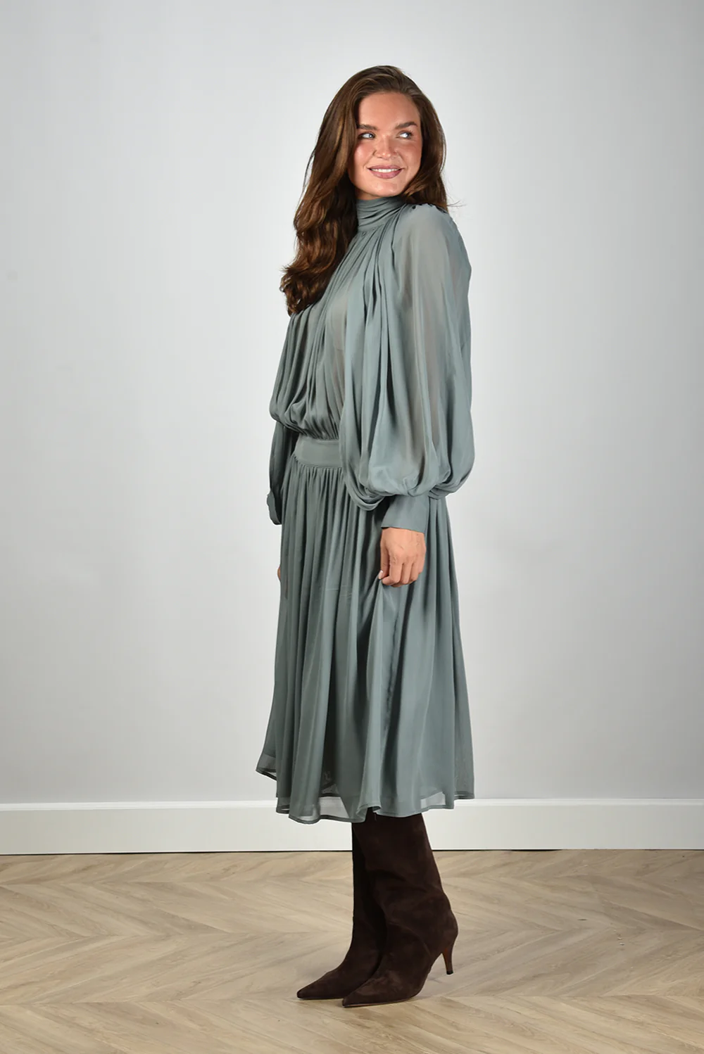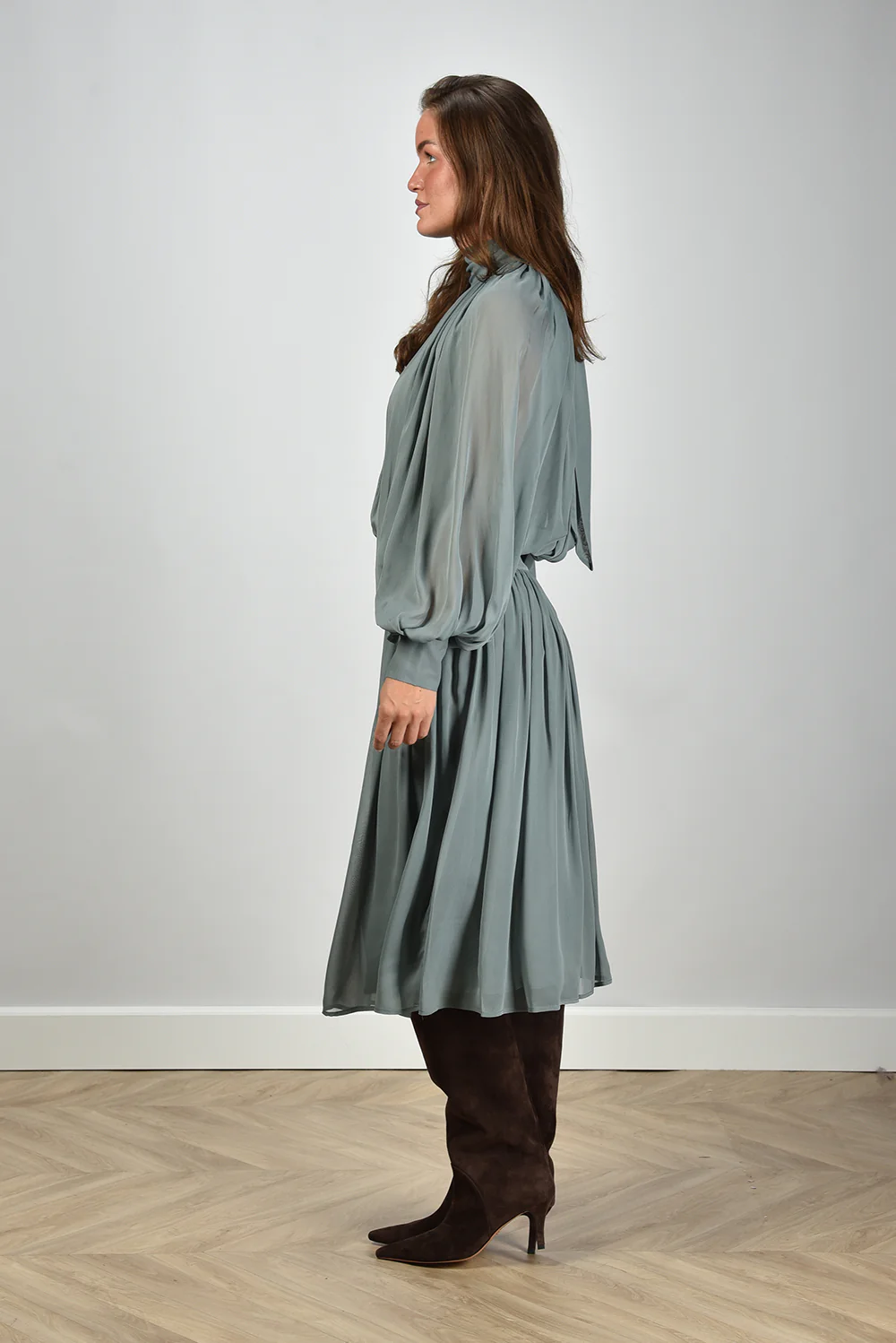 De jurk S5WU11-S69-0 van Semicouture is zo’n stuk dat direct charme uitstraalt. De hoge, geplooide halslijn geeft een elegante lengte, terwijl de transparante mouwen subtiel volume toevoegen. De brede tailleband sluit mooi aan op het lichaam en laat de plooiende rok soepel vallen. De zijdeblend van acetate en zijde heeft een subtiele glans die het groene ‘dew’-tintje extra diepte geeft. Deze jurk valt normaal op maat en draagt comfortabel door de soepele stof. Combineer haar met de Lola Cruz laarzen 012B30BK marron voor een stadslook met karakter.
