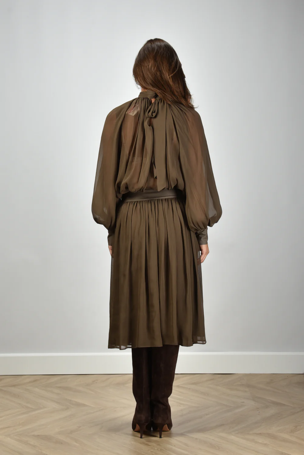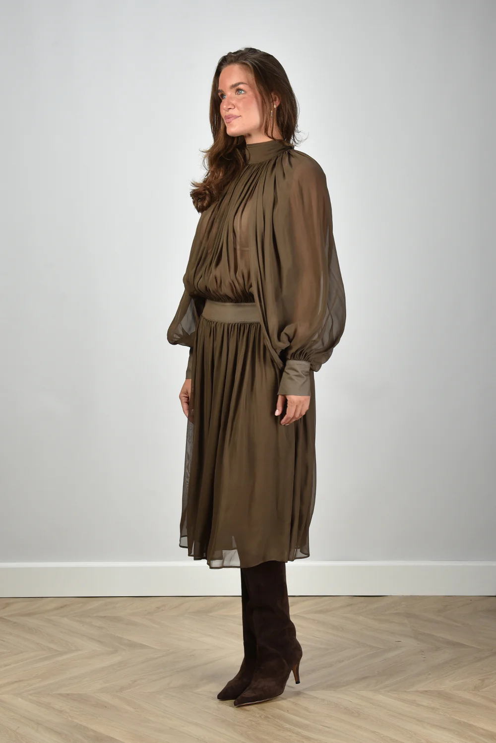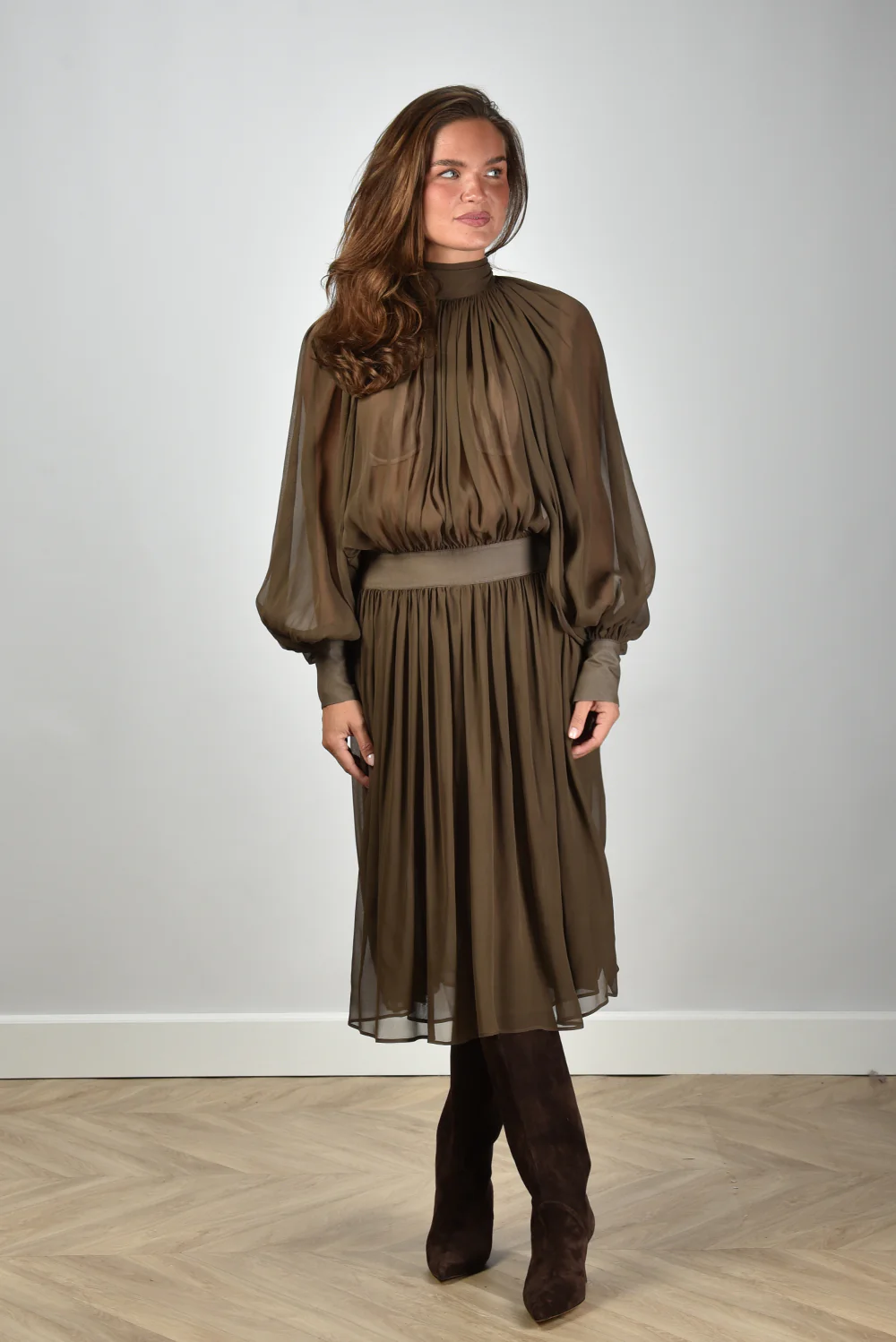 De jurk in silk blend van Semicouture valt direct op door haar gebalanceerde snit en rijke stof. De bruintint, ook wel pecan genoemd, geeft het model een warme diepte. De lichte glans van zijde in de mix met acetate zorgt dat de stof soepel valt en prettig aanvoelt. De hoge hals met plooival accentueert de elegantie op een subtiele manier, terwijl de brede tailleband het silhouet mooi definieert. De wijde, transparante mouwen met strakke manchetten voegen een luchtig contrast toe. Deze jurk valt normaal op maat en combineert goed met de Lola Cruz laarzen in avellana voor een complete, stadse look. Semicouture laat met dit ontwerp zien hoe Italiaanse stijl en draagbare luxe sterk samenkomen.