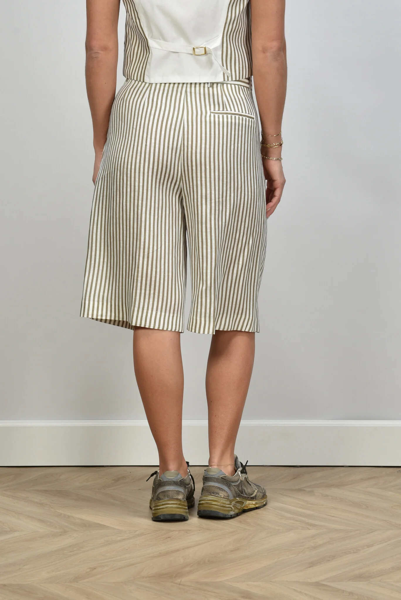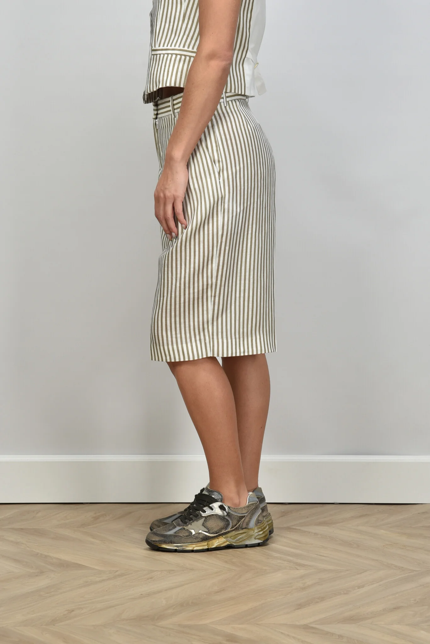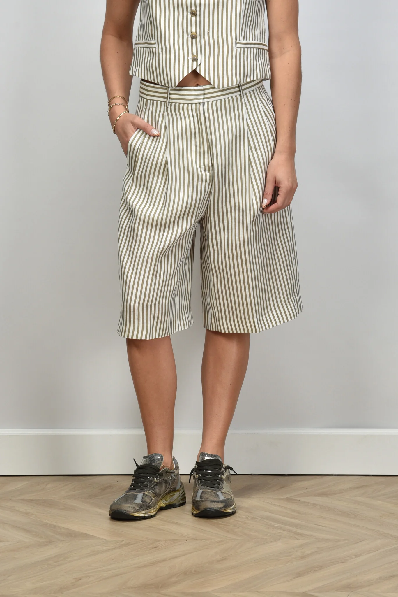 Zie hier de Semicouture short riga betulla taupe, vervaardigd uit 100% linnen voor een luxueuze uitstraling. Dit model biedt een normale pasvorm en is ideaal voor diverse gelegenheden. De kleurcombinatie van grijs/taupe, groen en wit voegt verfijning toe aan uw garderobe. Artikelnummer: S5SS15-R097