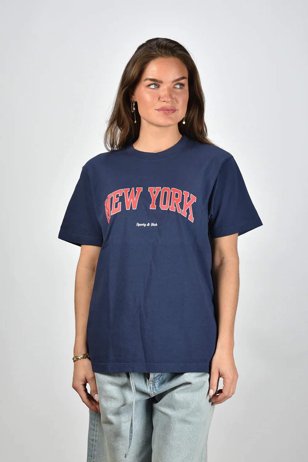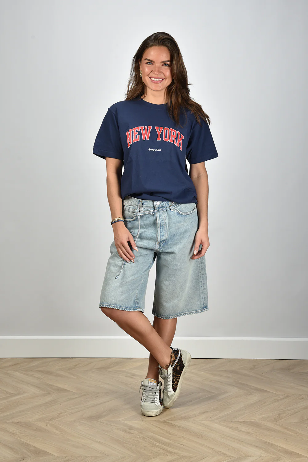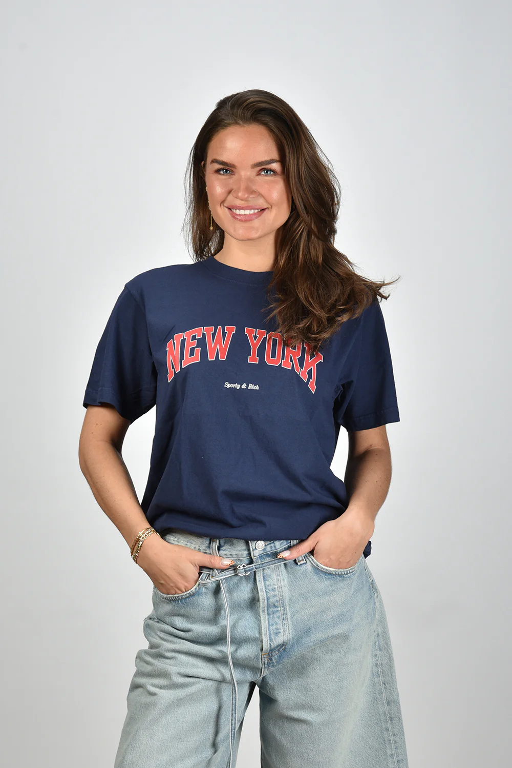 Hier zie je het T shirt New York Ivy blauw van Sporty & Rich. Het donkerblauwe katoen voelt stevig en soepel tegelijk. De rechte pasvorm valt rustig langs het lichaam en houdt de vorm mooi. Op de borst staat de rode boogvormige New York print, met daaronder een kleine witte merktekst die het geheel strak afwerkt. De heldere kleuren steken fris af tegen de Dark Navy achtergrond. Sporty & Rich staat bekend om eenvoudige ontwerpen met een slimme twist en dat zie je hier meteen terug. Het shirt valt volgens de normale pasvorm richtlijn.