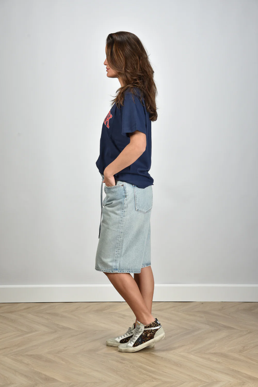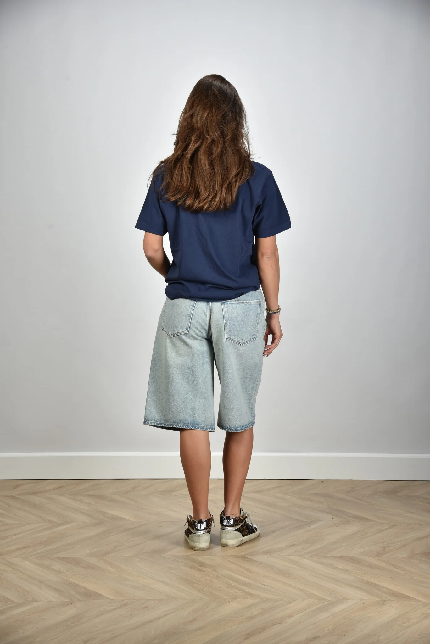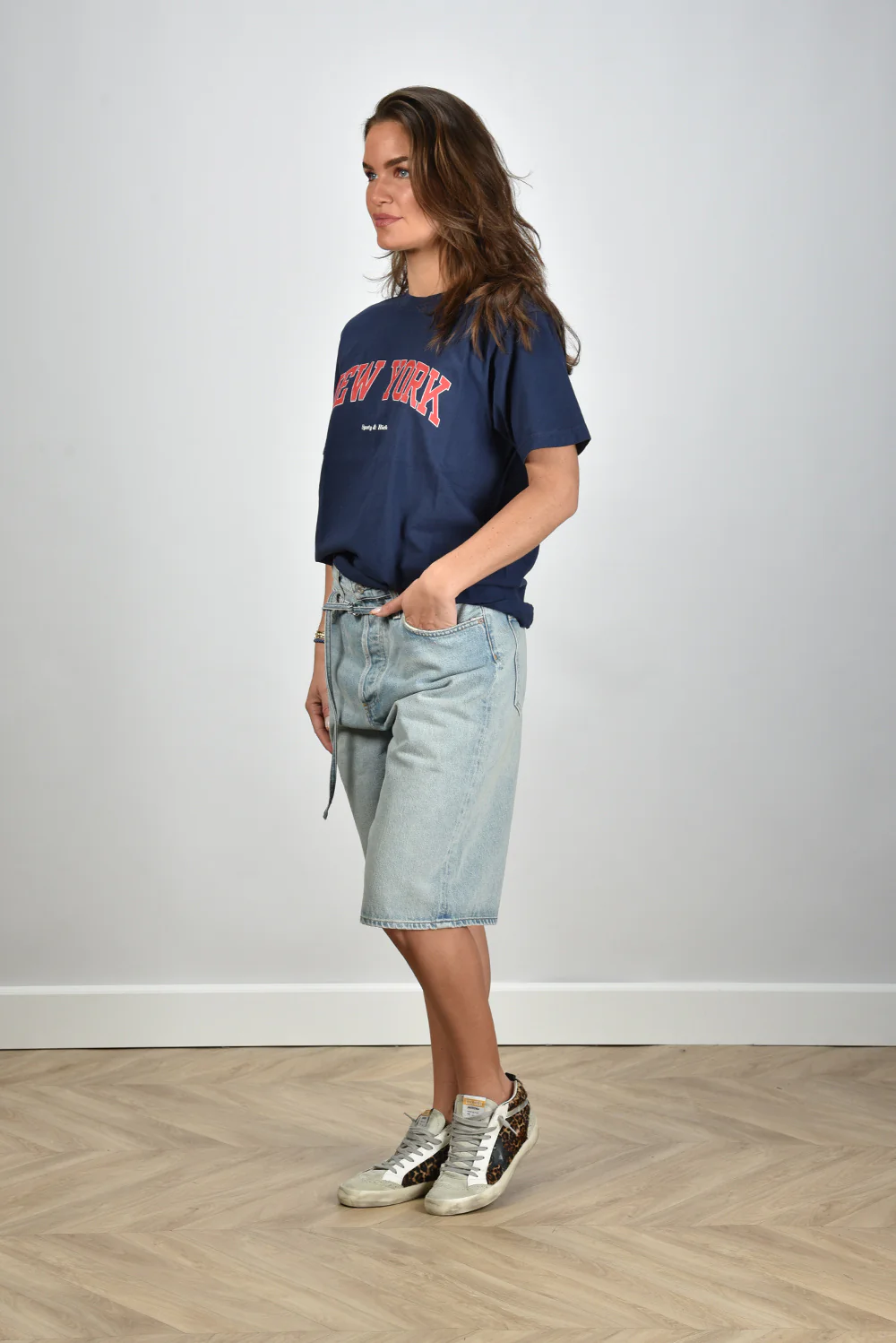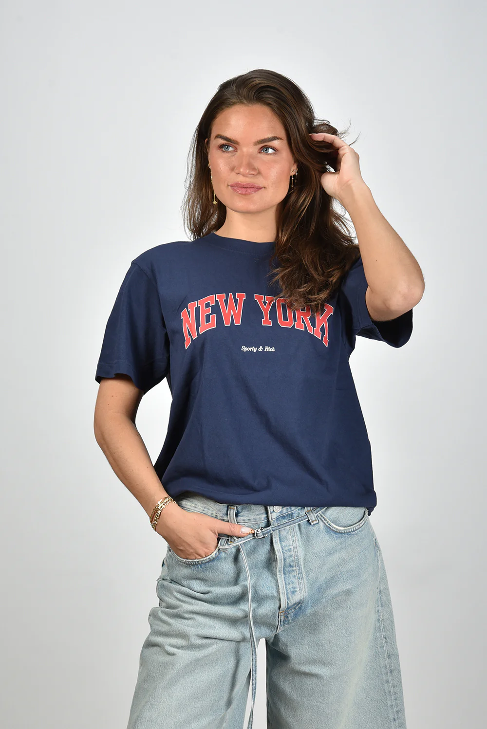 Hier zie je het T shirt New York Ivy blauw van Sporty & Rich. Het donkerblauwe katoen voelt stevig en soepel tegelijk. De rechte pasvorm valt rustig langs het lichaam en houdt de vorm mooi. Op de borst staat de rode boogvormige New York print, met daaronder een kleine witte merktekst die het geheel strak afwerkt. De heldere kleuren steken fris af tegen de Dark Navy achtergrond. Sporty & Rich staat bekend om eenvoudige ontwerpen met een slimme twist en dat zie je hier meteen terug. Het shirt valt volgens de normale pasvorm richtlijn.