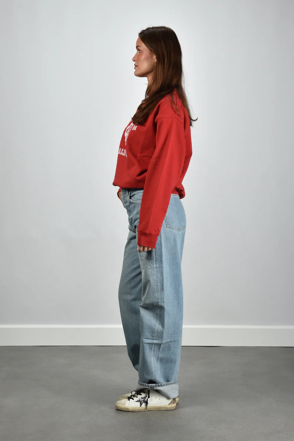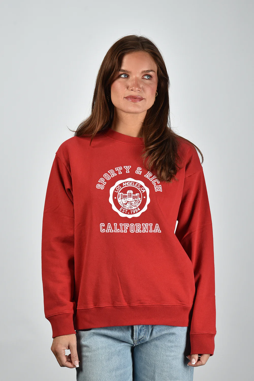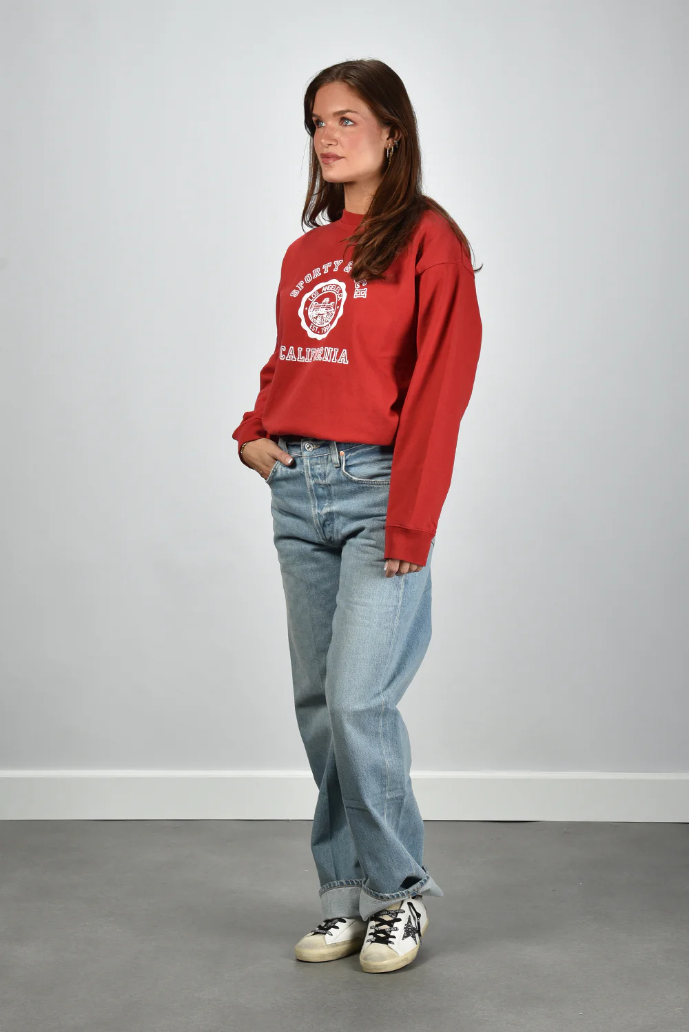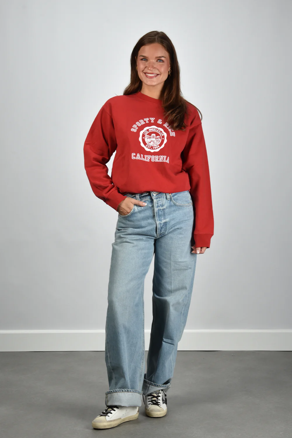 De trui California Emblem van Sporty & Rich heeft de herkenbare vintage sportuitstraling waar het merk om bekendstaat. De ruby rode kleur springt eruit en de witte print op de borst geeft een frisse, klassieke twist. De ronde afbeelding met tekst erboven en eronder maakt het ontwerp speels en duidelijk. De trui is gemaakt van 100% katoen, wat zorgt voor een aangename stevigheid en een prettige draagervaring. Het rechtvallende model met lange mouwen heeft een relaxte pasvorm die op maat valt. Draag de trui casual met de jeans Ayla van Citizens of Humanity voor een ontspannen, maar doordachte look.