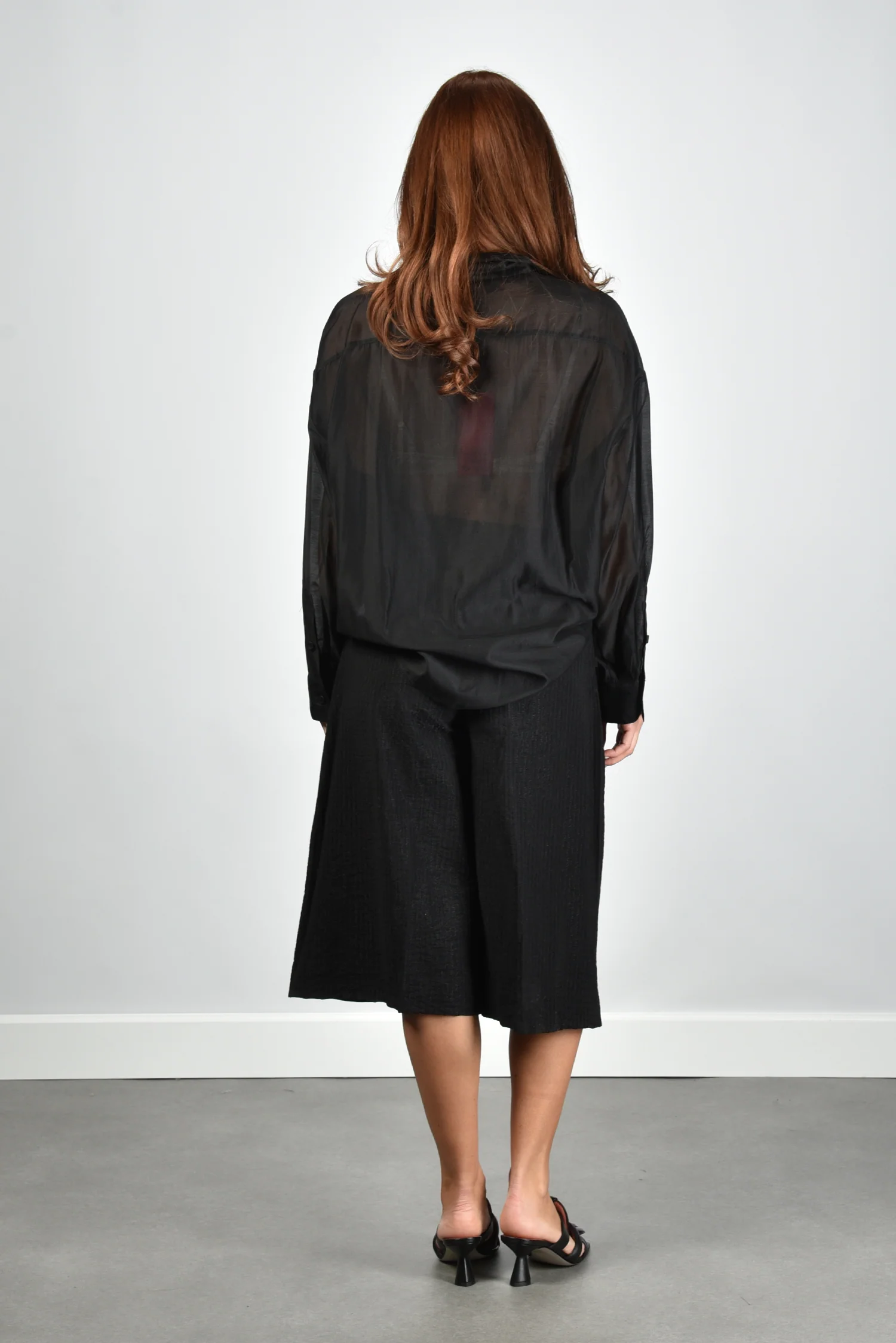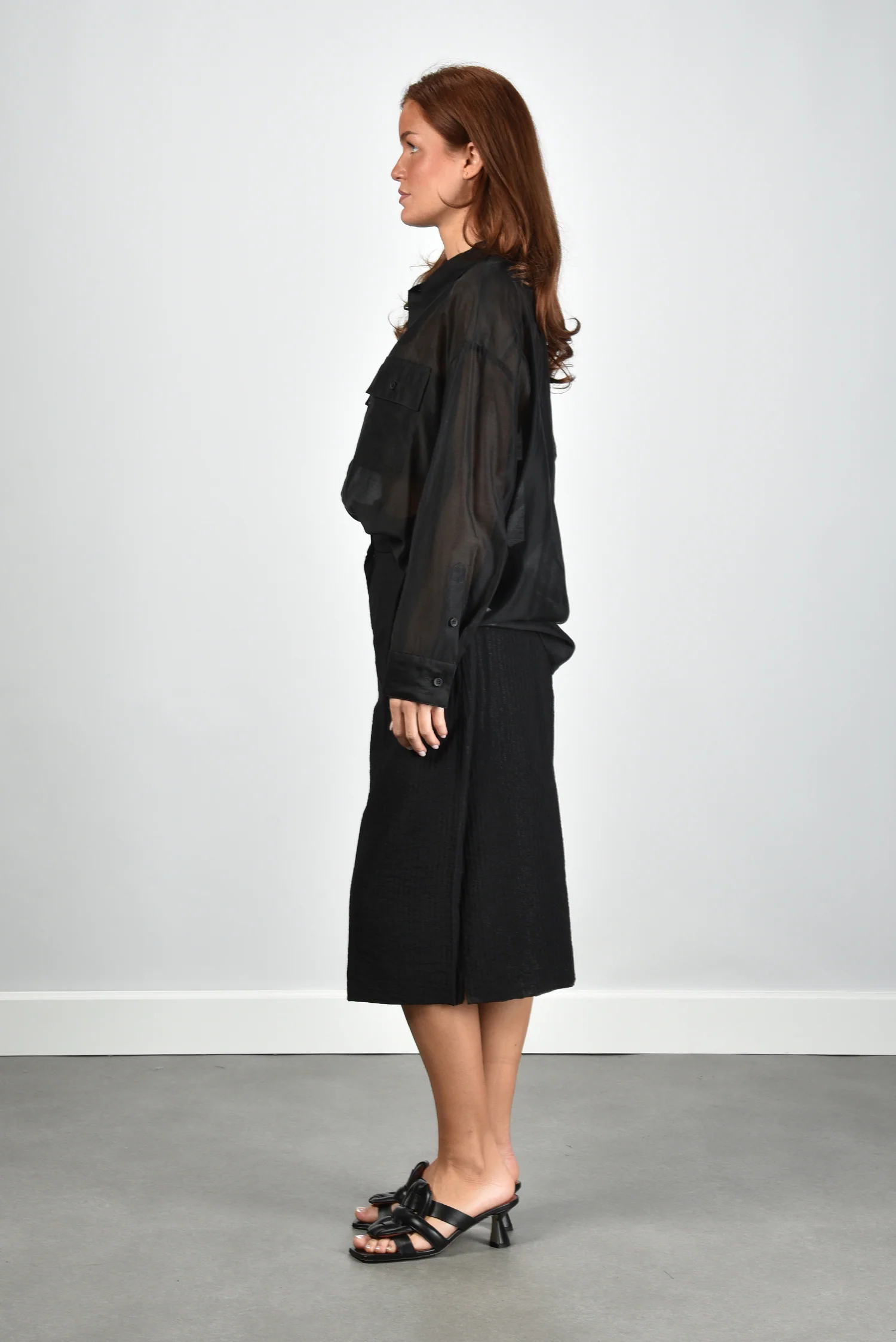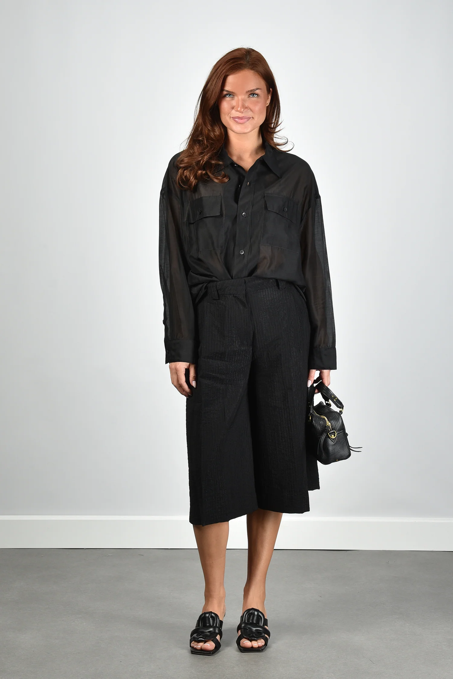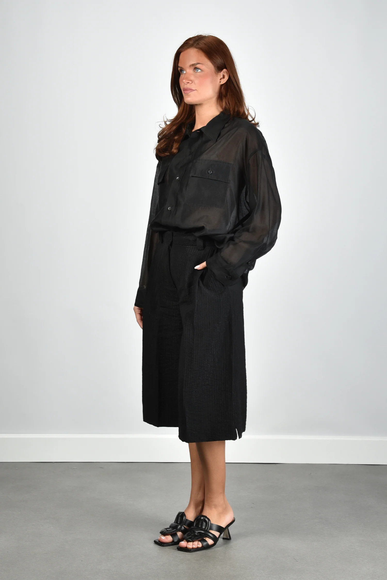 De short Dakota van The Latest is een stijlvolle bermudashort met een hoog aangesloten taille en wijde pijpen. De zwarte stof heeft een subtiele glans en toont de geplooide structuur mooi wanneer je loopt. Dankzij de mix van viscose en polyamide voelt het materiaal soepel en blijft de vorm goed behouden. De ritssluiting aan de voorkant zorgt voor een nette afwerking. Draag de short Dakota met de blouse Daria van The Latest voor een elegante set die stijl en eenvoud combineert. De short valt normaal op maat, dus kies gerust je gebruikelijke maat.