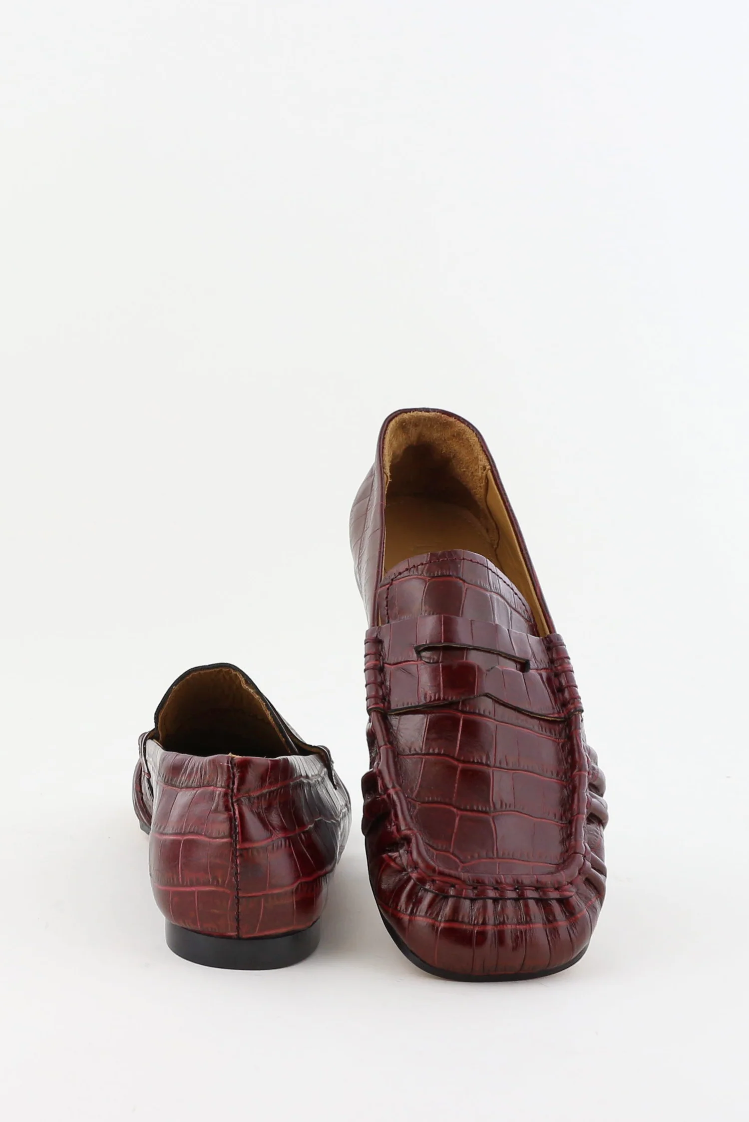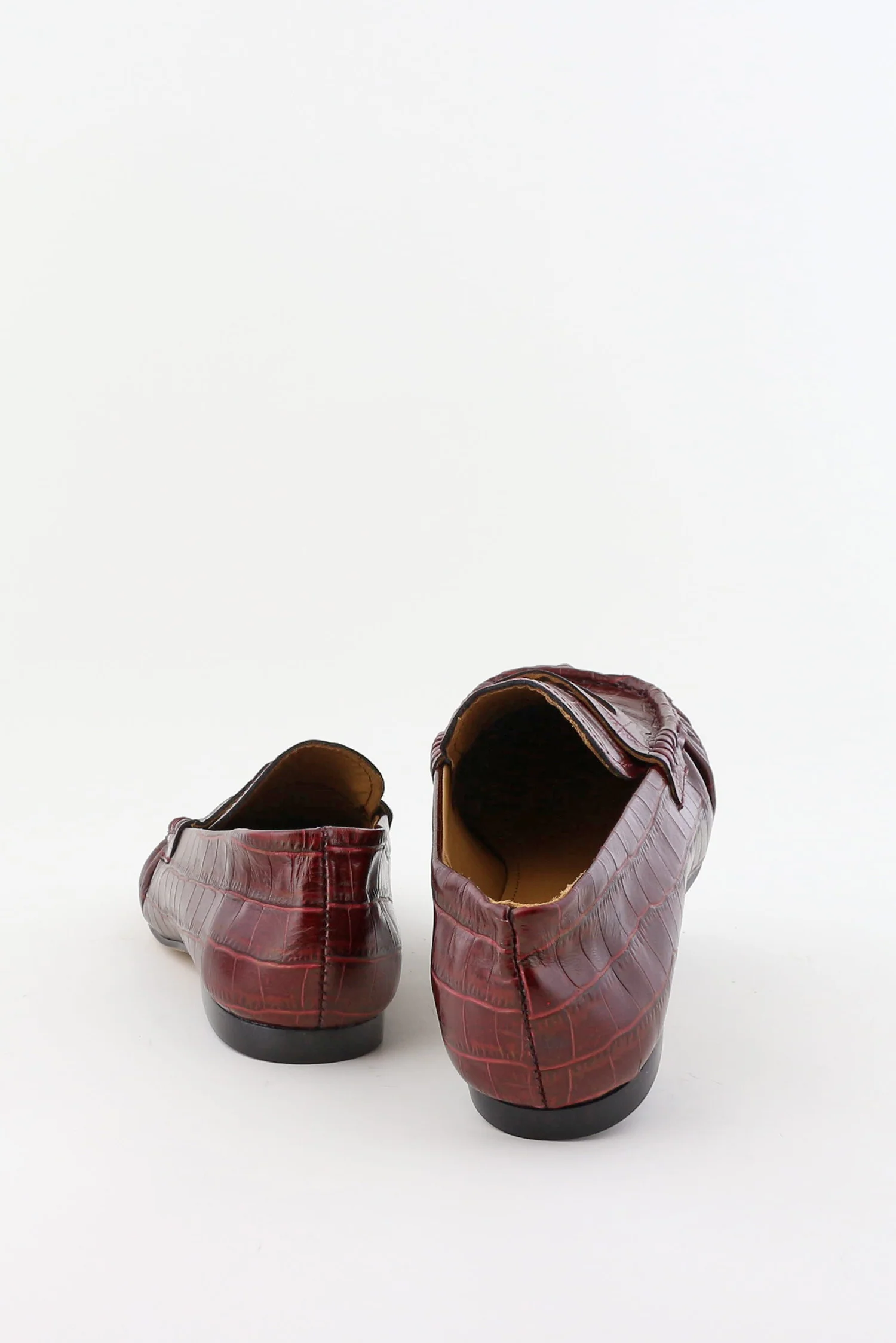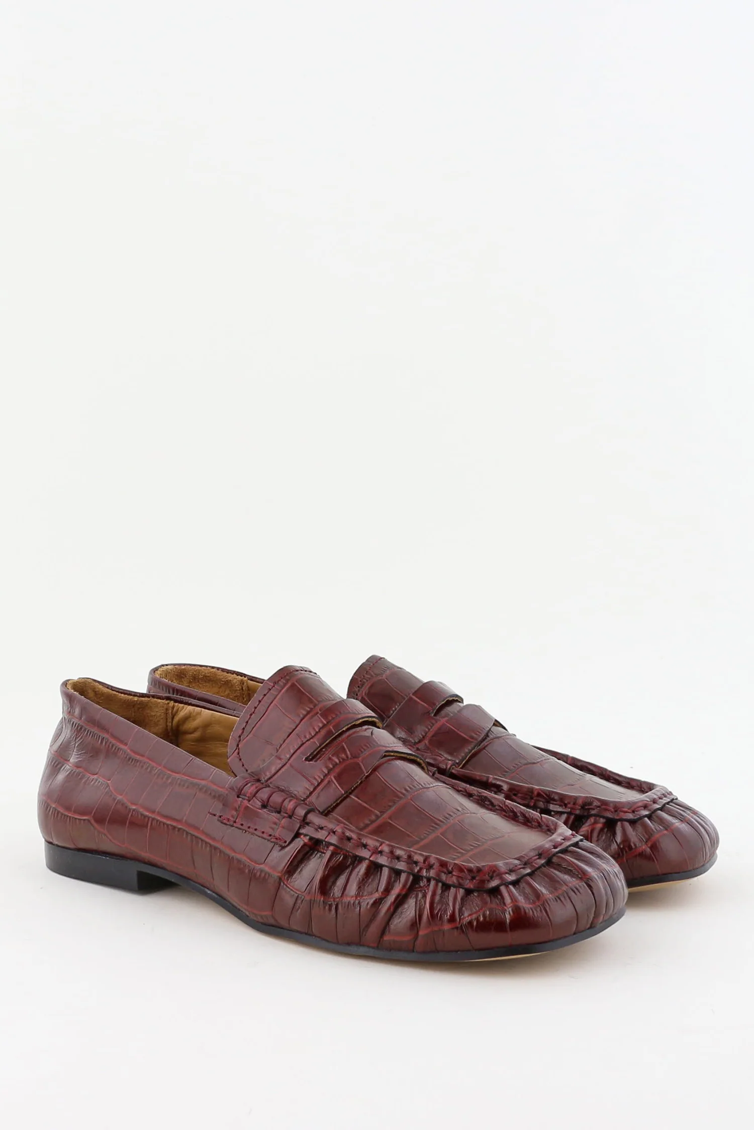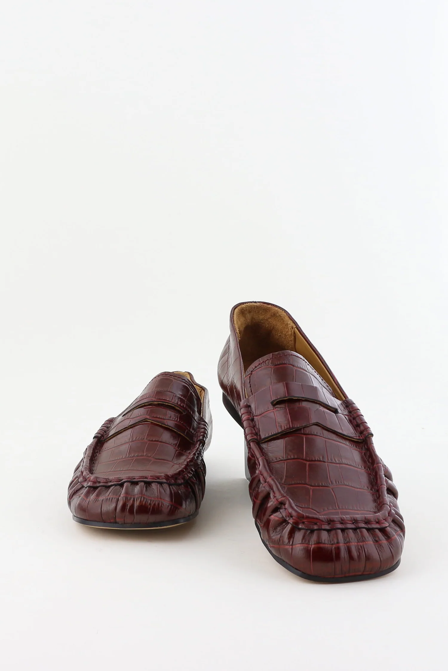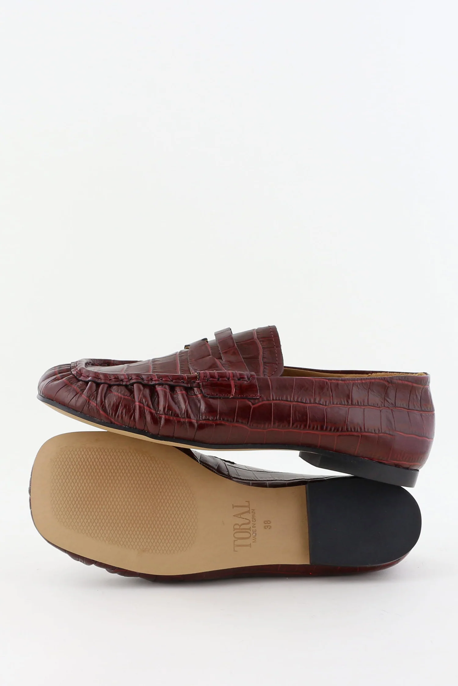 Dit zijn de loafers met vierkante neus rood van Toral. Het diepe bordeaux, ook wel coco lirio borgona, heeft een zachte glans en laat het geprinte leer goed uitkomen. Het krokodillenpatroon geeft structuur en voelt stevig aan, met duidelijke naden langs de vierkante neus voor een strakke vorm. De schoen sluit soepel rond de voet en blijft licht genoeg voor lange dagen. Toral staat bekend om hun minimalistische silhouetten en zorg voor materiaal, en dat merk je hier meteen aan de nette afwerking. Ze vallen normaal op maat, dus je kunt uitgaan van je gebruikelijke maat.