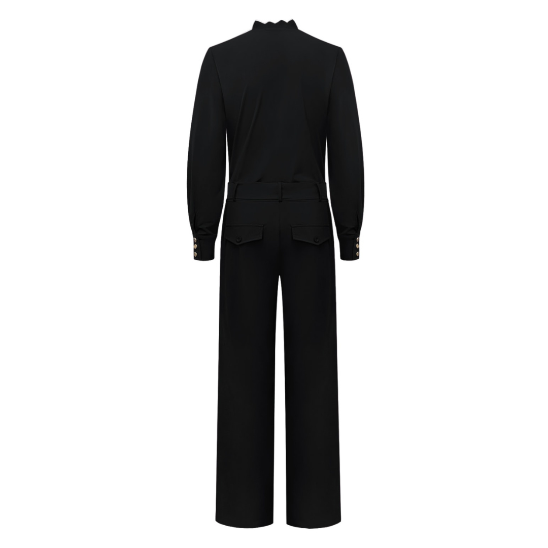 - Stijlvolle jumpsuit van comfortabele travelstof met een V-hals en een gouden rits. De broek heeft wijde pijpen en de mouwen zijn afgewerkt met manchetten met drie gouden knoopjes.