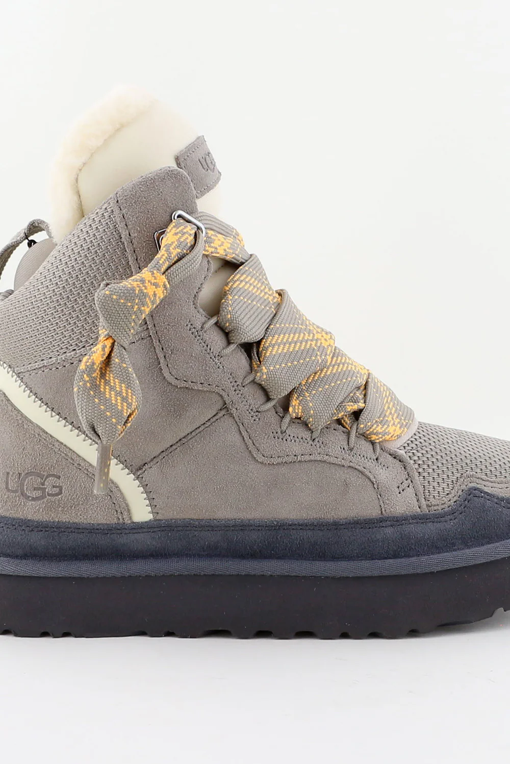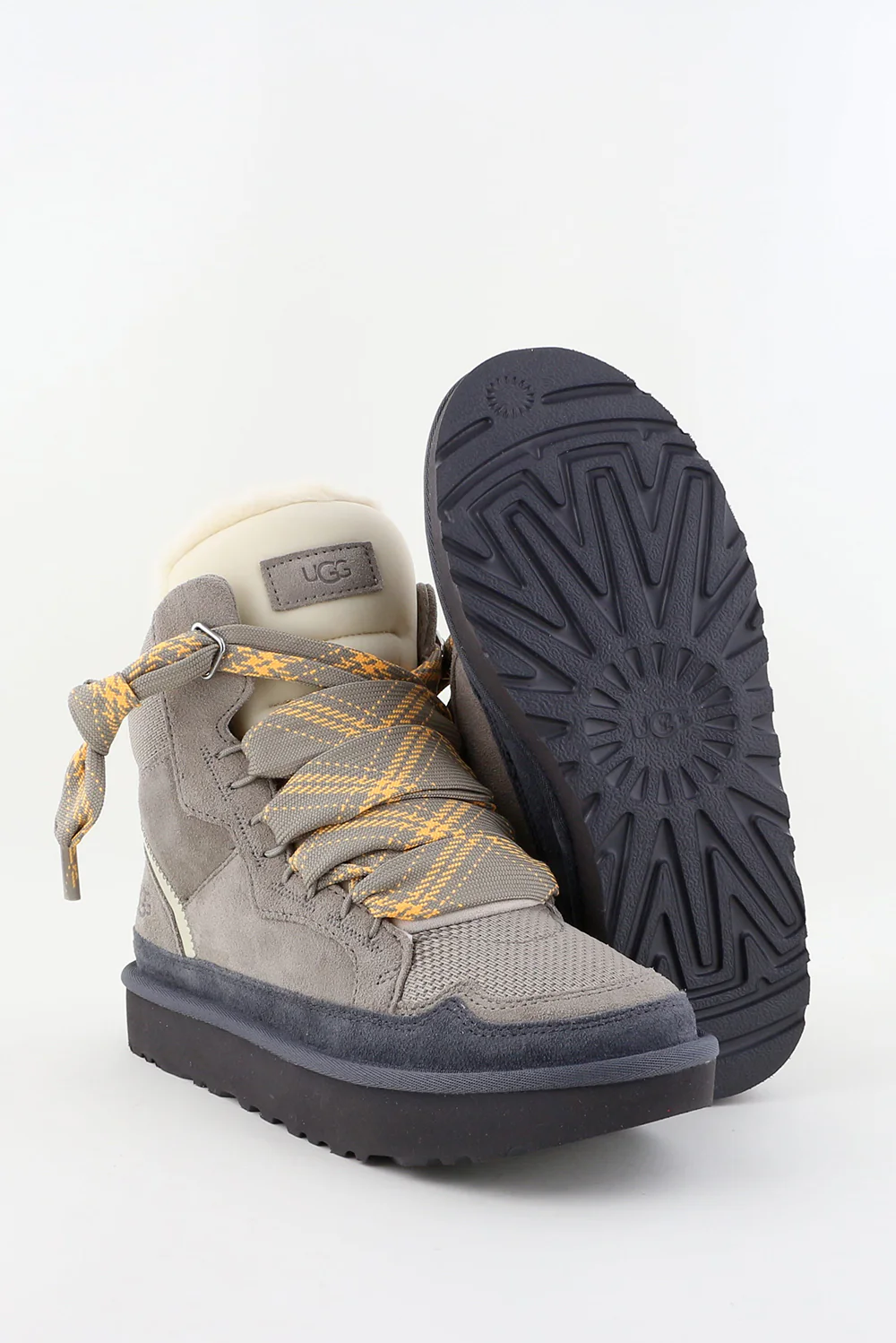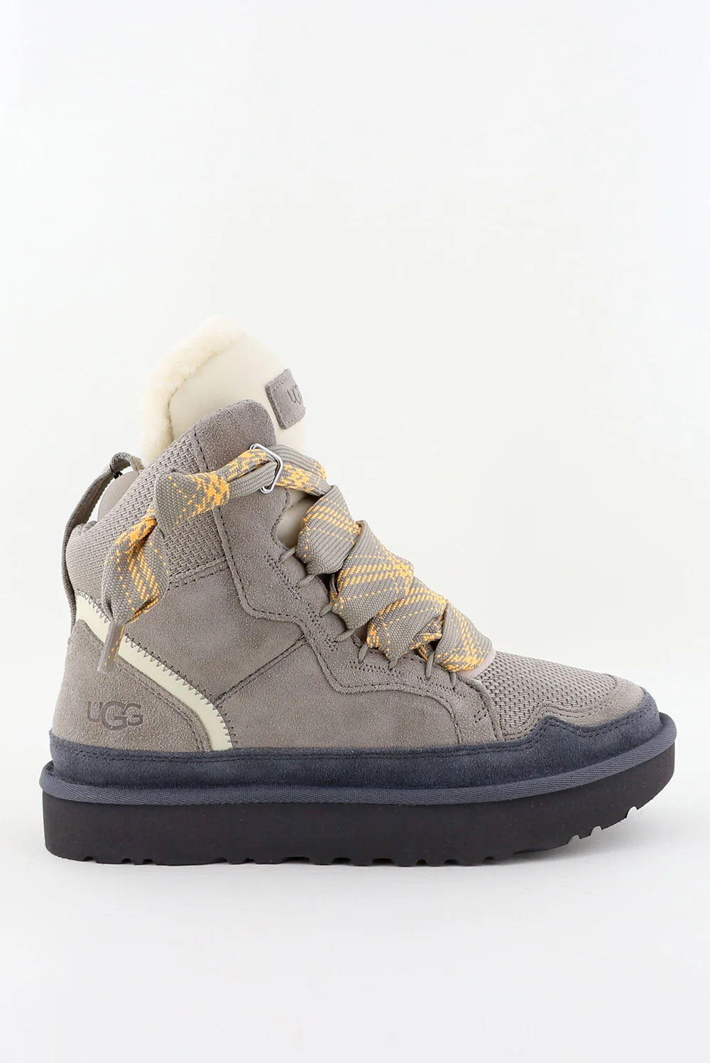 De UGG sneakers Highmel cobble grey vallen direct op door hun stoere vormen en zachte details. De combinatie van suĆØde en textiel geeft het bovenwerk een stevige, maar soepele look. Brede veters met een geel grijs ruitpatroon trekken subtiel de aandacht. De dikke zwarte zool met grof profiel zorgt voor grip en een sportievere uitstraling. Aan de enkelrand piept een zachte witte voering net boven het suĆØde uit, wat het geheel een warme touch geeft. Deze gevoerde sneakers vallen normaal op maat en voelen net zo comfortabel als je van UGG gewend bent. Liever een warmere tint? Kijk dan ook eens naar de UGG sneakers Highmel chesnut.