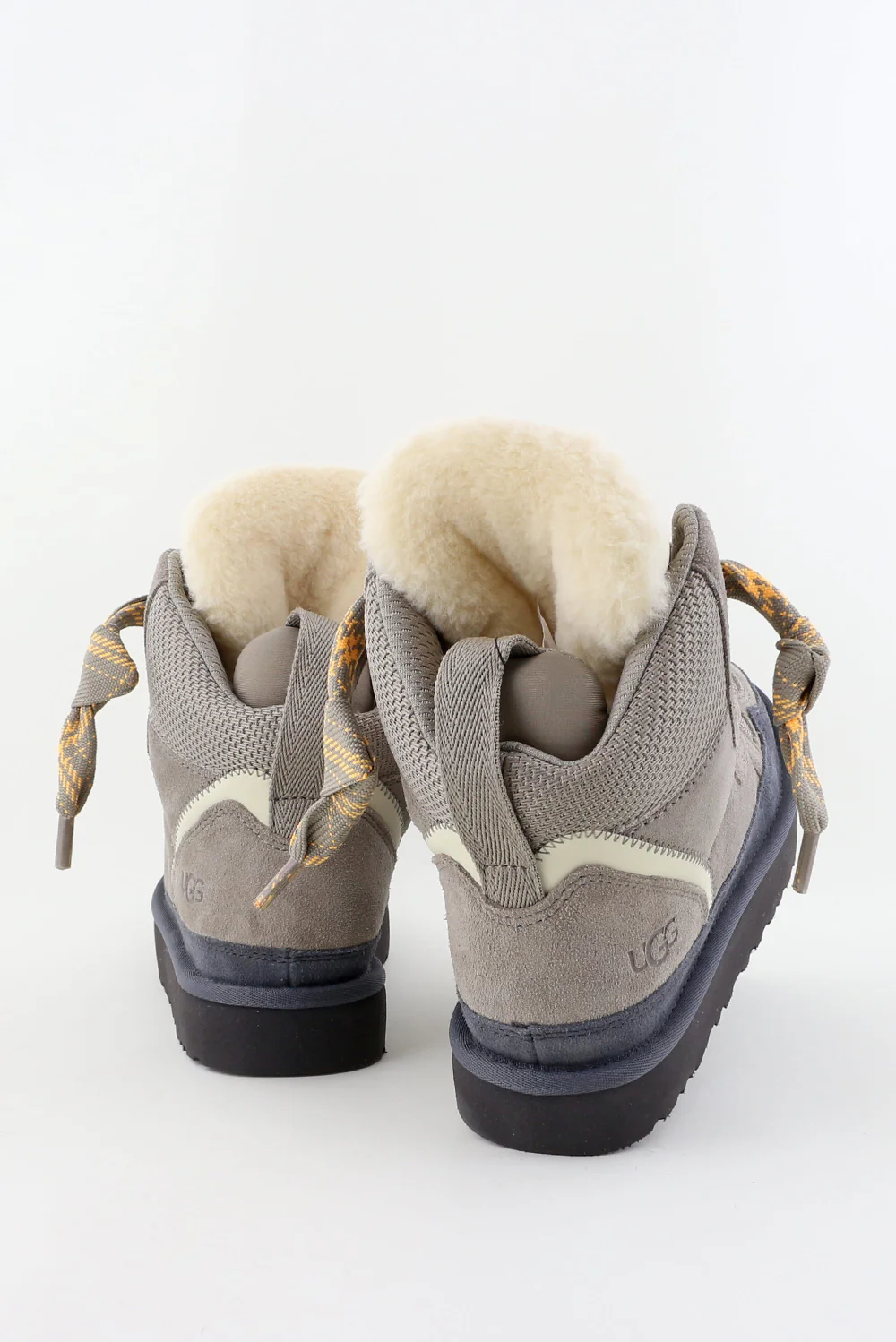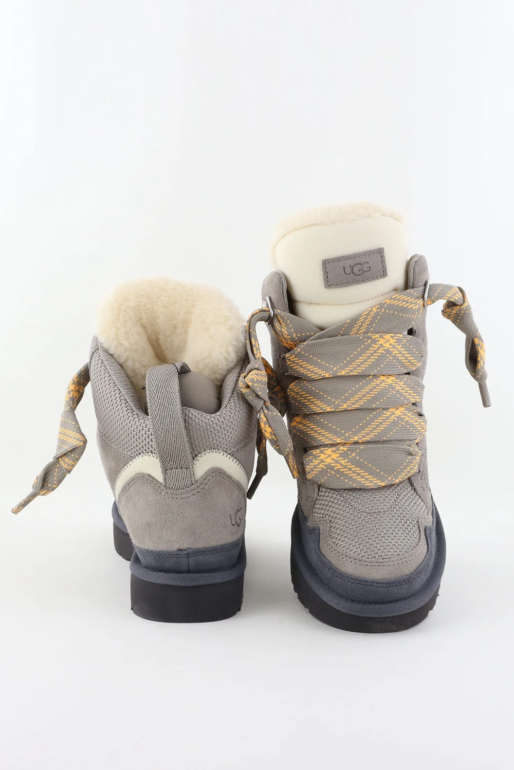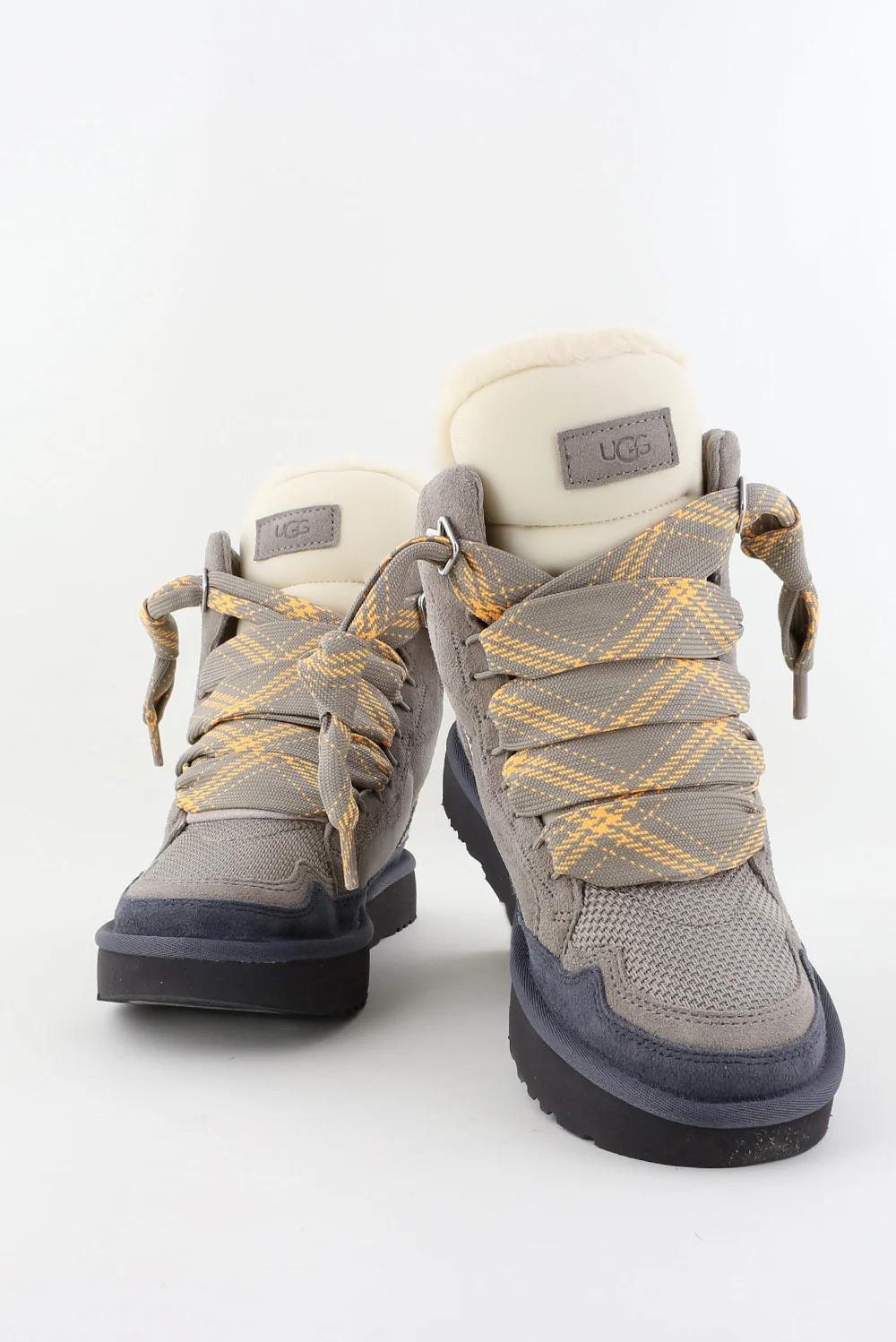 De UGG sneakers Highmel cobble grey vallen direct op door hun stoere vormen en zachte details. De combinatie van suĆØde en textiel geeft het bovenwerk een stevige, maar soepele look. Brede veters met een geel grijs ruitpatroon trekken subtiel de aandacht. De dikke zwarte zool met grof profiel zorgt voor grip en een sportievere uitstraling. Aan de enkelrand piept een zachte witte voering net boven het suĆØde uit, wat het geheel een warme touch geeft. Deze gevoerde sneakers vallen normaal op maat en voelen net zo comfortabel als je van UGG gewend bent. Liever een warmere tint? Kijk dan ook eens naar de UGG sneakers Highmel chesnut.