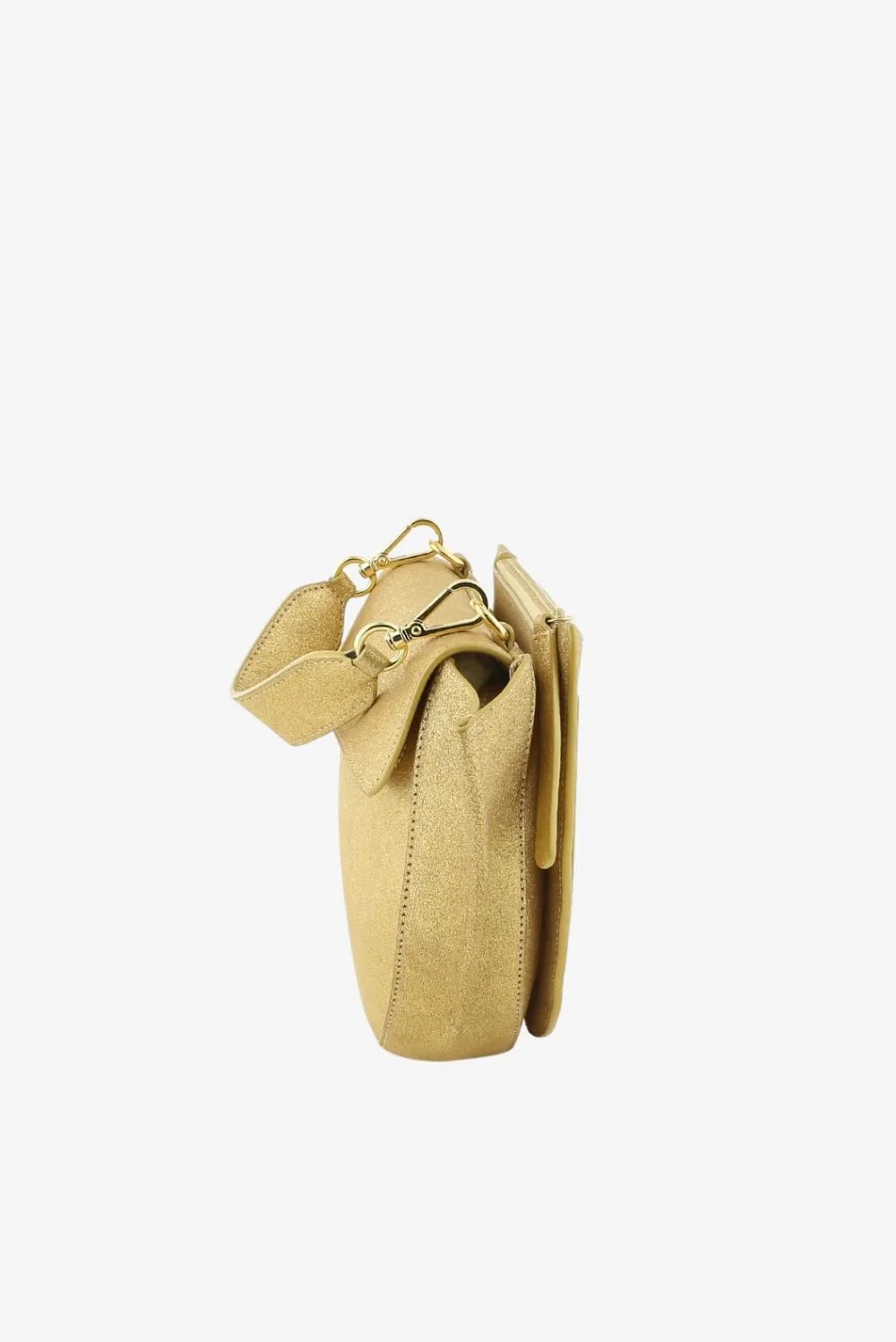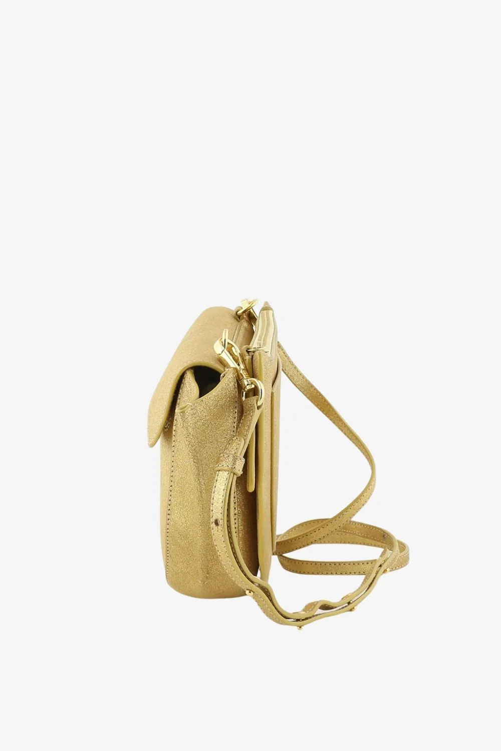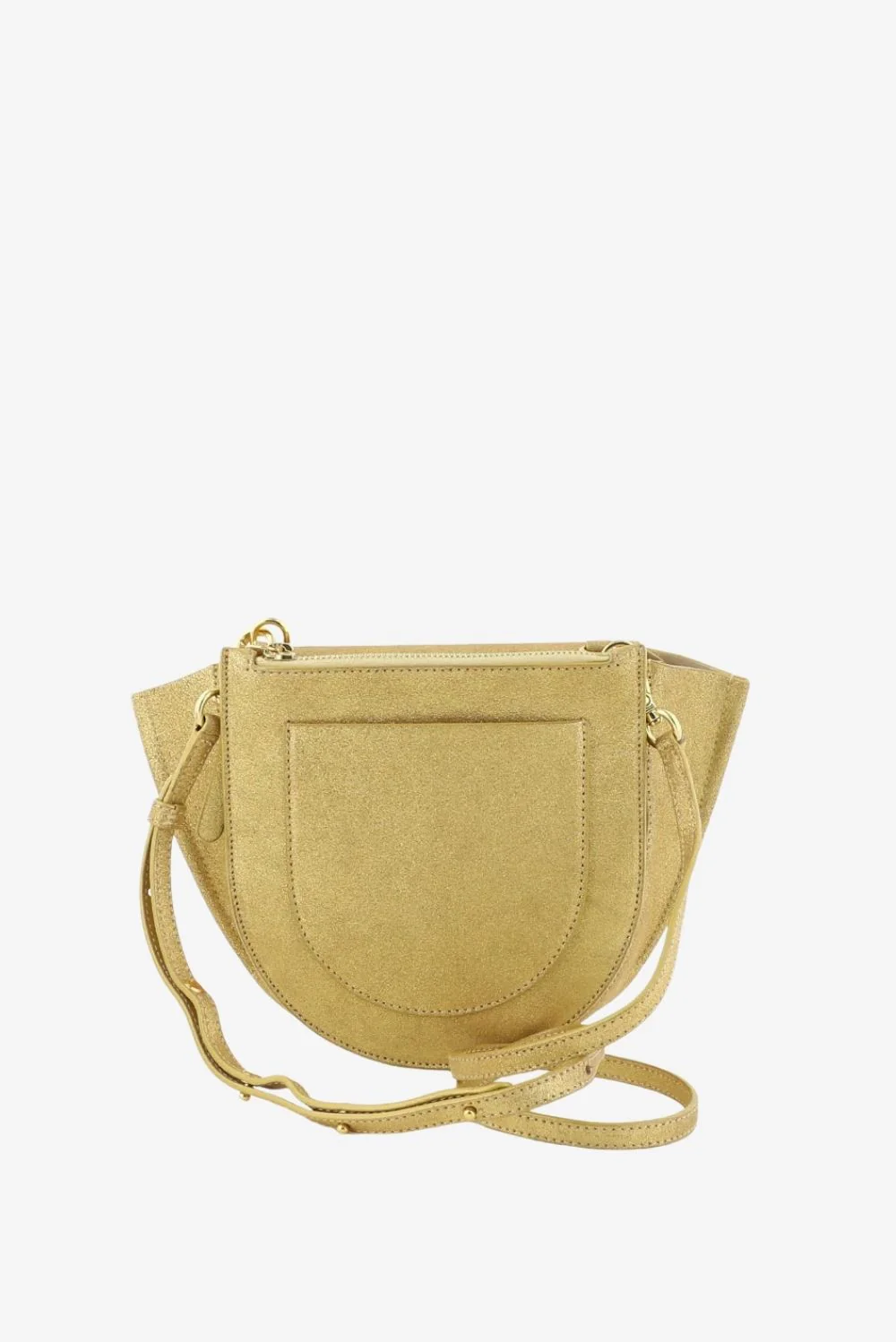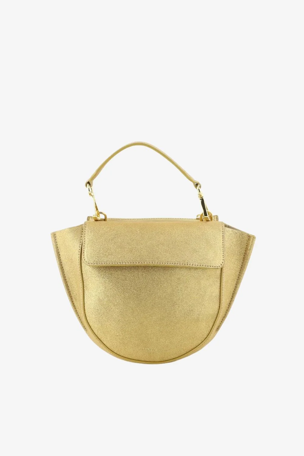 Dit is de crossbody Hortensia Mini sparkling gold van Wandler. De halfronde vorm met de recht afgesneden bovenkant geeft de tas een heldere lijn. Het goudkleurige leer heeft een zachte glans die het model mooi laat uitkomen. De korte hengsel ligt stevig in de hand en de verstelbare leren schouderriem maakt dragen eenvoudig en licht. De tas is compact maar stevig genoeg voor de dagelijkse essentials. De afwerking is Italiaans vakmanschap, herkenbaar aan de nette randen en de precieze bevestigingen. Wandler staat bekend om sculpturale vormen en sterke kleuren, en dat zie je duidelijk terug in deze Hortensia Mini.