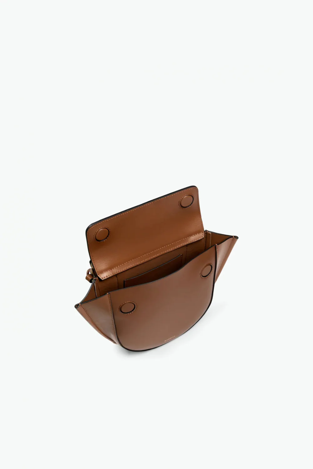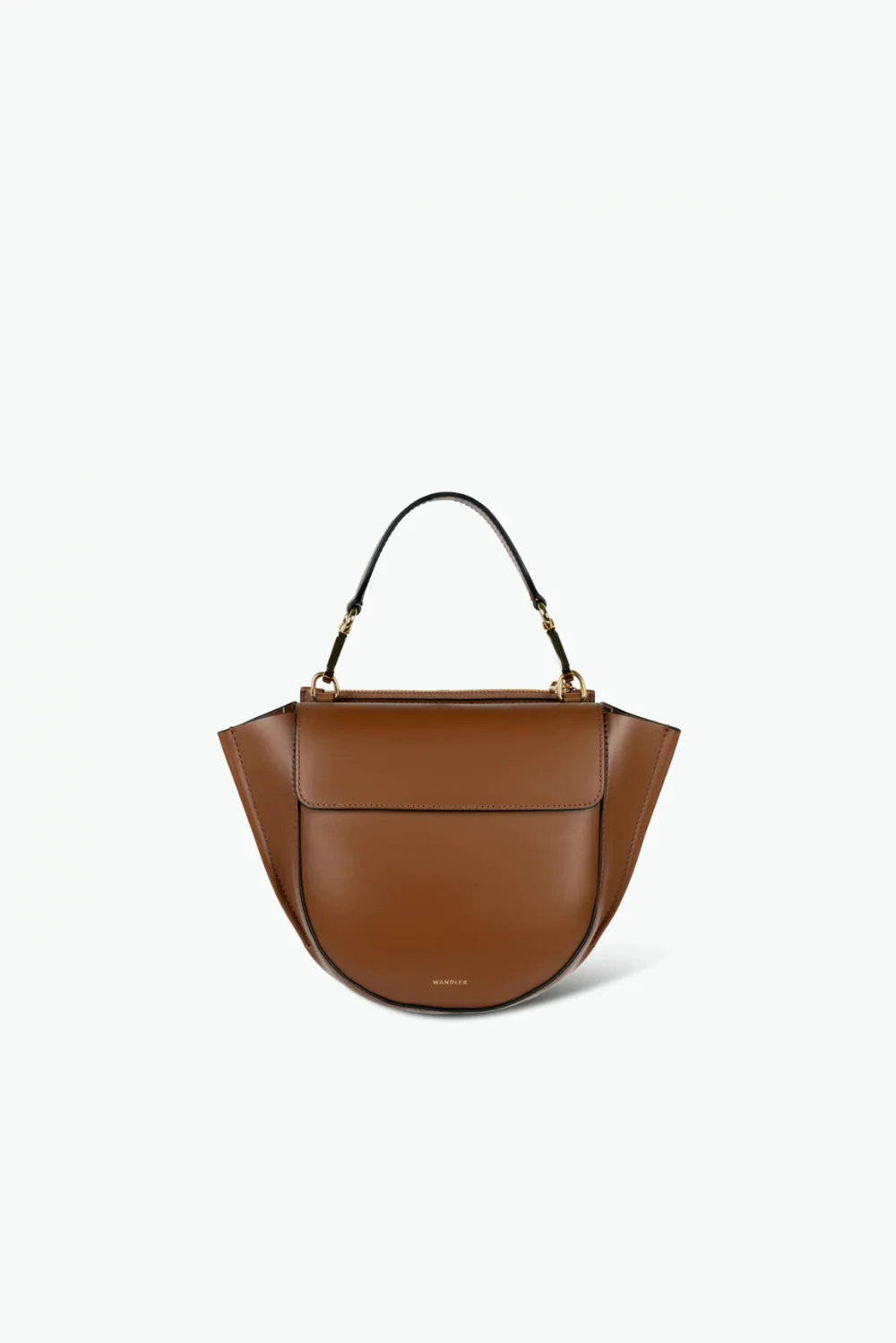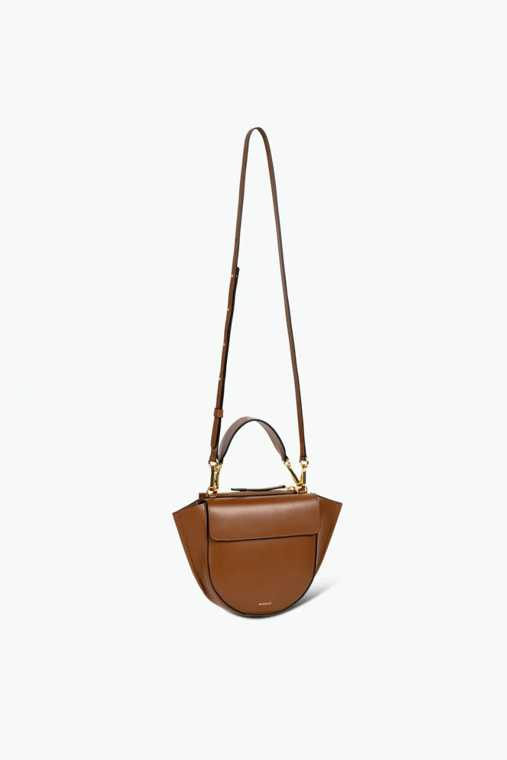 Dit is de Hortensia mini crossbody van Wandler, een compact model met de bekende halfronde onderkant en wijd uitlopende zijkanten. De tas is gemaakt van stevig kalfsleer dat mooi in vorm blijft en de kleur saddle geeft het geheel een warme, diepe tint. Het korte hengsel bovenop heeft goudkleurige details die het silhouet duidelijk omlijnen. Voorop staat Wandler subtiel in kleine letters. De sculpturale vorm is typisch voor het Nederlandse label, dat in Italië werkt met vakmanschap en nauwkeurige afwerking. Deze mini draagt licht en houdt de essentials overzichtelijk bij elkaar.
