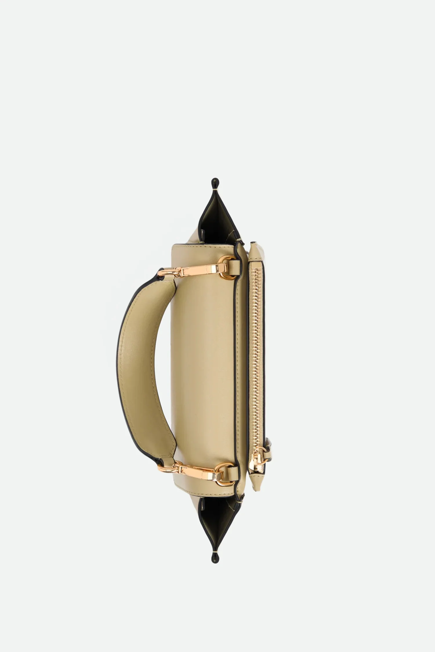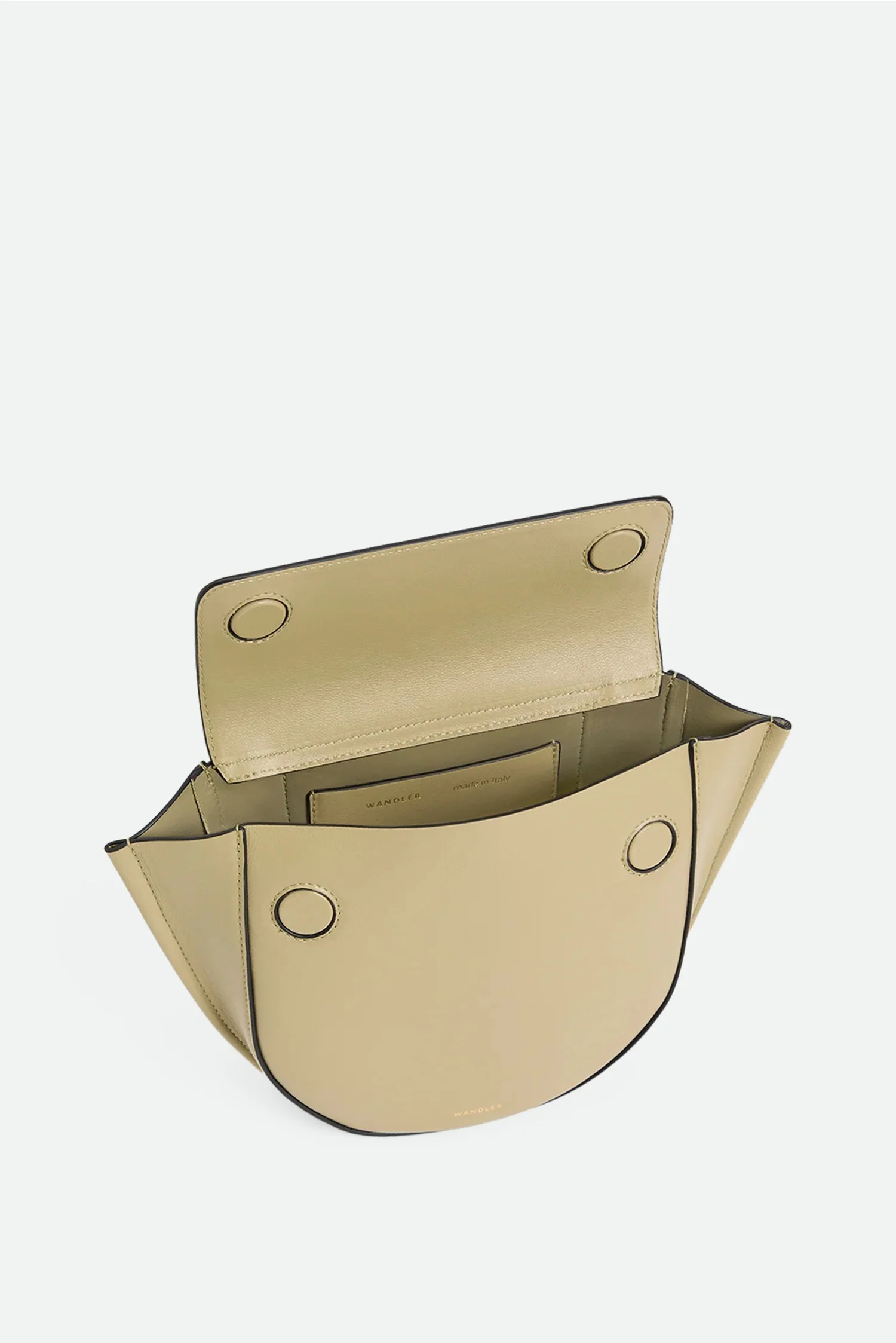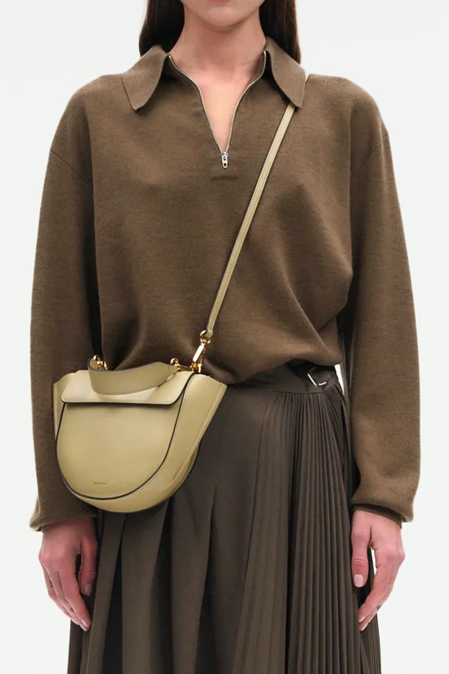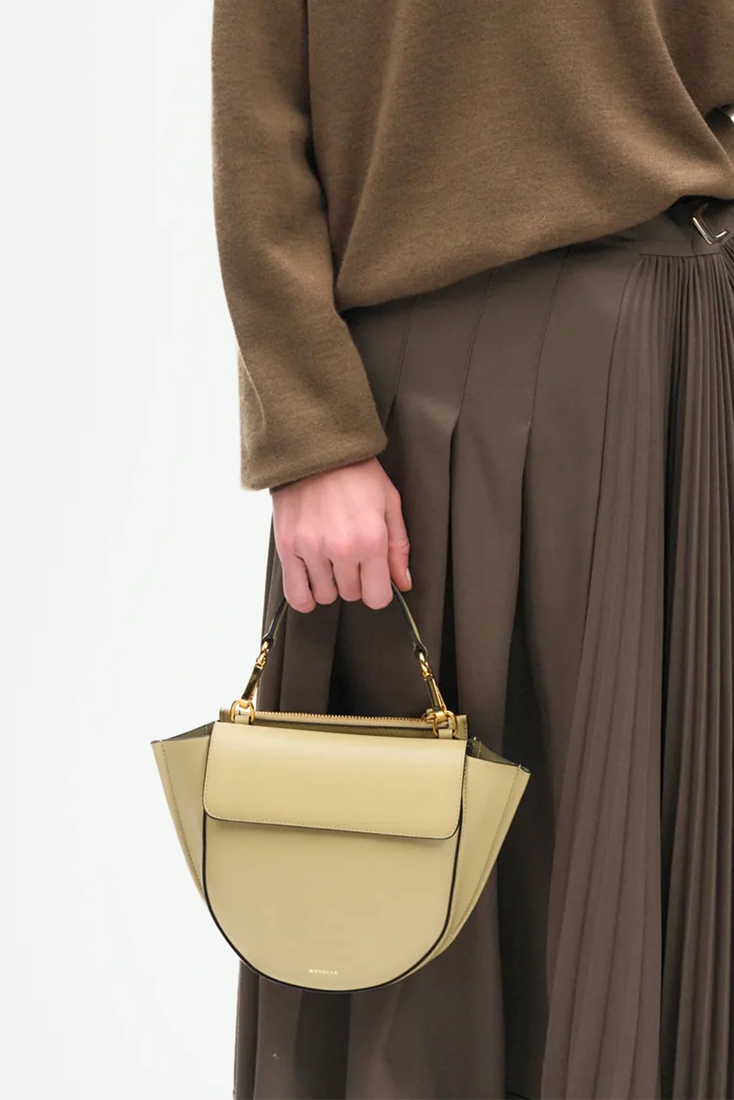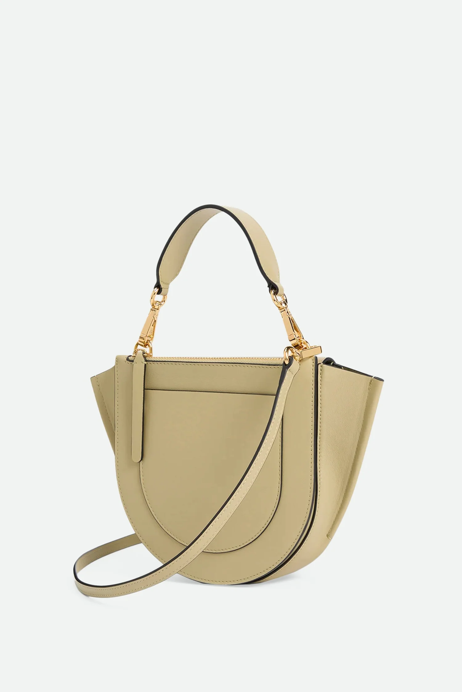 De Wandler crossbody Hortensia Mini in pepper is een compact ontwerp met een herkenbare halve cirkelvorm. De waaierachtige zijkanten geven de tas een grafische uitstraling, terwijl het contrasterende zwarte handvat met goudkleurige gespen zorgt voor een subtiel accent. Het soepele leer voelt stevig en luxueus, en de magneetsluiting sluit mooi aan bij de strakke lijnen van het ontwerp. De afneembare schouderband maakt het dragen flexibel, van handtas tot crossbody. Elke Hortensia wordt in Italië met de hand gemaakt, waarbij het vakmanschap duidelijk zichtbaar is in de afwerking.