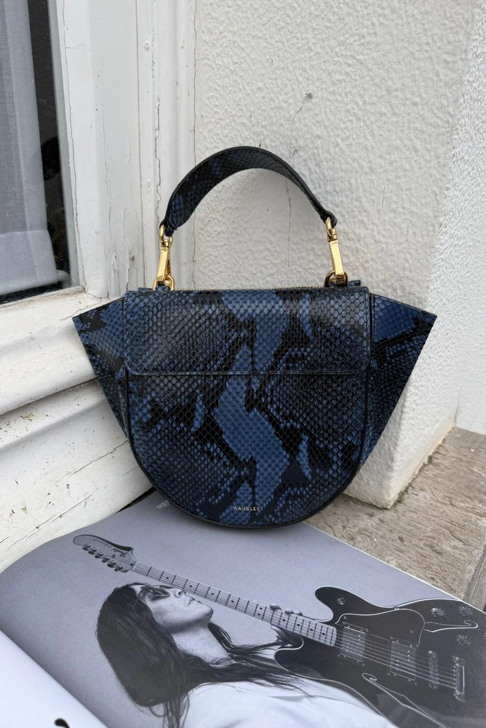 Hier zie je de Hortensia Mini van Wandler, een kleine crossbody met de herkenbare halfronde vorm en de uitstaande zijkanten. Het python geprinte leer in orion python geeft het donkerblauwe en zwarte patroon een duidelijke structuur die je meteen voelt. De tas draagt licht en blijft door de stevige vorm mooi in model. Je kunt haar op twee lengtes dragen dankzij het verstelbare hengsel met goudkleurige details. De magnetische sluiting klikt soepel dicht en houdt alles netjes op zijn plek. Zoals altijd bij Wandler is het kalfsleer zorgvuldig afgewerkt in Italië, waardoor de randen strak zijn en de vorm helder blijft.