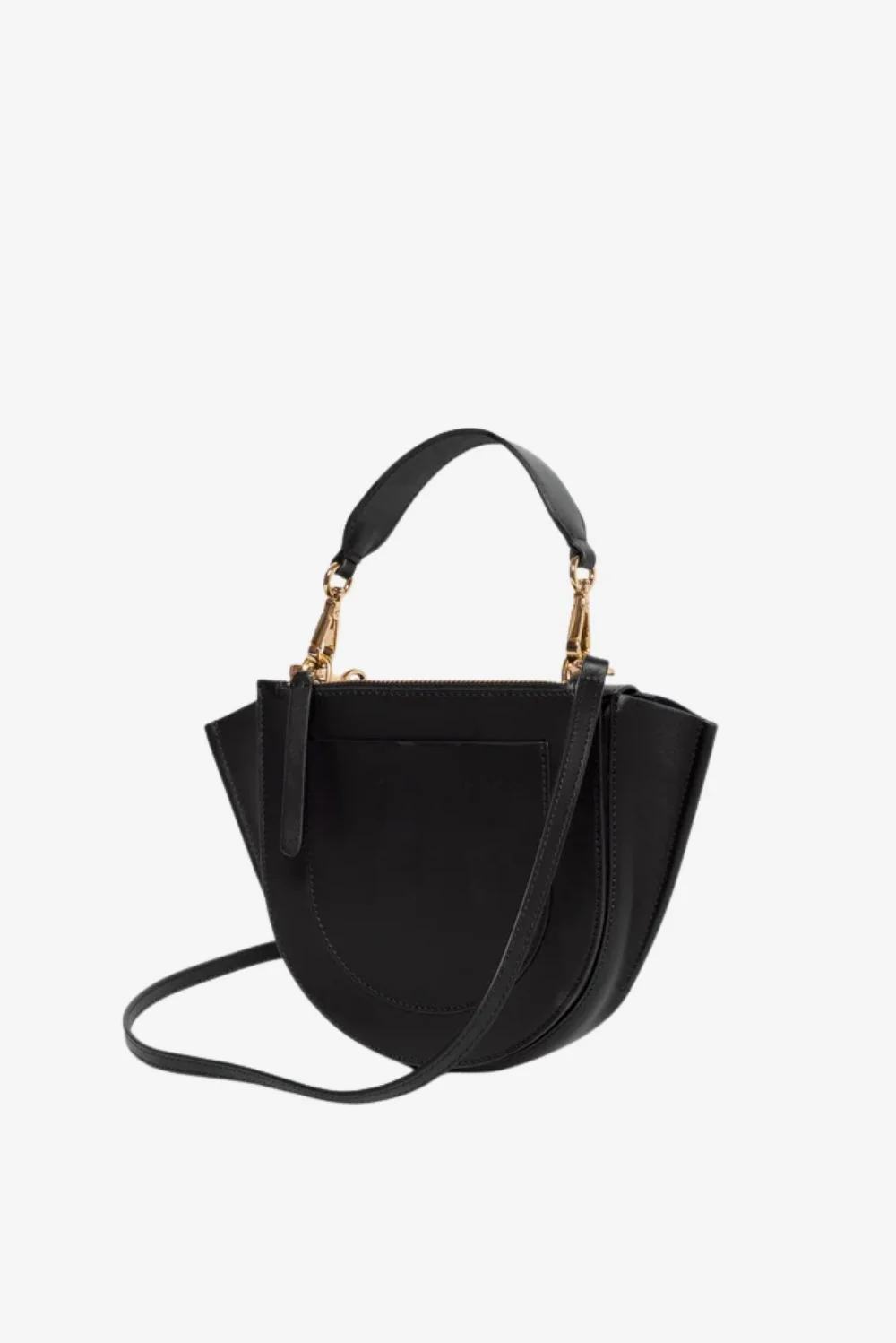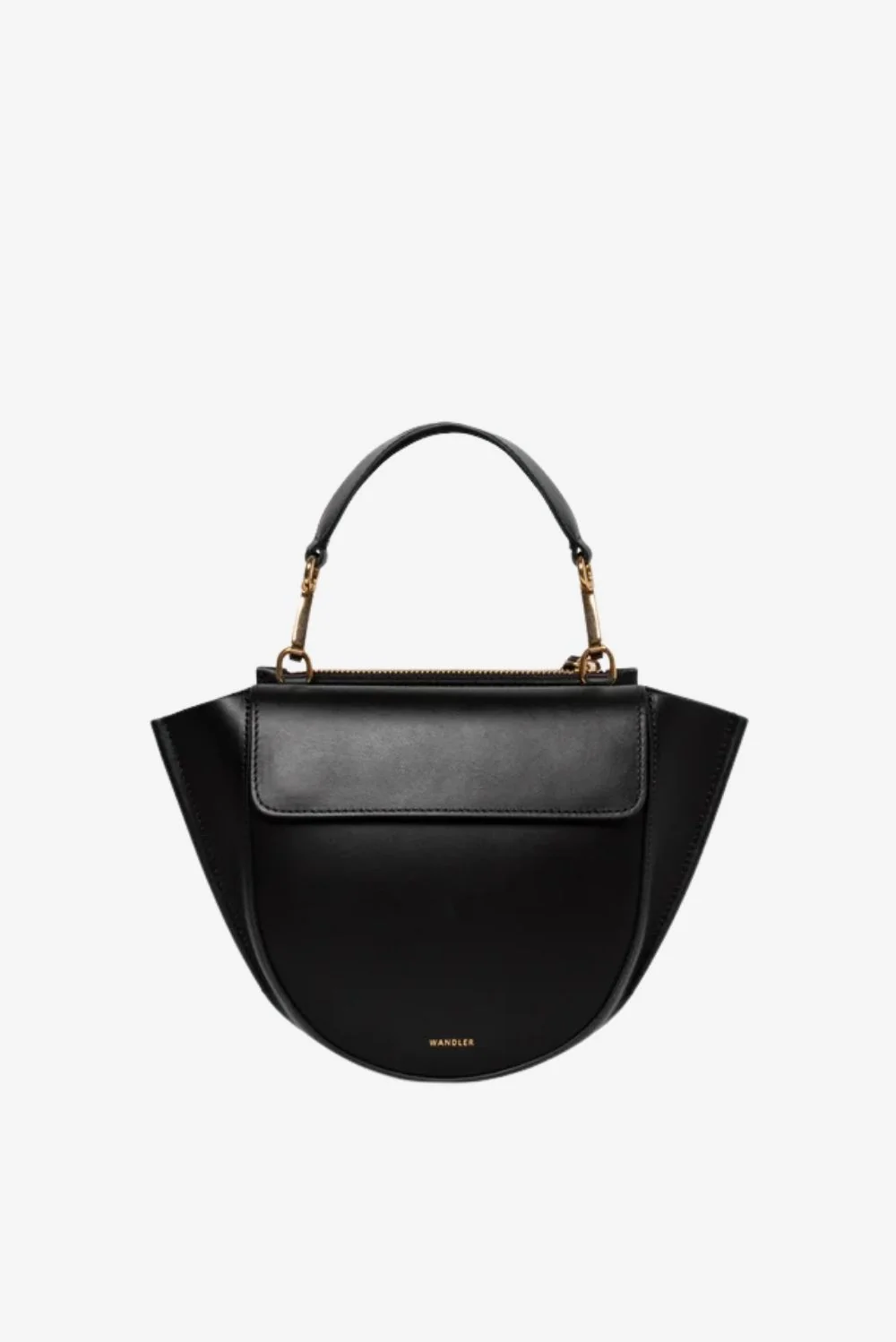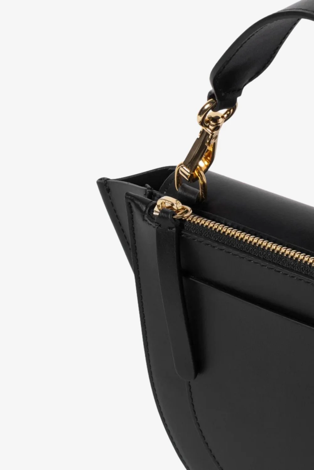 Dit is de crossbody Hortensia Mini van Wandler, een compacte tas met een halfronde vorm en strakke zijkanten. De brede flap sluit met een magneet en voelt stevig en precies aan. Daaronder zit een ritssluiting die alles binnenin extra netjes afsluit. Het leer is glad en stevig, waardoor de tas haar vorm mooi houdt. De zwarte kleur, door Wandler zelf black genoemd, maakt het silhouet nog helderder. Het handvat is bevestigd met goudkleurige accenten die het ontwerp een subtiel glanzend detail geven. Elke Hortensia wordt in Italië met de hand gemaakt, met aandacht voor de scherpe lijnen waar dit model om bekendstaat.